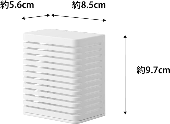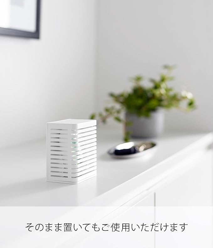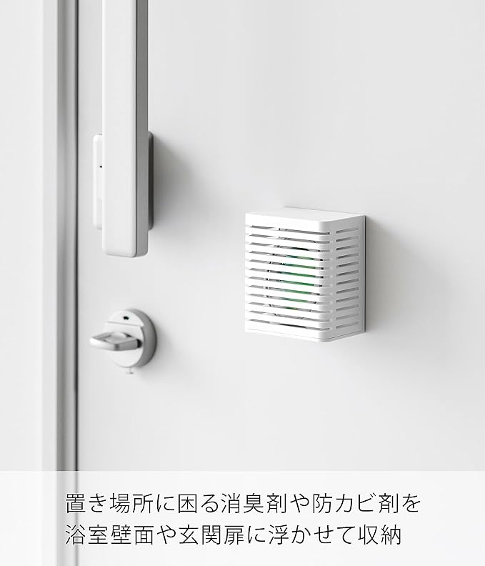 防カビ・消臭剤をマグネットで浮かせて設置 玄関、浴室、トイレなどで使用する、防カビ剤や消臭剤。そのまま置くと生活感が出やすいですが、ケースに収納して設置することでインテリアの一部にも。マグネットで浮かせて設置も可能なので、冷蔵庫横、玄関扉などマグネットがつくところにも便利。空間に馴染む2色のカラー カラーは清潔感のある「ホワイト」、落ち着いた雰囲気のインテリアに相性のいい「ブラック」の2色をご用意いたしました。シンプルなデザインなので、飽きることなく長く愛用できます。置いても、浮かせても。2通りの設置方法 設置方法はそのまま棚や床に置いて使用する方法と、マグネットを利用して浮かせる方法からお選びいただけます。玄関収納の中やトイレなどマグネットがつかない場所にはそのまま置いて、冷蔵庫横などにゴミ箱スペースがあるご家庭には冷蔵庫に取り付けて設置すればお掃除の際も邪魔になりません。スライド式のカバーで目立たせない 消臭剤などをケースに設置する際はカバーを上にスライドさせて設置してください。生活感が出やすいパッケージも目立ちにくくなり、玄関収納の上やお部屋のカウンターなどにそのまま置いておけます。すのこ状のトレーでこもらない トレー部分もすのこ状になっているので、消臭剤など蒸発した水滴がこもらない設計に。交換の時期がきてもべたべたしたケースを触らなくていいのが◎。