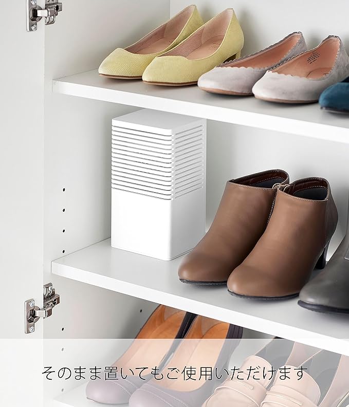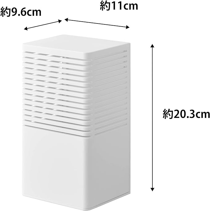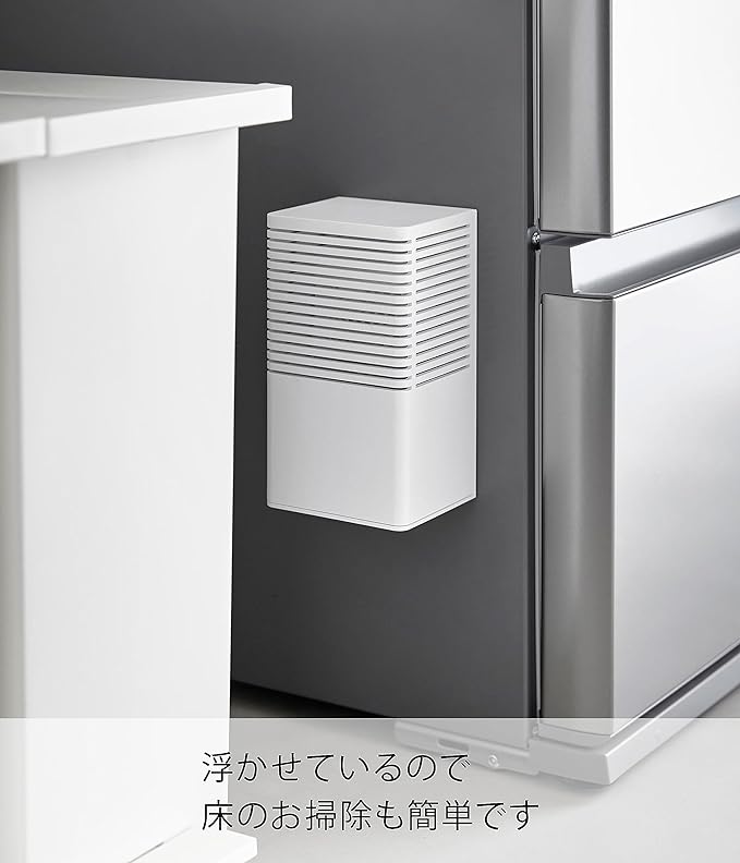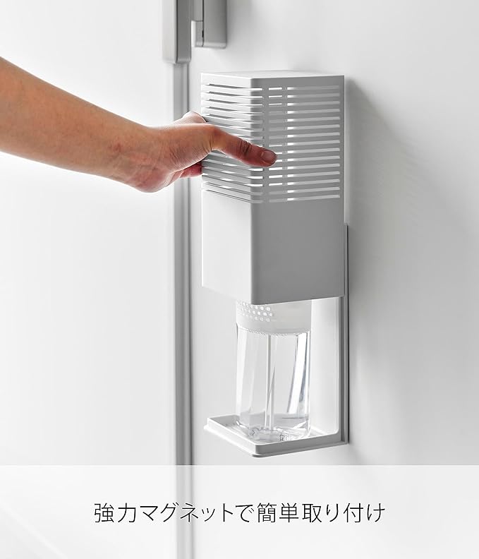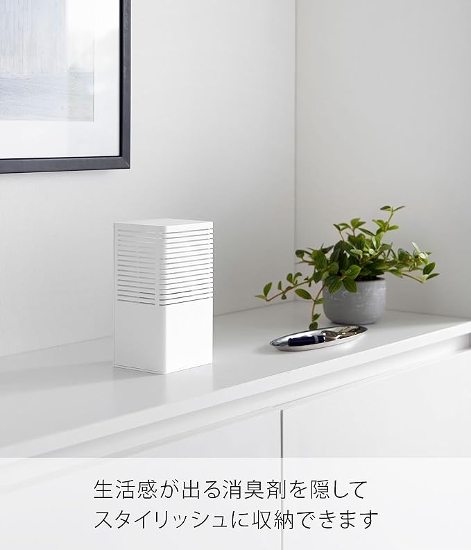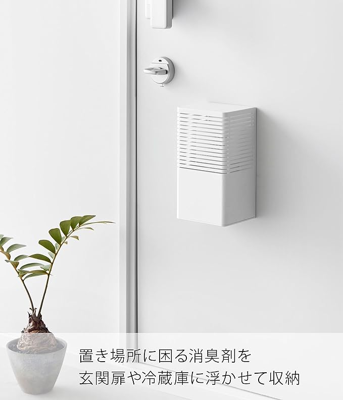 消臭剤をマグネットで浮かせて設置 玄関、トイレ、キッチンなどで使用する消臭剤。そのまま置くと生活感が出やすいですが、ケースに収納して設置することでインテリアの一部にも。マグネットで浮かせて設置も可能なので、冷蔵庫横、玄関扉などマグネットがつくところにも便利。空間に馴染む2色のカラー カラーは清潔感のある「ホワイト」、落ち着いた雰囲気のインテリアに相性のいい「ブラック」の2色をご用意いたしました。シンプルなデザインなので、飽きることなく長く愛用できます。特に匂いが気になる場所へ、大容量タイプに対応 嫌な匂いがこもりがちなシューズクロークや玄関、トイレ。消臭剤の大きさも大きめの大容量タイプを置きたくなりますよね。「マグネット消臭剤ケース L」は幅10×奥行8.2×高さ19.6cmまでの消臭剤に対応しています。大きめタイプを使用することで交換も少なくすむのも◎。置いても、浮かせても。2通りの設置方法 設置方法はそのまま棚や床に置いて使用する方法と、マグネットを利用して浮かせる方法からお選びいただけます。玄関収納の中やトイレなどマグネットがつかない場所にはそのまま置いて、冷蔵庫横などにゴミ箱スペースがあるご家庭には冷蔵庫に取り付けて設置すればお掃除の際も邪魔になりません。スライド式のカバーで目立たせない 消臭剤などをケースに設置する際はカバーを上にスライドさせて設置してください。生活感が出やすいパッケージも目立ちにくくなり、玄関収納の上やお部屋のカウンターなどにそのまま置いておけます。