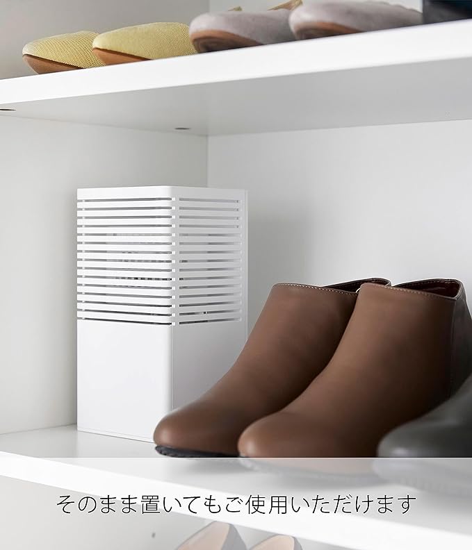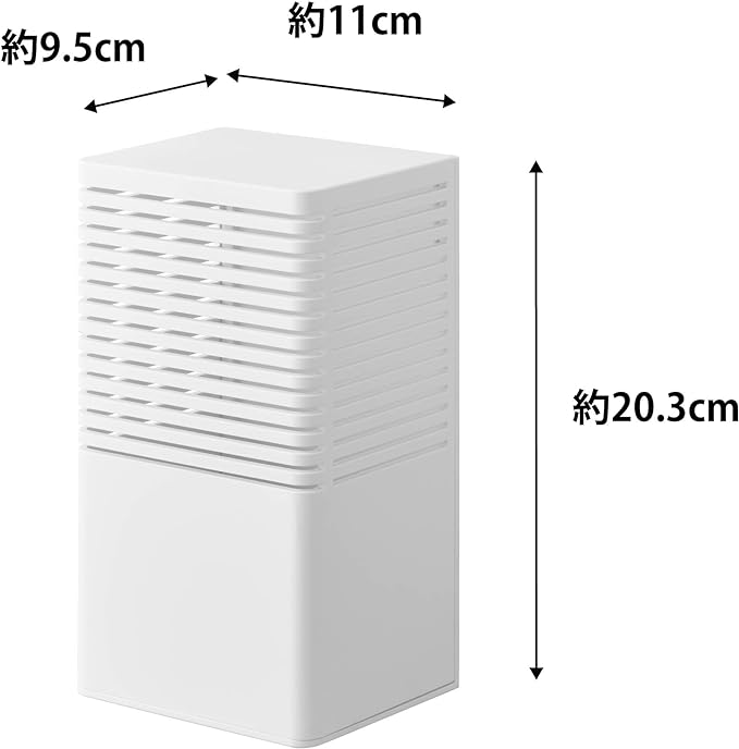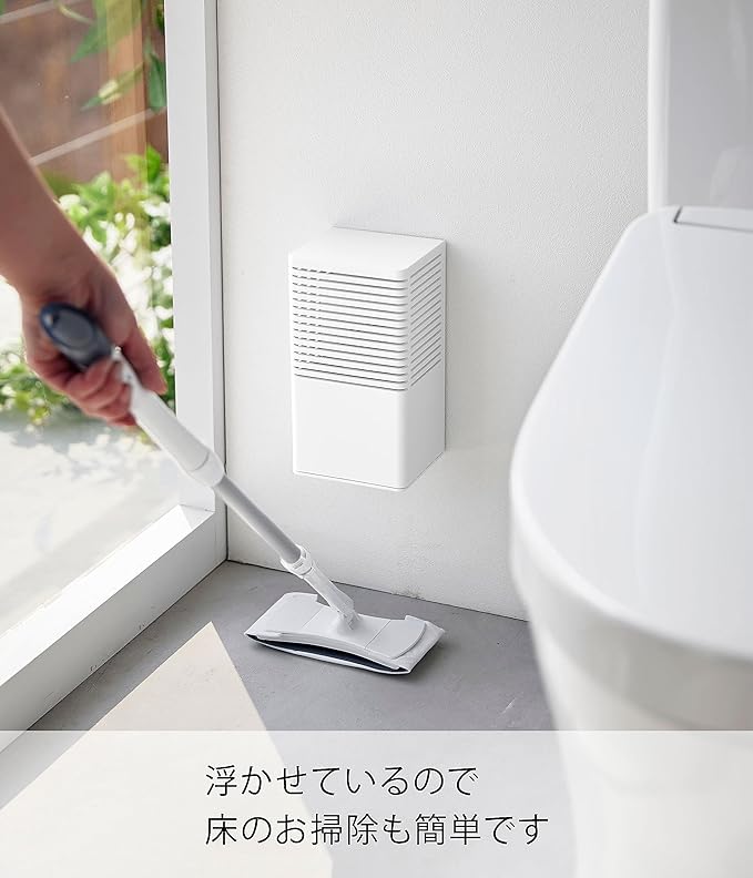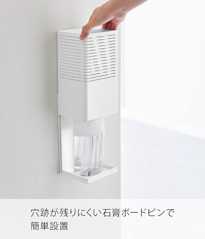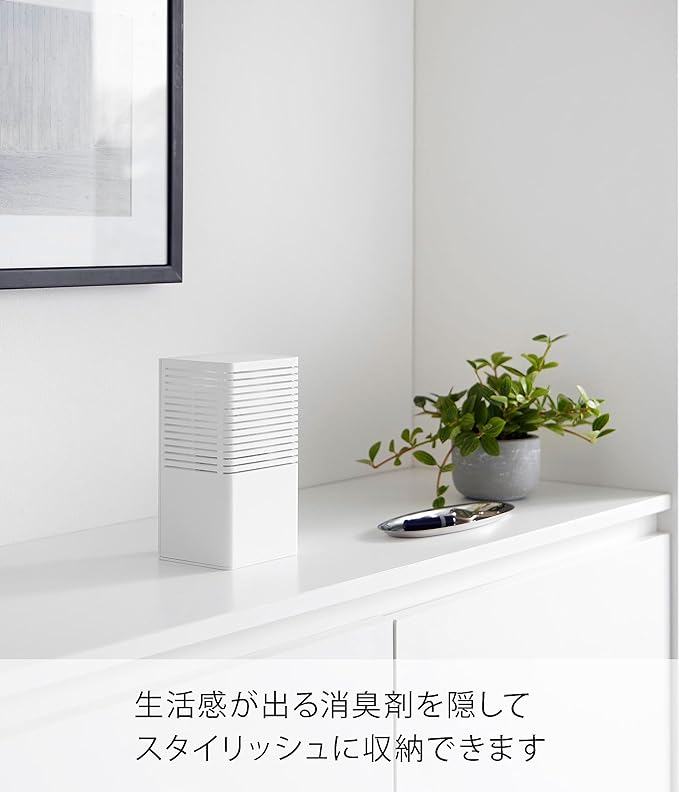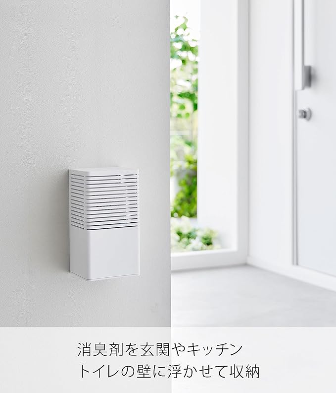 大容量の消臭剤を壁に浮かせて設置 玄関、トイレ、キッチンなどで使用する消臭剤。そのまま置くと生活感が出やすいですが、ケースに収納して設置することでインテリアの一部にも。壁に浮かせて設置も可能なので、お掃除の際にも邪魔にならないのが魅力。空間に馴染む2色のカラー カラーは清潔感のある「ホワイト」、落ち着いた雰囲気のインテリアに相性のいい「ブラック」の2色をご用意いたしました。シンプルなデザインなので、飽きることなく長く愛用できます。特に匂いが気になる場所へ、大容量タイプに対応 嫌な匂いがこもりがちなシューズクロークや玄関、トイレ。消臭剤の大きさも大きめの大容量タイプを置きたくなりますよね。「マグネット消臭剤ケース L」は幅10×奥行8.2×高さ19.6cmまでの消臭剤に対応しています。大きめタイプを使用することで交換も少なくすむのも◎。置いても、浮かせても。2通りの設置方法 設置方法はそのまま棚や床に置いて使用する方法と、壁に固定して浮かせる方法からお選びいただけます。玄関収納の上やゴミ箱スペースなど目立たない場所にはそのまま置いて、トイレは浮かせて設置することで床掃除が断然しやすくなるので浮かせる収納がおすすめ。柱がなくてもOK。石こうボードに取り付け 取り付け方法は、付属の石こうボードピンまたは木ネジで取り付けをしてください。柱や板壁がない場所でも石こうボードピンを使用すれば壁紙がついた場所に取り付けが可能です。穴跡が目立ちにくいメリットもあり賃貸の方にもおすすめです。※柱や板壁に取り付けの場合は木ネジを使用してください。