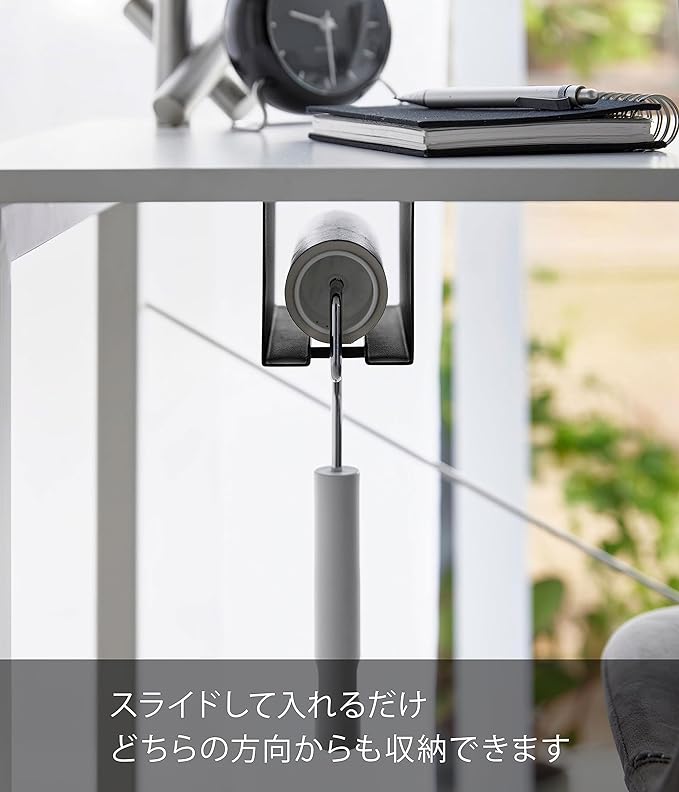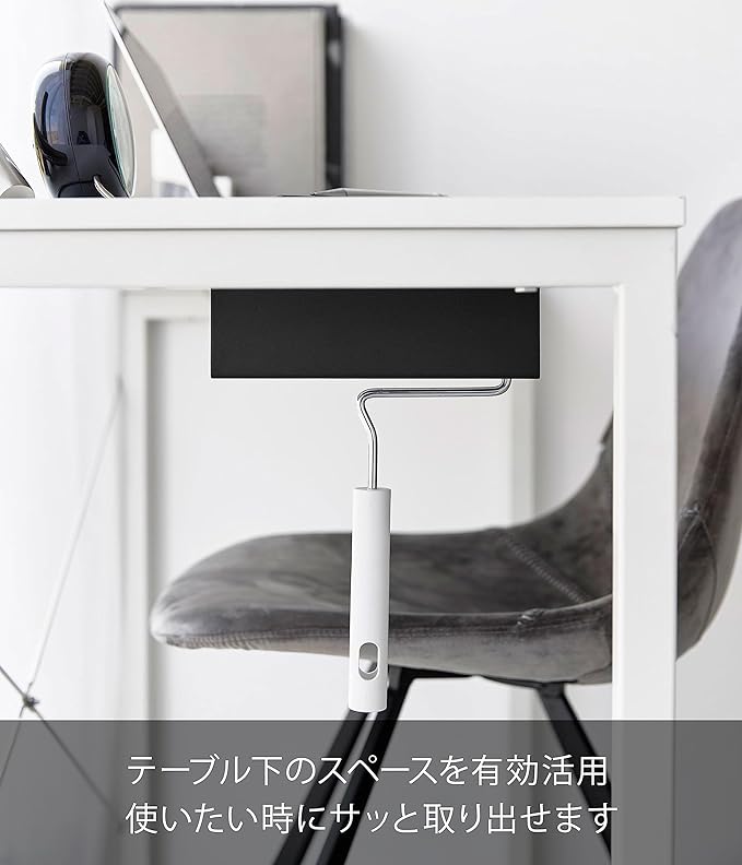 置き場所に困るカーペットクリーナーをテーブル下に隠して収納。テーブル下のスペースを有効活用。使いたいときにサッと使えます。お出かけ前後にほこりや花粉をサッとお手入れ。ネジ留めなのでしっかり固定できます。カーペットクリーナーの粘着面にほこりが付きにくい構造。スライドして入れるだけ。どちらの方向からでも収納できます。
