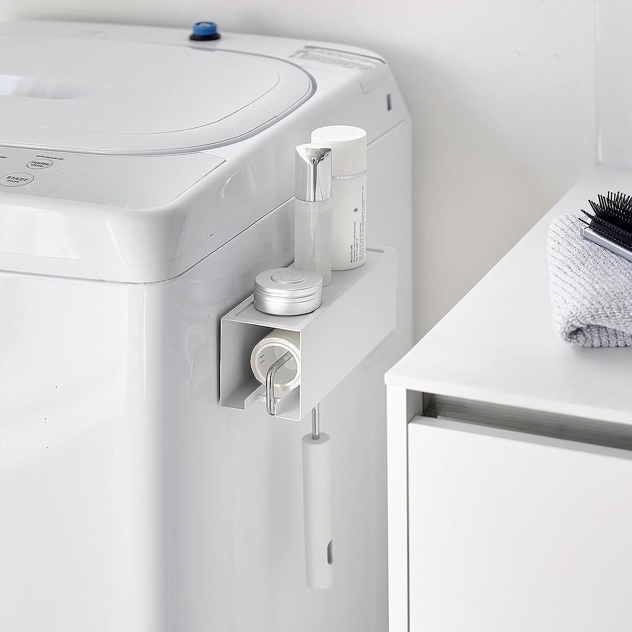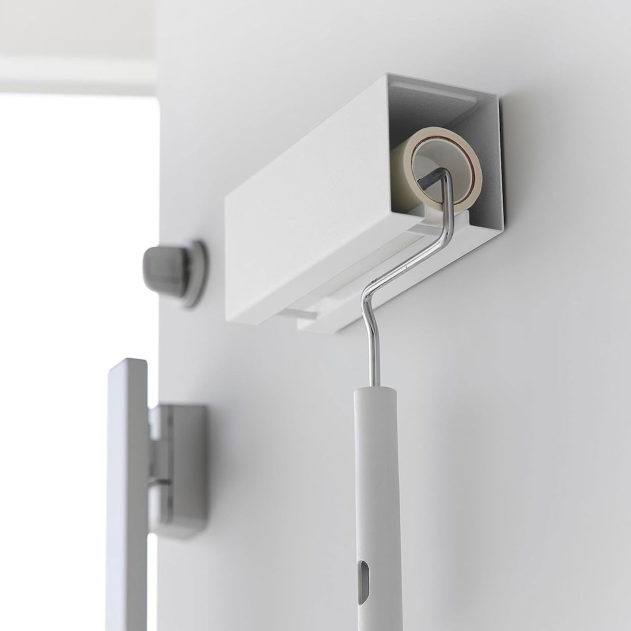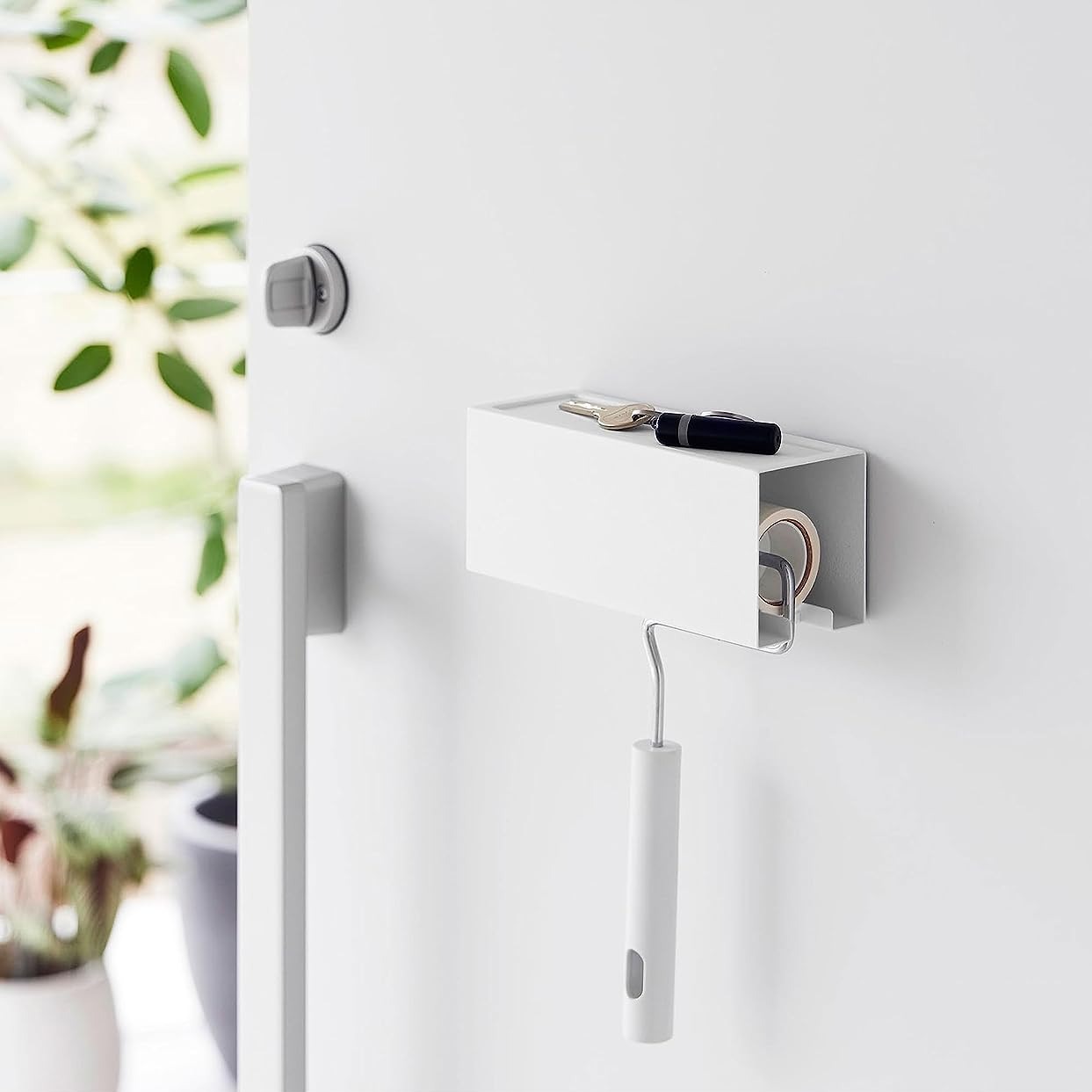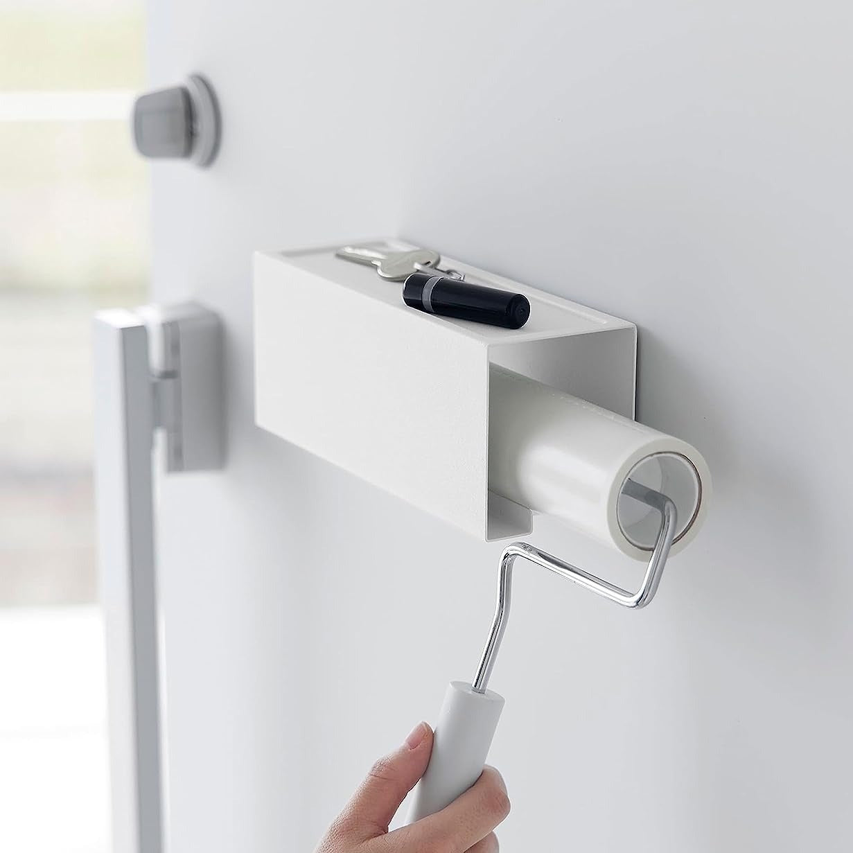 いつでも手に取りやすい、浮かせる粘着ホルダー 使用頻度が高く置き場所に困りがちな粘着カーペットクリーナーを、マグネットの力で浮かせて収納するホルダーです。玄関扉、冷蔵庫横、洗濯機側面などマグネットがつく平らな面に取り付けるだけなので、穴を開ける必要や工具も不要です。いつでも手に取りやすい場所に収納することで、掃除のハードルを抑えてくれるアイテムです。※ホルダーのみの販売となります。カーペットクリーナーは付属しておりません。別途ご用意ください。インテリアになじむ、マットなモノトーンカラー マグネットクリーナーホルダーのカラーは、ホワイト、ブラックの2色をご用意いたしました。シンプルで洗練されたデザインとマットな質感のスチール製なので、見える位置に設置してもインテリアによくなじみます。インテリアや家具、好みに合わせてお選びいただけます。設置と出し入れがしやすい左右スライド ホルダーは左右どちらからでも使用可能です。横にスライドするだけで出し入れできるので、利き手や設置位置を気にする必要がありません。掃除道具の定位置が決まることで紛失防止に役立てながら、家族間で共有しやすくなるのが嬉しいポイント。小物が置けるトレー付き ホルダー上部には500gまで小物を置けるトレーになっています。玄関扉に設置した場合は鍵や印鑑、洗濯機横の隙間を有効活用した場合は外したアクセサリーや洗濯ばさみなどの一時置きにぴったりです。ホルダーの背面には強力マグネット+滑り止めが付いているので、好きな位置に強固に設置ができます。ロングタイプもスッキリ安定収納 マグネットの力で設置するから、存在感が出がちな柄の長い粘着カーペットクリーナーも設置可能です。ソファや壁にもたれかけずに浮かせて収納することで、スッキリとした印象を与えてくれます。サッと取り出せるから、毎日少しの時間でできるお掃除習慣にもつながります。