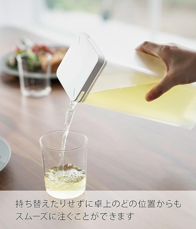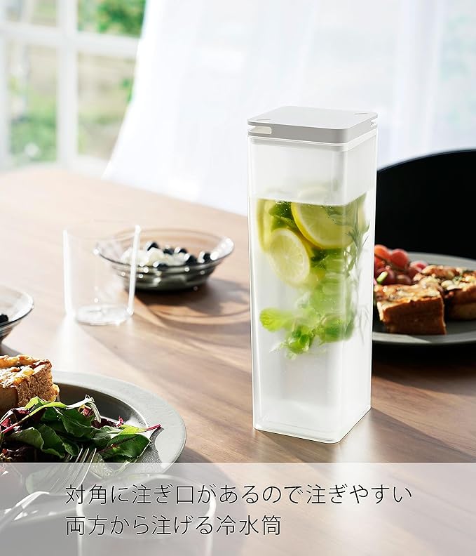 対角に注ぎ口があるので注ぎやすい。両方から注げる冷水筒。対角に注ぎ口があるので、持ち替えたりせず卓上のどの位置からもスムーズに注ぐことができます。冷蔵庫のドアポケットにも収納しやすい角型。パーツは蓋だけ。洗いやすいシンプルな構造でお手入れが簡単です。食器洗い乾燥機は70~80℃以内のものに対応。必ず食器洗い乾燥機の説明書をご参照ください。冷水専用です。熱湯を直接入れないでください。加熱したお茶を入れる場合は、必ず常温程度に冷まして入れてください。