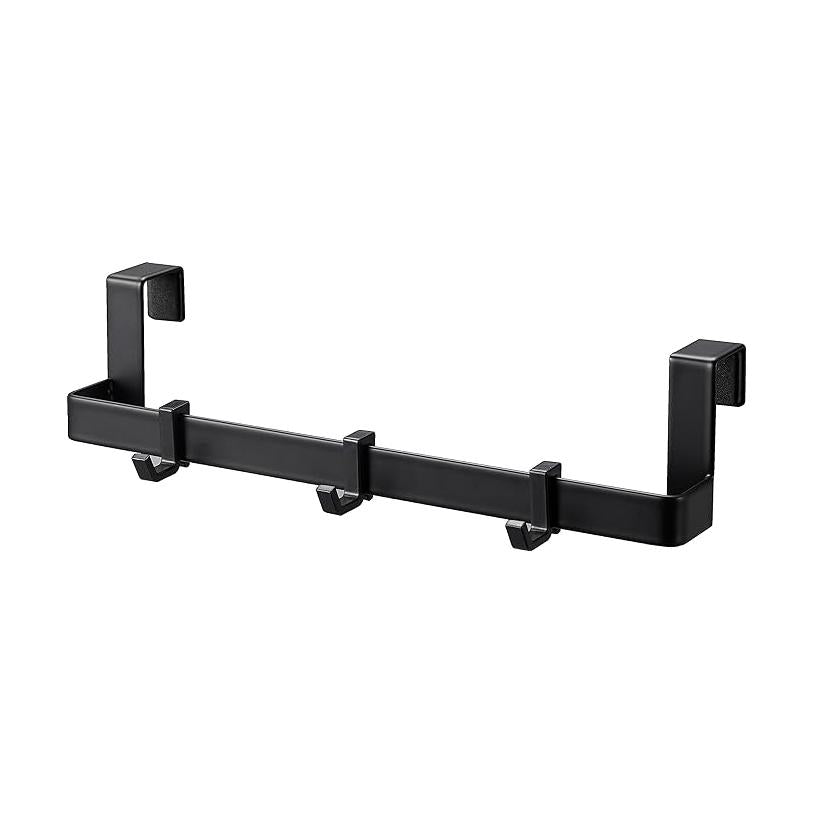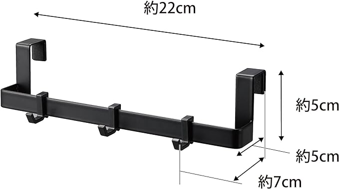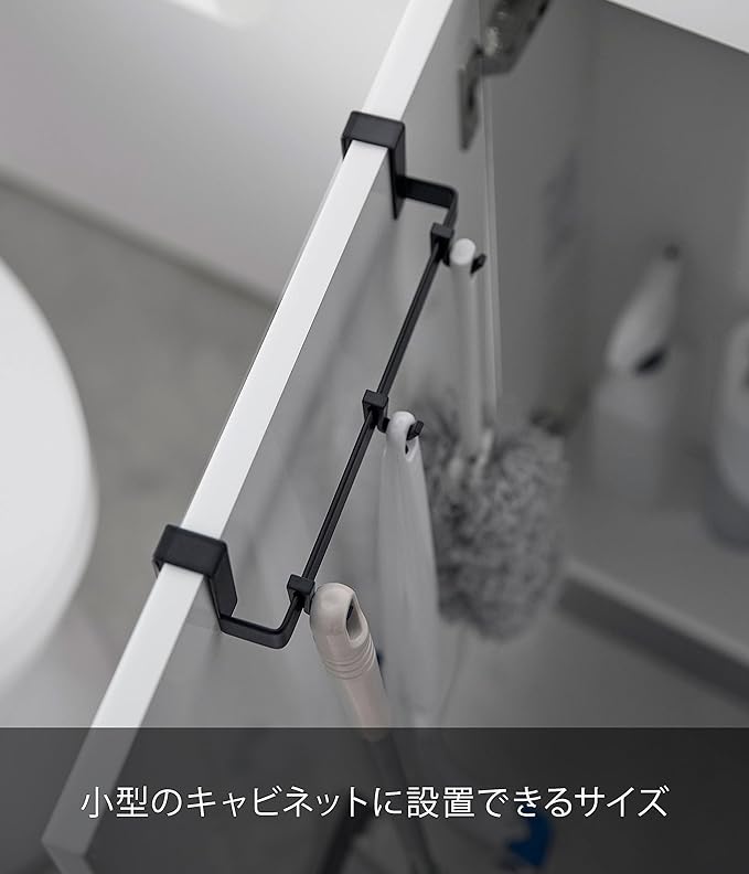 扉の外側にも内側にも設置できる便利な掃除アイテム収納ハンガー。手に取りやすい位置に掃除アイテムを掛けることができます。タオル掛けとしても使えます。隠したい掃除アイテムをキャビネットの内側に収納できます。小型のキャビネットに設置できるサイズです。取り外し可能なフック付き。