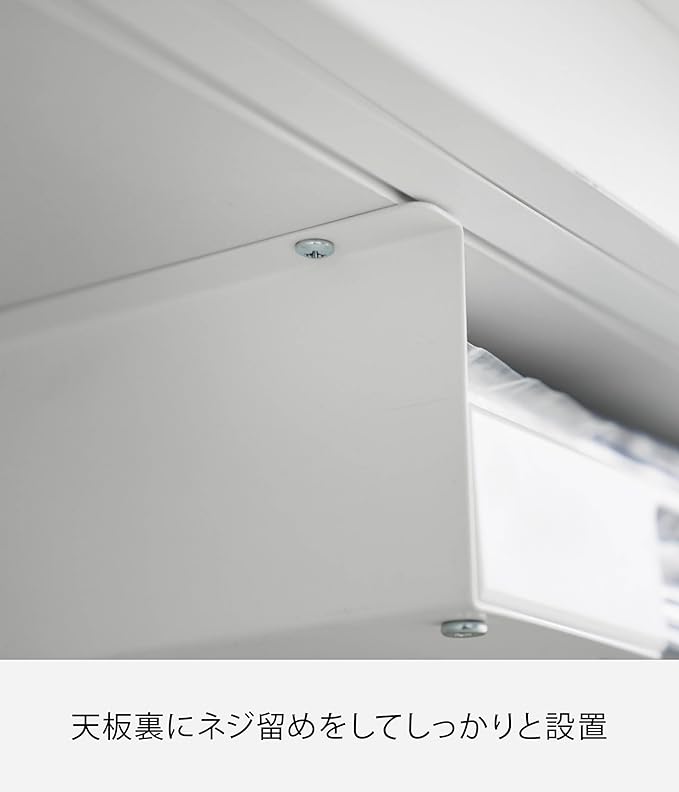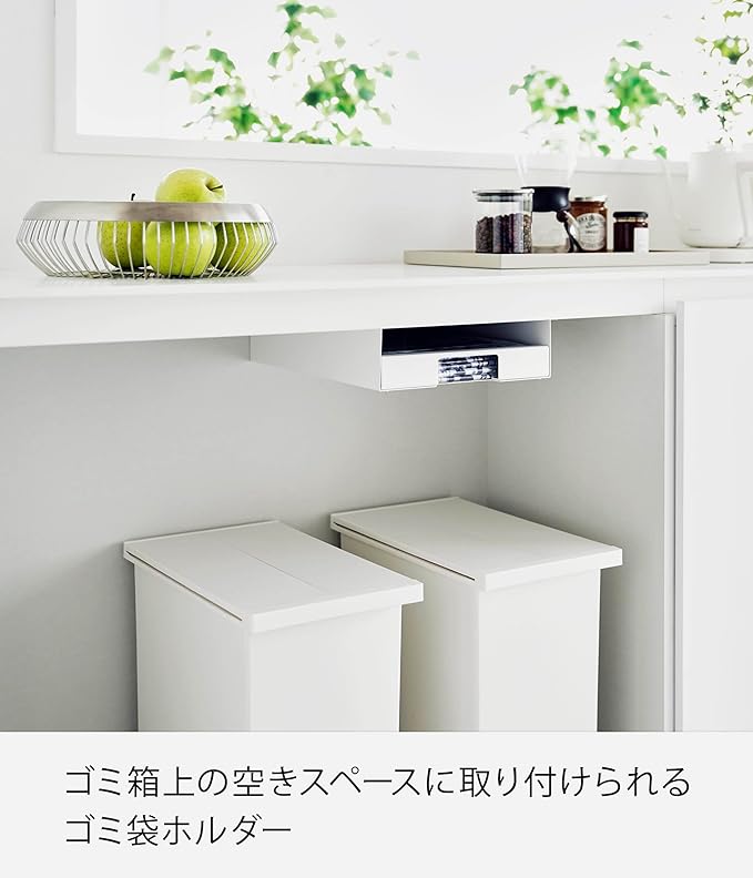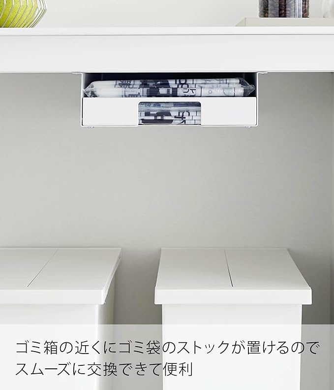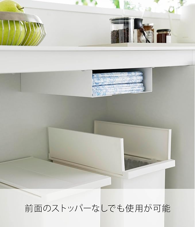 ゴミ袋の収納はゴミ箱上のスペースを利用して ゴミ袋のストック場所、みなさんはどこに置いていますか?なるべく、ゴミ箱の近くにしたいけどスペースがなく、引き出しの中など少し離れた場所にストックされている場合も…。『キッチン棚下ゴミ袋ホルダー』は意外と持て余しているゴミ箱とキッチンカウンターなどの棚下のフリースペースを活用して設置できるので、ゴミ袋を変える際も移動することなく、すぐに付け替えが可能になります。シンプルな2色のカラー カラーは、ホワイトとブラックの2種からお選びいただけます。シンプルな色とデザインで、圧迫感を感じさせません。ゴミ箱の色に合わせて選択するのもおすすめです。1枚ずつ取り出せてストレスフリー ゴミ袋を取り出す際に、余分にでてきてしまいケースや袋に戻すのが面倒に。こちらのゴミ袋ホルダーは手前にストッパーが付いていることで1枚ずつをサッとストレスなく取り出せます。また、ストッパー上部は空いているので、そこから補充することも可能。ストッパーを外してらくらく補充 ホルダーについたストッパーを外せばゴミ袋の補充もらくに。ストッパーがあることで1枚ずつ取り出しができますが、袋の種類や材質によって取り出しにくい場合はストッパーを外して使用するのも◎。ネジ固定で動かない 棚下の天板にネジでしっかりと固定することで、使用のたびに動いたり、落ちたりすることはありません。天板が木製・積層合板製で厚さが1.5cm以上あり天板裏のW28×D37cm以内に干渉する柱や脚がない天板に取り付けが可能です。※天板裏に幕板(脚と脚をつないでいる板)がある場合、あらかじめ袋の出し入れの際に干渉しない位置をご確認ください。