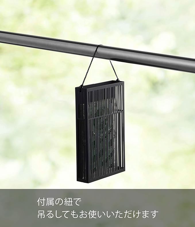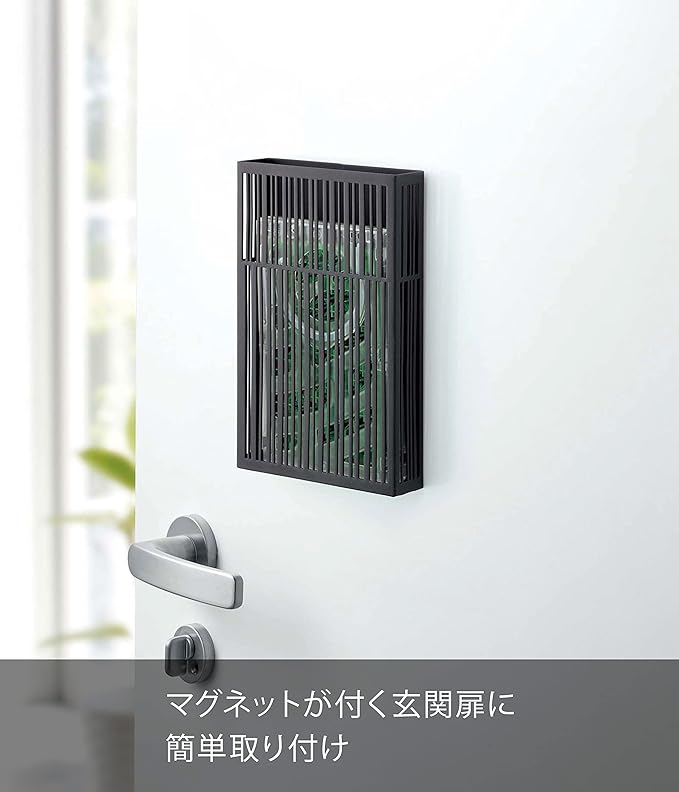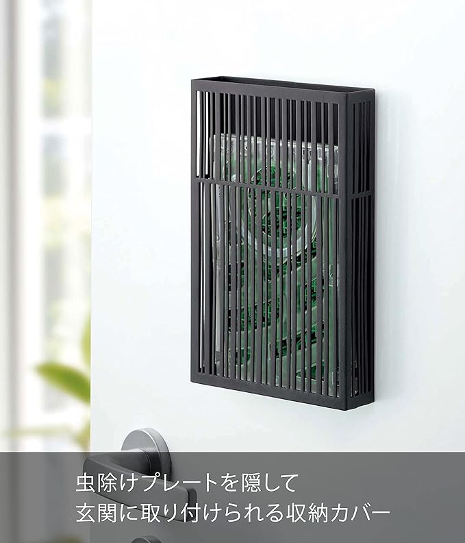 底も覆っていないので虫除けプレートの効果の邪魔をしません。上から虫除けプレートを入れるだけの簡単設置。付属の紐を使えば物干し竿などマグネットで取り付けられない場所にも設置出来ます。虫除けプレートを隠して玄関扉にマグネットで取り付けられる収納カバーです。
