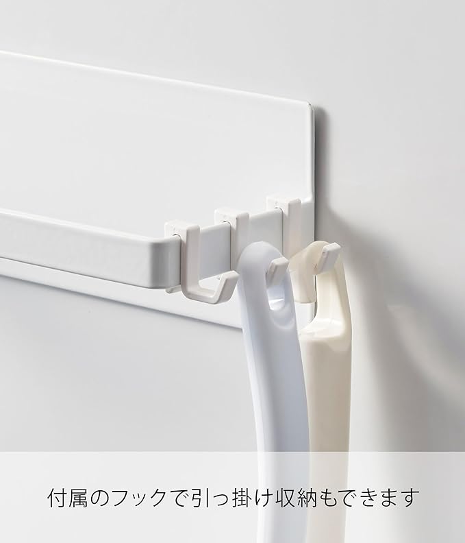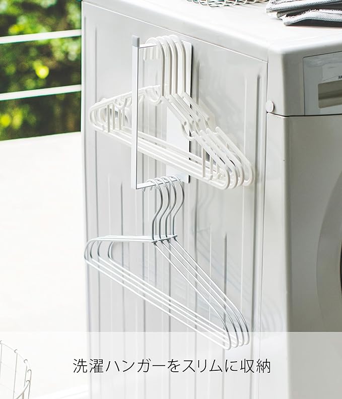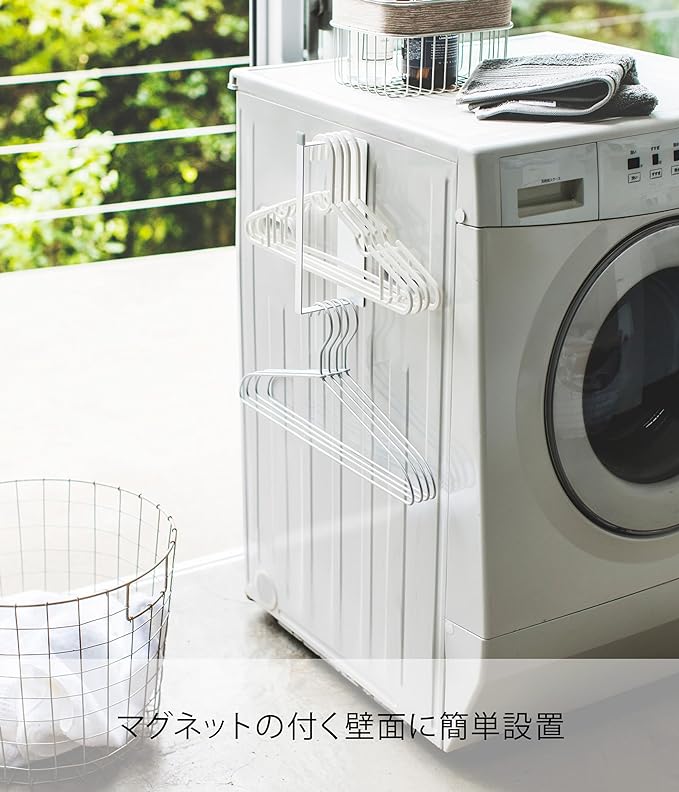 磁石で洗濯機横に簡単取付。かさばる洗濯ハンガーをスリムに一括収納。洗濯物をその場でハンガーに掛けられるから動作がスムーズ。取り出しやすく、使った後はスリムに収納。洗濯バサミも収納可能。横向き使用時にブラシなどを掛けられるフック3個付き。ピンチハンガー・お掃除ツールバスブーツの収納にも使えます。付属の木ネジで簡単取り付け。ランドリールームやクローゼットの壁面に。洗濯ハンガーを洗濯機横のすきまにスッキリ収納。