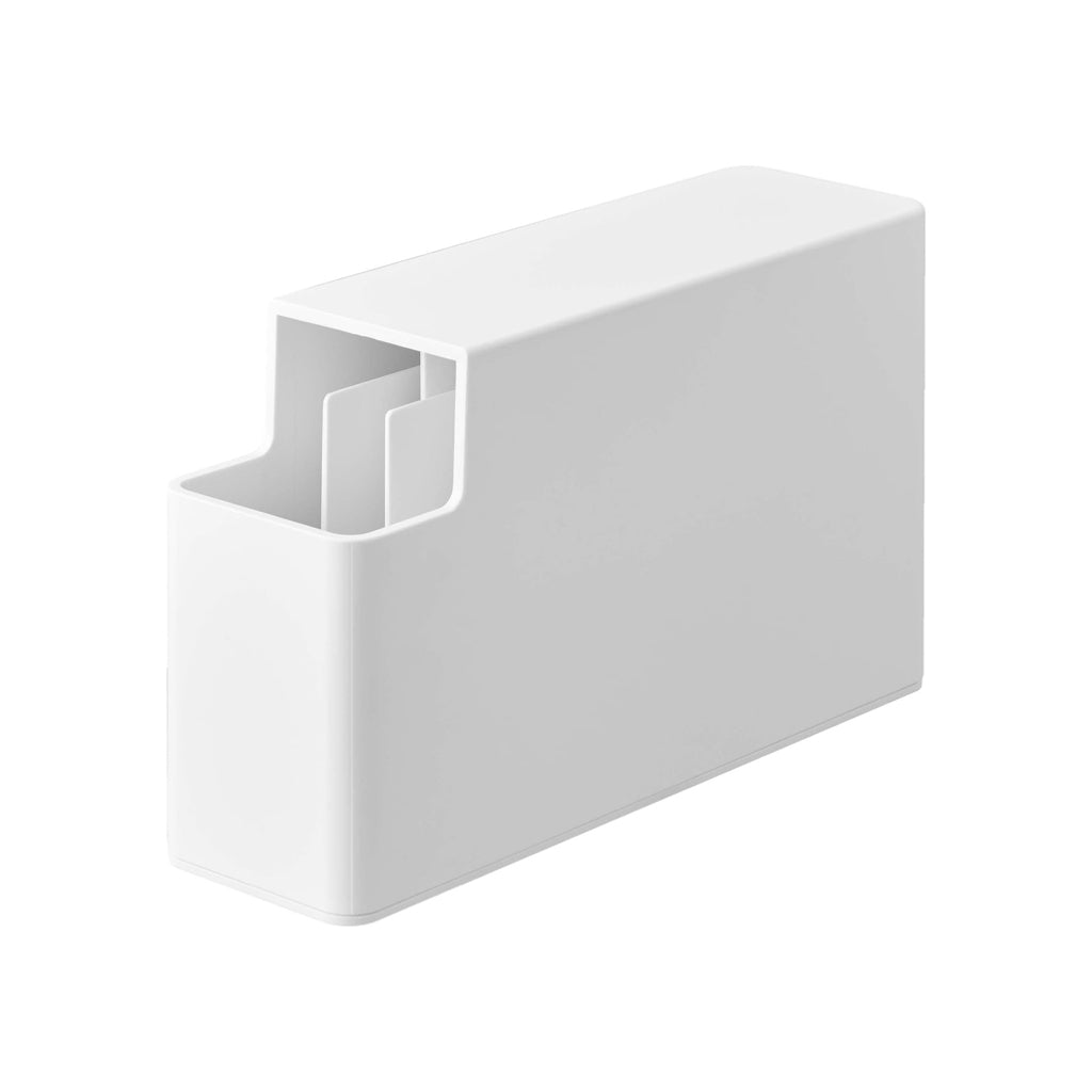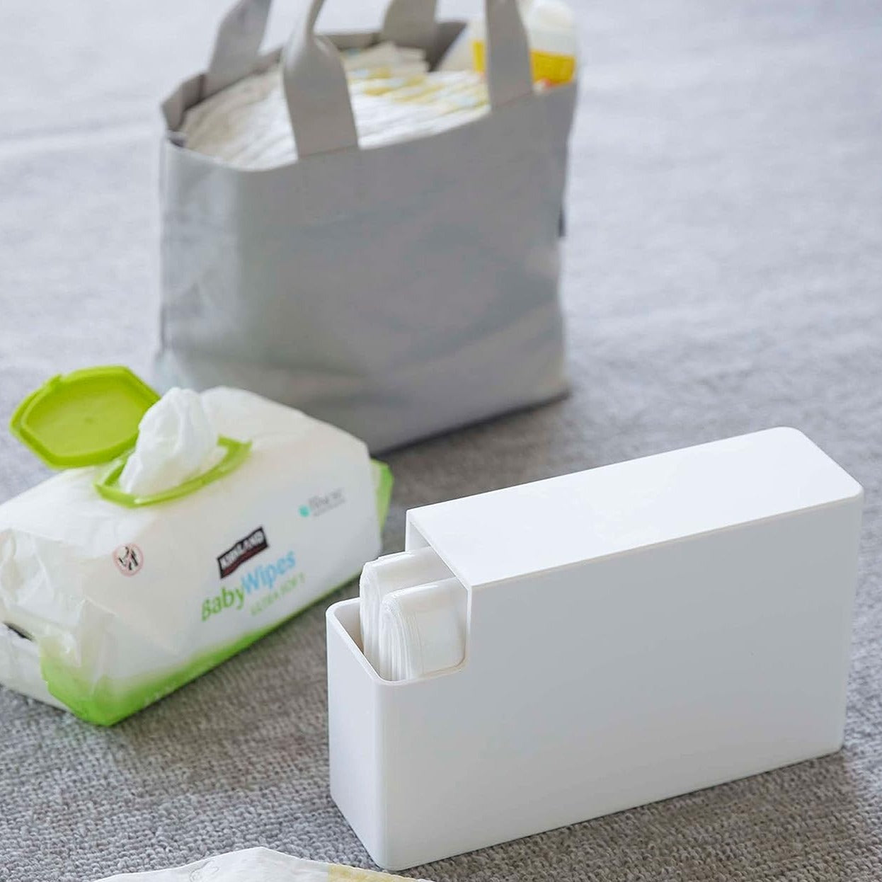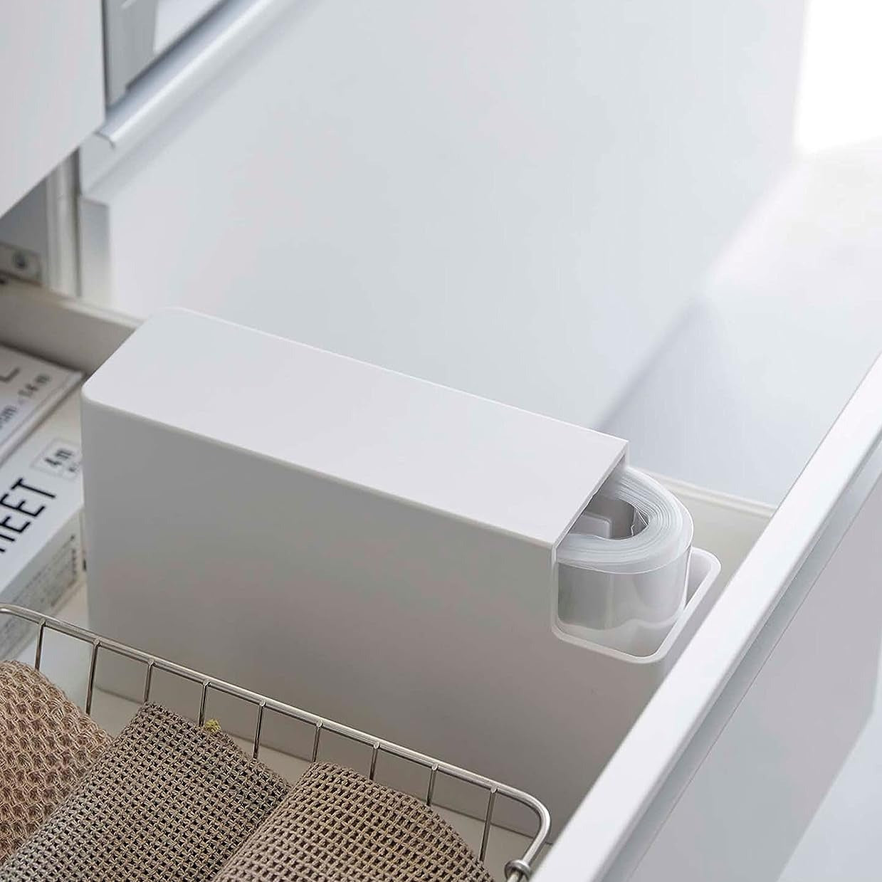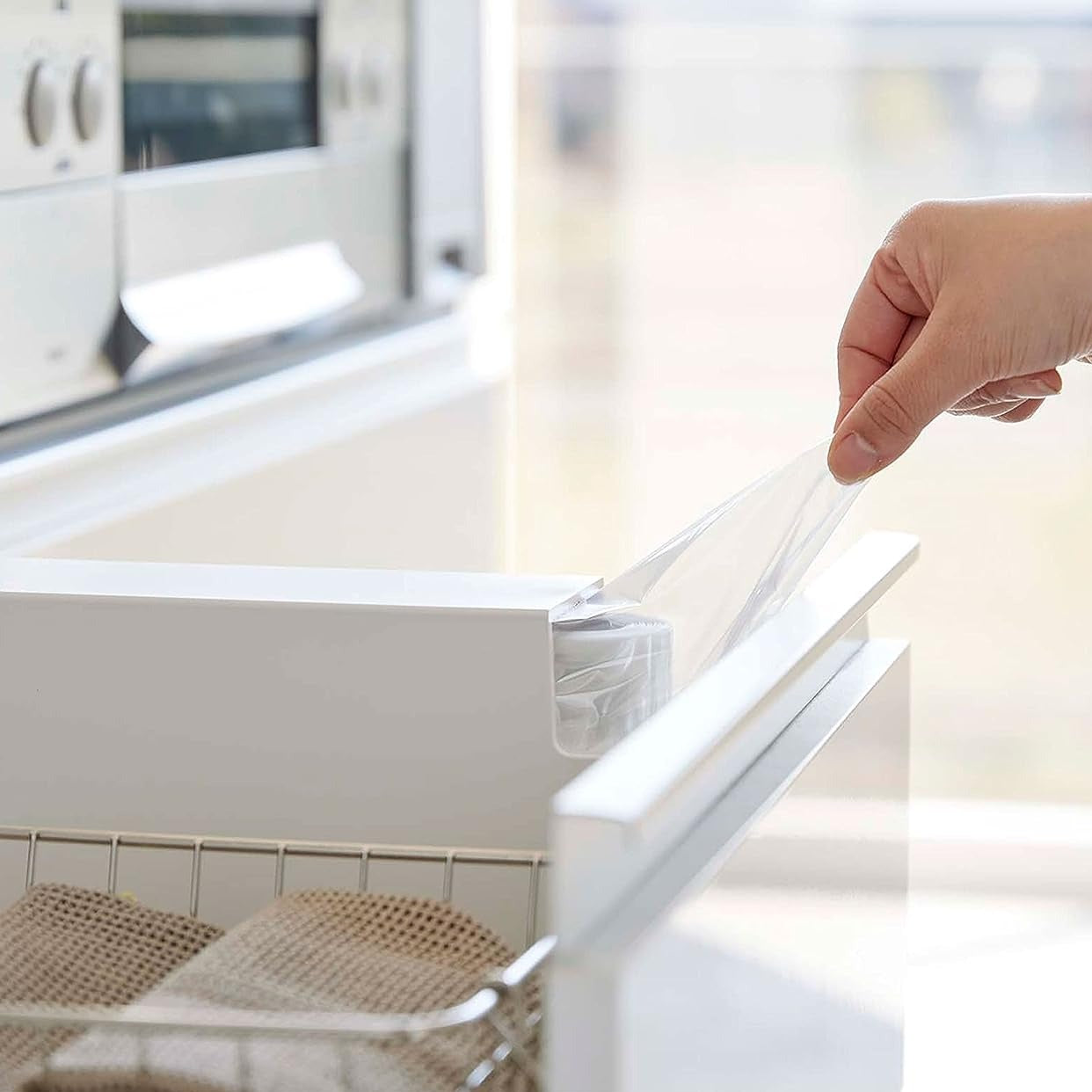 片手で一枚ずつ取り出せる袋ストッカー キッチンでよく使う袋類をスリムにまとめて、引き出しやすい袋ストッカーです。ケースに入れることでごちゃごちゃした印象を取り除き、忙しい調理中でも片手でサッと取り出せるから家事効率アップに期待できます。キッチンでは野菜のカット保存や漬け込み調理、リビングでは赤ちゃんのおむつを入れなどにも最適です。幅広いインテリアになじみやすい2カラー プラスチックバッグケースのカラーは、ホワイトとブラックの2色をご用意いたしました。モノトーンカラーとシンプルなデザインなので、どんなインテリアにもなじみます。ケースを収納棚に入れるのも良し、カウンターやテーブルなど見せる収納としてキッチン周りに置いておくのもおすすめです。設置スペースに合わせて縦向き・横向きが選べる幅は7cmとスリムな設計なので引き出しの隙間に収まりやすく、見た目もスッキリします。縦向き・横置きのどちらでも使用可能なので、キッチンボードやシンク下の引き出しスペースの高さに合わせてお好みで設置できます。2パターンから選べるから、引っ越しや配置換えをしたときにも便利です。つまんで引っ張るだけで、サッと取り出し可能 ケースの角から覗いた袋をつまんでシュッと引っ張るだけで、片手でも一枚ずつ簡単に取り出せます。忙しい調理中でも引き出しを大きく開けず少ない動作で済むので、ストレスなく使用できるのが魅力です。袋のサイズに合わせて2通りにセット 食パン袋などの幅13cm×高さ40cm以内の細長い袋なら「U字の形」に、ポリ袋などの幅20cm×高さ38cm以内の袋は「M字の形」になるようにスタンドに掛けられます。カバーと台座は別々に取り外せるので、袋の補充も簡単です。