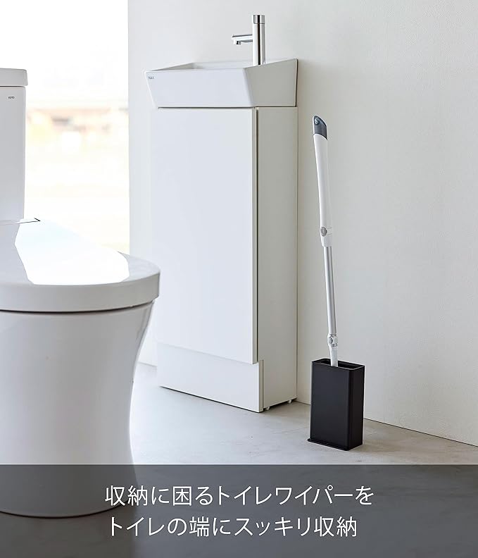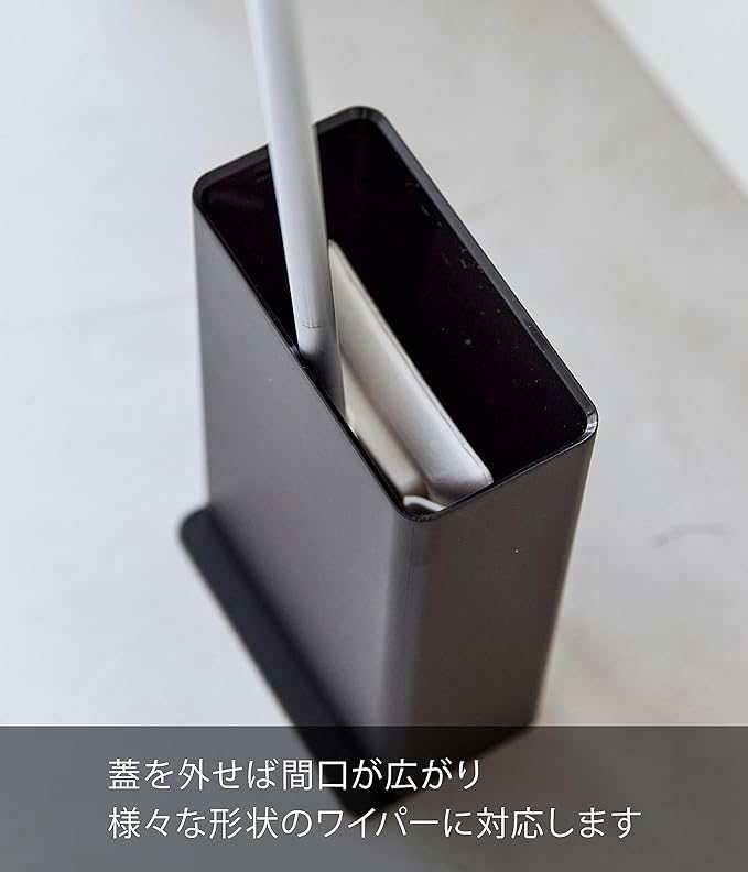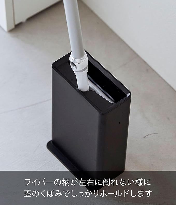 トイレワイパーを立ててスリムに収納。収納に困るトイレワイパーを、トイレの端にすっきり収納。本体の底が傾斜しているのでワイパーの柄をしっかりホールド。蓋が外れるのでお手入れも簡単。蓋を外すと間口が広がり様々な形状のワイパーに対応。