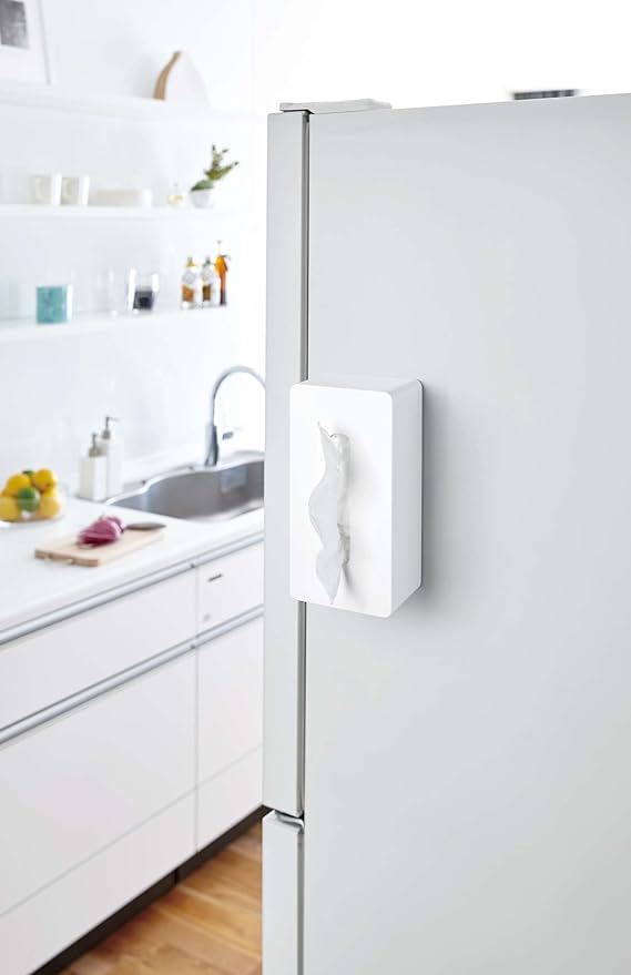 マグネットで貼り付けるだけの簡単取り付け。ティッシュペーパーだけでなくキッチンペーパーにも対応しています。そのまま置いても使えます。保湿タイプの高さのあるティッシュボックスも収納できます。