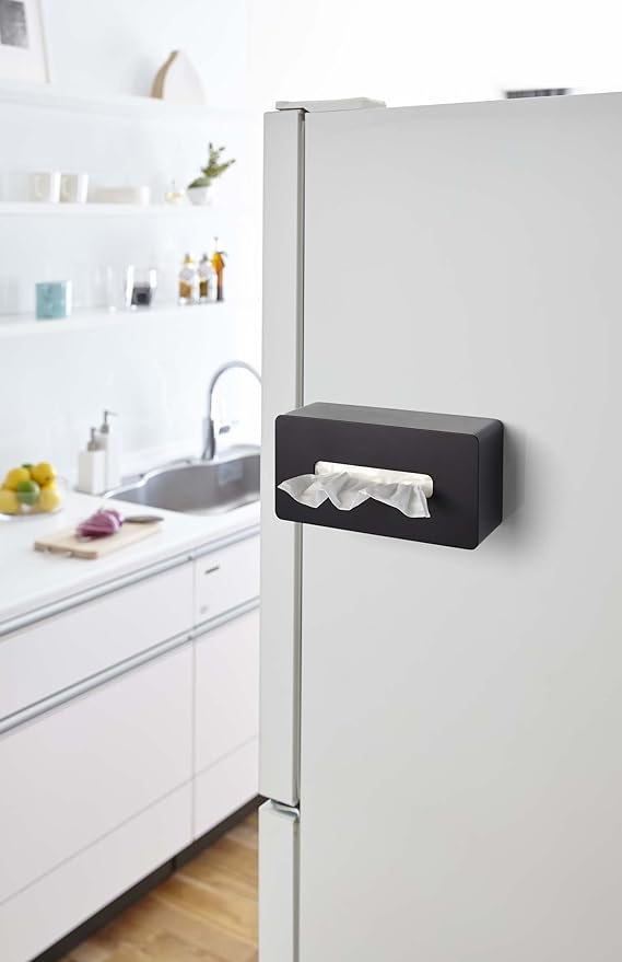 マグネットで貼り付けるだけの簡単取り付け。ティッシュペーパーだけでなくキッチンペーパーにも対応しています。そのまま置いても使えます。保湿タイプの高さのあるティッシュボックスも収納できます。