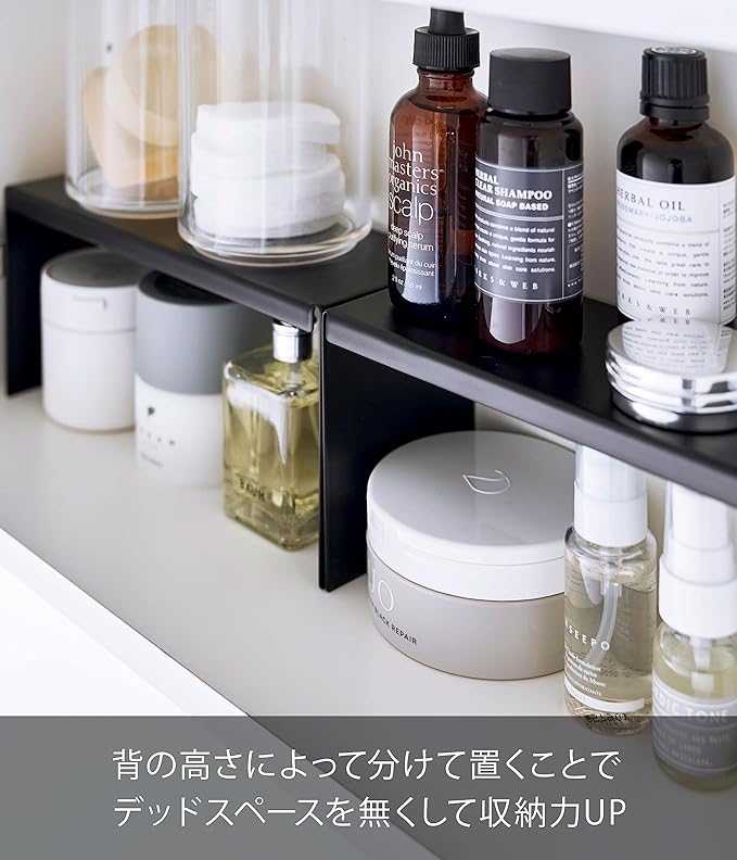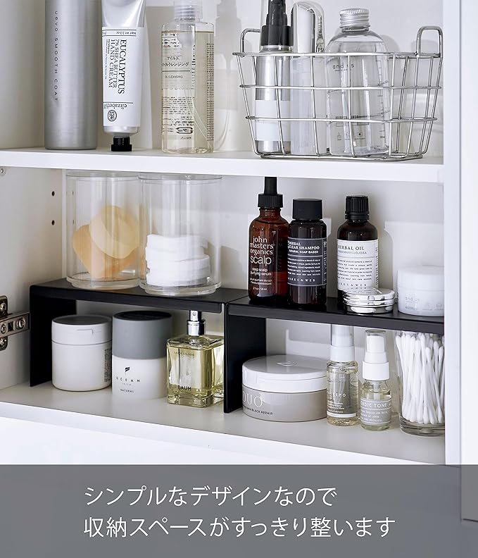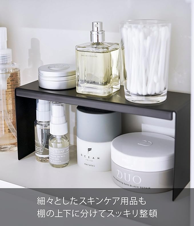 洗面鏡の中の収納スペースを有効活用。お好みの場所に棚を追加することで、スペースの無駄を無くし、スキンケア用品などをスッキリ整頓できます。背の高さによって分けて置くことでデッドスペースを無くして収納力が上がります。細々としたスキンケア用品を棚の上下に分けて収納できます。