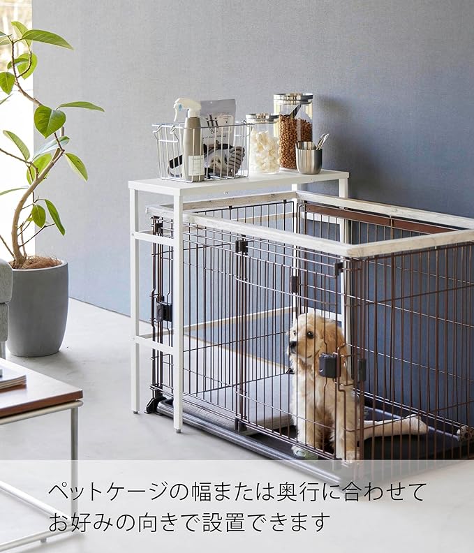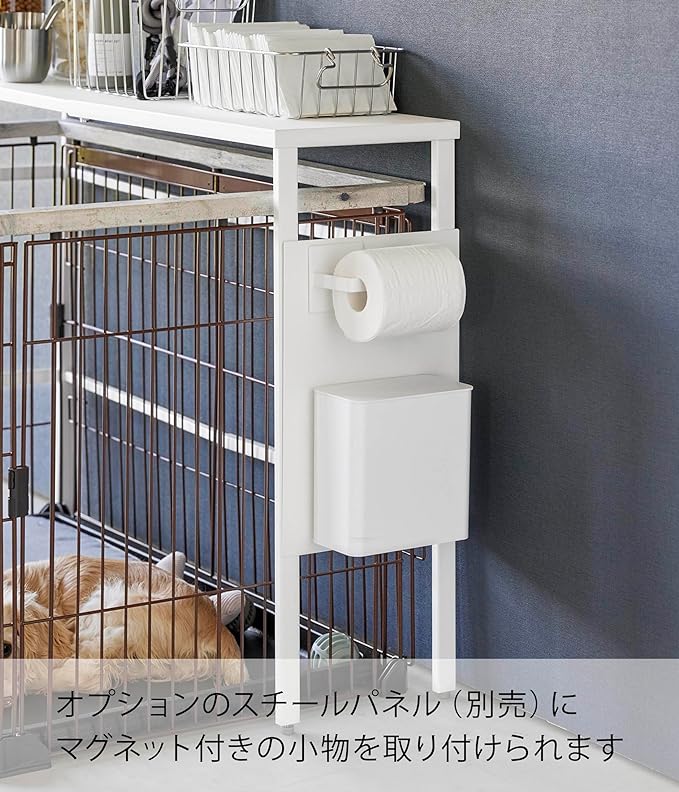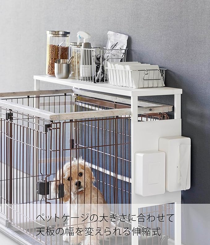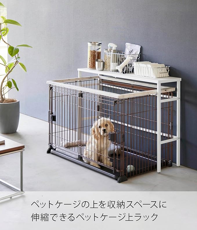 ペットケージ上のデッドスペースを有効活用。 お使いのペットケージに合わせて伸ばせるラックです。場所を取らずに収納スペースを増設できるのでお部屋を圧迫しません。ペットの相手をしながら片手でサッと欲しいものが取れるのが便利。ケージの上を覆い過ぎず物が置きやすいちょうど良いサイズ感です。インテリアになじむ2色のカラーバリエーション カラーは、明るい印象のホワイトと、スタイリッシュなブラックをご用意しました。お部屋のインテリアインテリアに合わせやすいシンプルなモノトーンカラーです。ケージや壁紙の色、カーテンやソファなどのファブリックに合わせてお好きなカラーをお選びください。縦にも横にも使える伸縮式がうれしい ペットケージの大きさに合わせて天板の幅を変えられる伸縮式。ペットケージの縦にも横にも使えるので、お部屋の模様替えでケージの位置や向きを変えた際にも対応可能です。最大で内寸104cmまで伸びるので、あらゆるサイズのペットケージに対応します。ペット関連のアイテムはケージの側で一括収納 ペットのフードやおやつ、ペットシーツやブラシなどのお世話グッズをまとめてラックに収納。動物病院で貰ってきた予防薬なども一緒にしておけば飲み忘れも防げます。お散歩用のリードやおもちゃを置いておくのもおすすめです。別売りの『ペットコートハンガーラック』との組合せで収納の幅がさらに広がります。マグネット収納を足してさらに便利に オプションパーツのスチールパネルをあわせてご使用になればマグネット小物も収納できるようになります。取り付けはサイドのフレームに引っ掛けるだけなので簡単です。※こちらの商品は『伸縮ペットケージ上ラック』の商品となり、『伸縮ペットケージ上ラック用オプションパーツ』の商品は別売です。