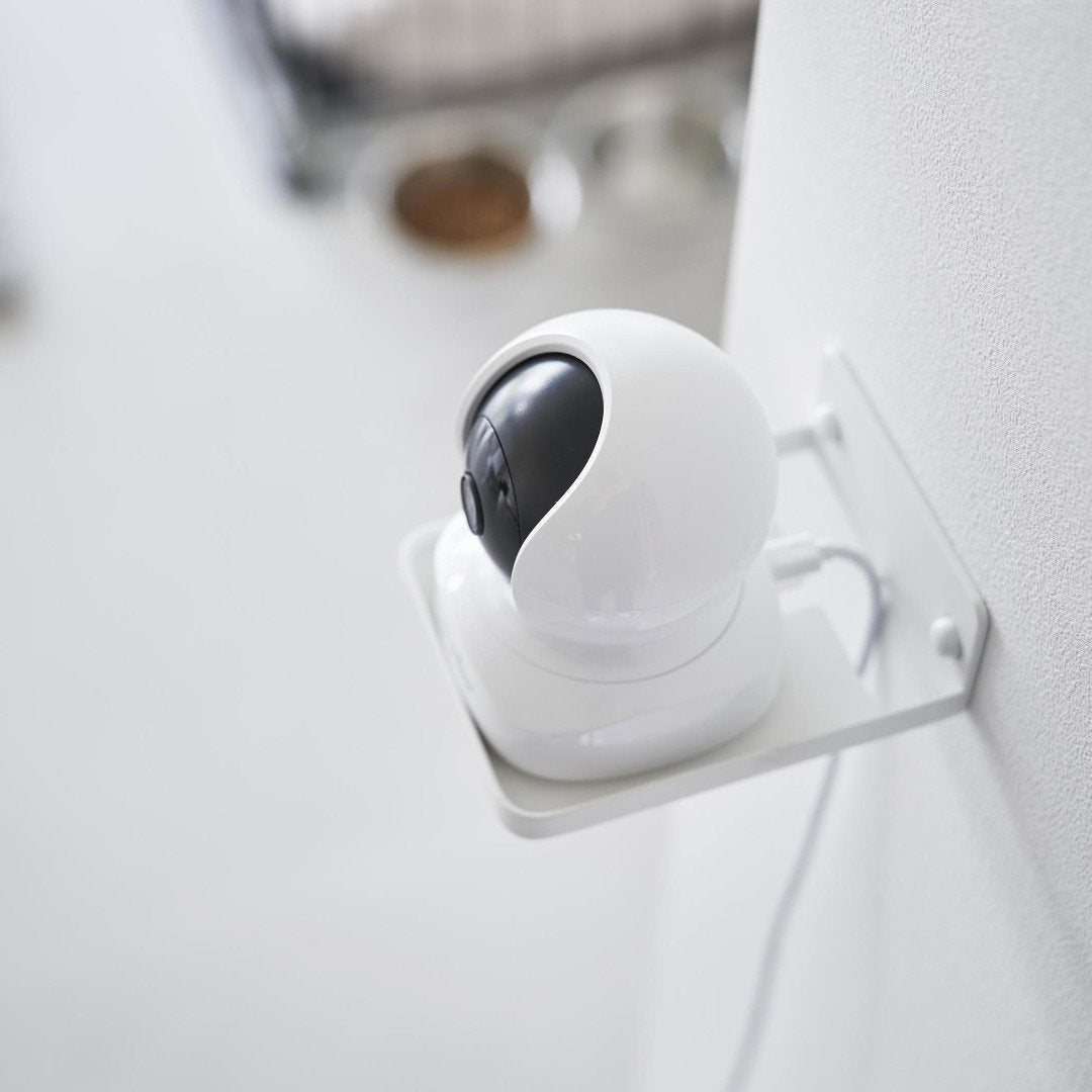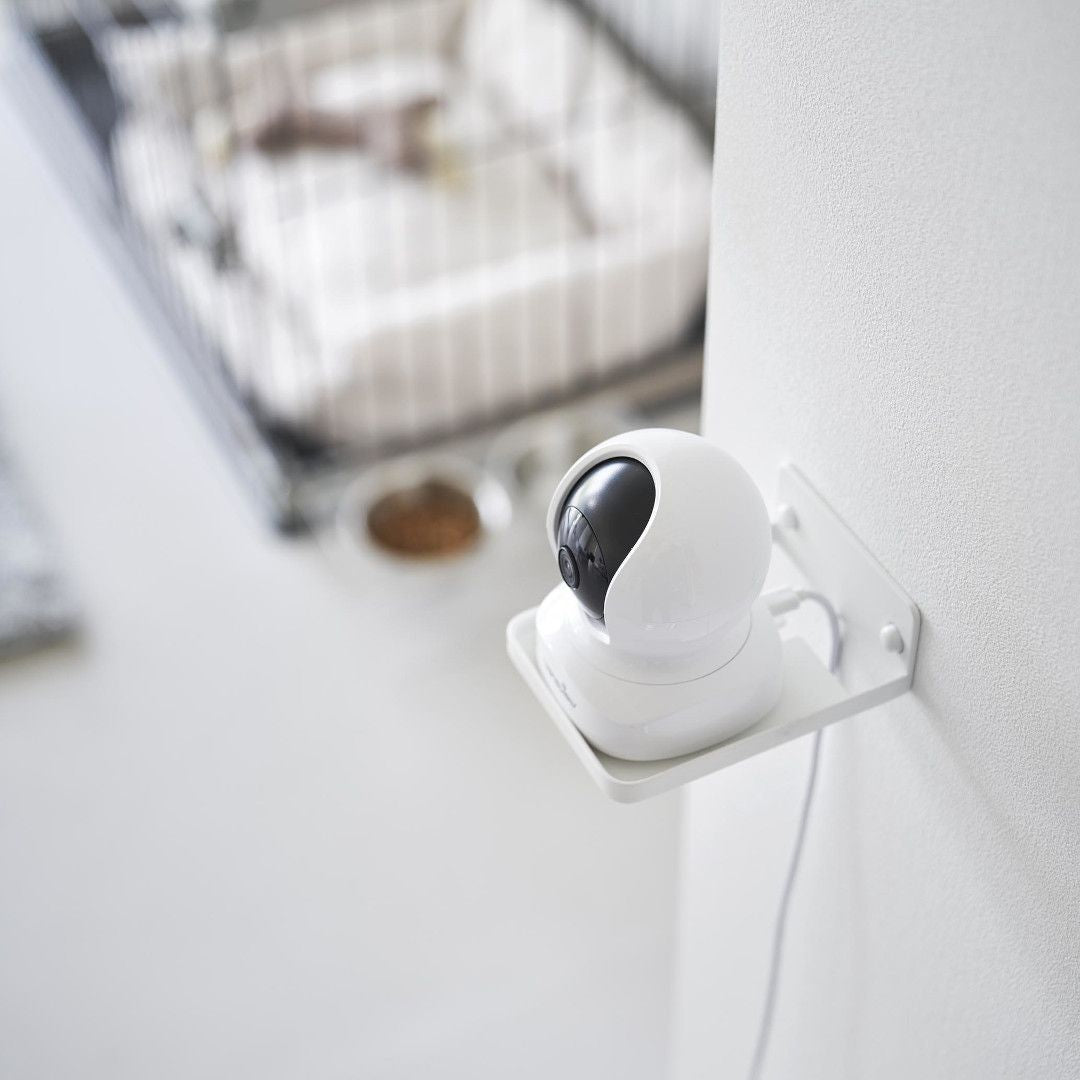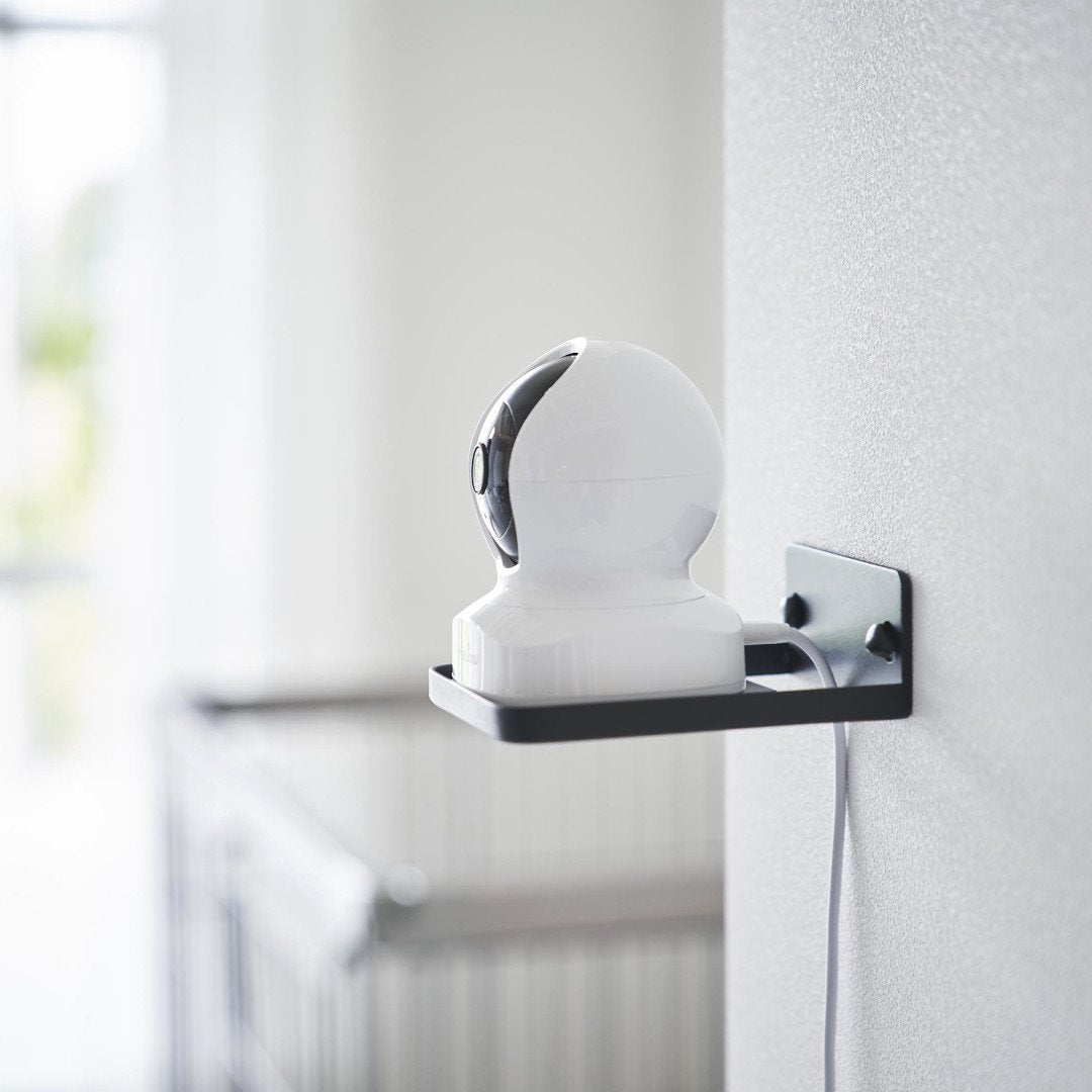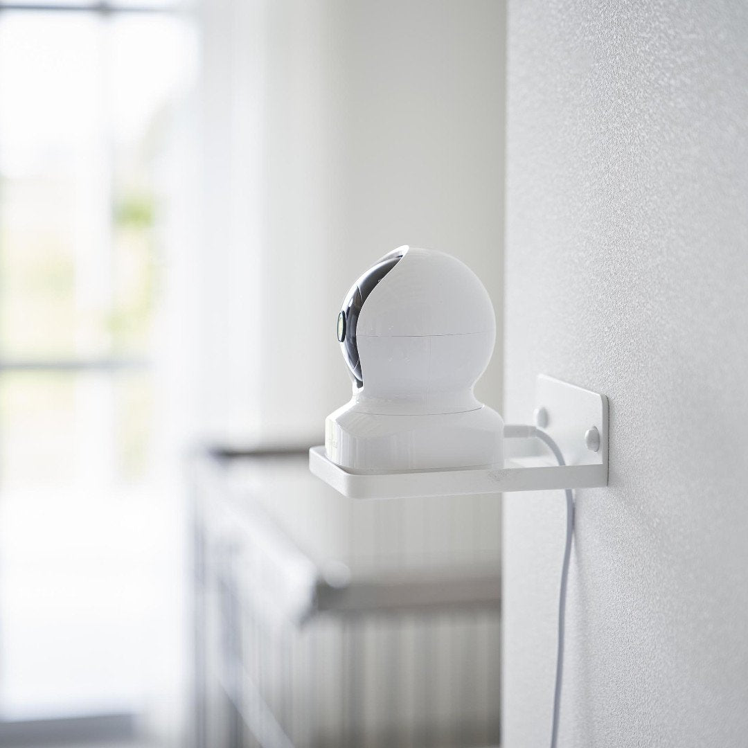 浮かせて上から見守るベビールームやリビングに取り付けて、違う部屋や外出先から確認できる見守りカメラ用のラックです。お子さまやペットの手が届きづらい場所に設置できるので、いたずらなどで外出中に転倒するのを防ぎます。石こうボードピン取り付けだから賃貸のお家でも使いやすいです。お部屋になじむ、2色のカラーバリエーションカラーは、明るい印象のホワイト、スタイリッシュなブラックをご用意しました。どのお部屋にも合わせやすいシンプルなモノトーンカラーです。設置場所の壁紙やお部屋の雰囲気に合わせてお好みのカラーをお選びください。ネジ穴を利用してしっかりと固定も可能見守りカメラをラックに置くだけでもご使用いただけますが、底面にネジ穴があるタイプのカメラなら付属のネジを使用してしっかりと固定することも可能です。より落下しにくくなるため安心してお使いいただけます。ケーブルを通せるスリットで配線問題を解消ラックの背後にはケーブルを通すためのスリットが開いています。スリット幅は1.8cmと広めなのでカメラの角度や配線を気にせずに設置することが可能です。ケーブルを後ろから通して見た目がすっきりするのは高ポイント。壁の穴が目立ちにくい石こうボードピン取り付け石こうボードピンで設置するので、取り外したときに壁の穴が目立ちにくいのがうれしいポイント。大きな力は必要なく、コインを使って取り付けベースを設置したら本体を差し込むだけ。女性でも簡単に取り付けが完了します。