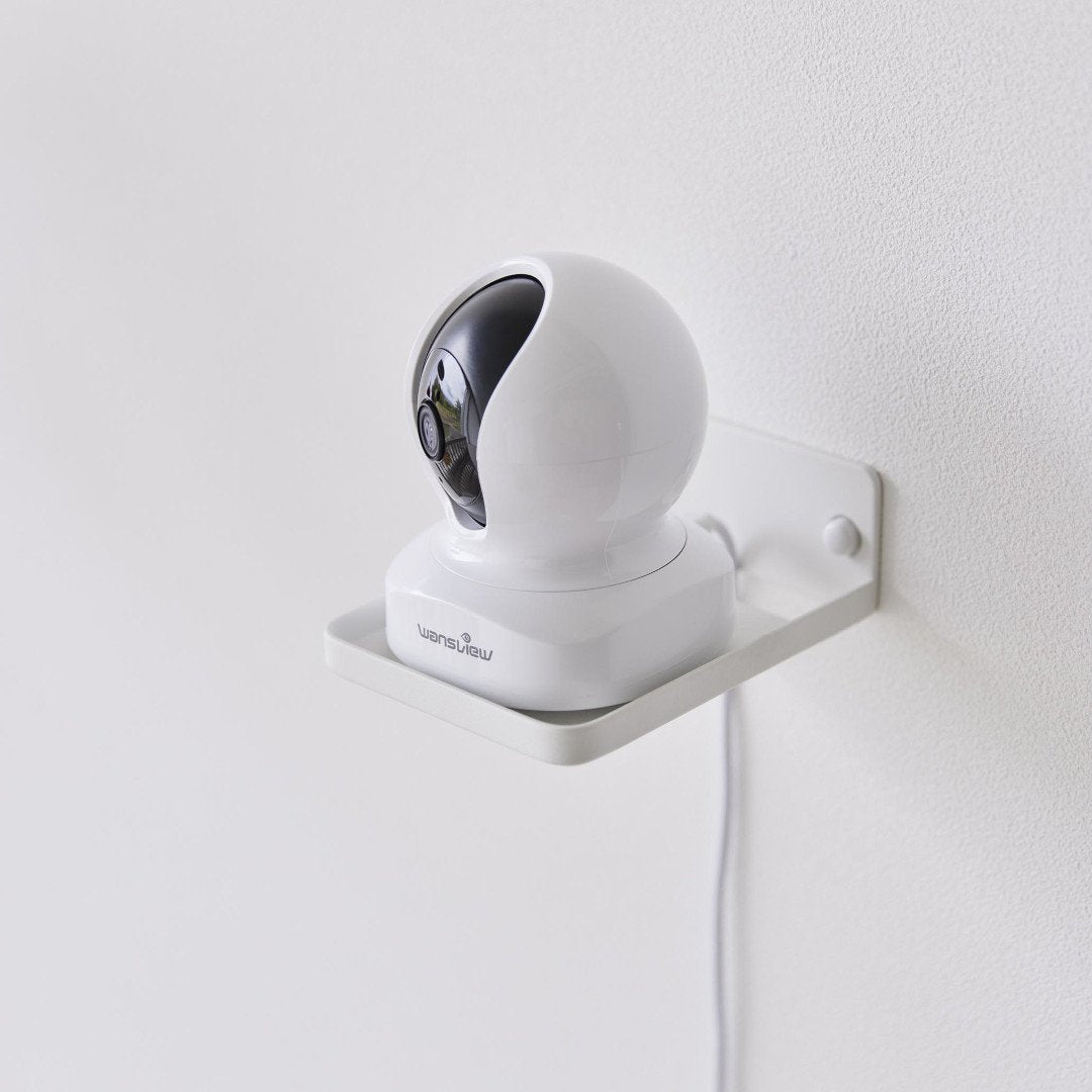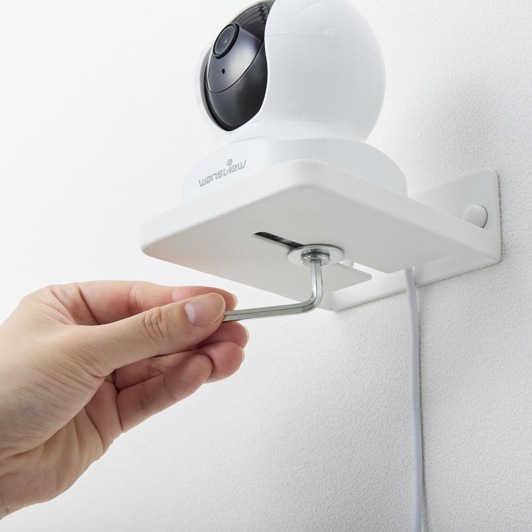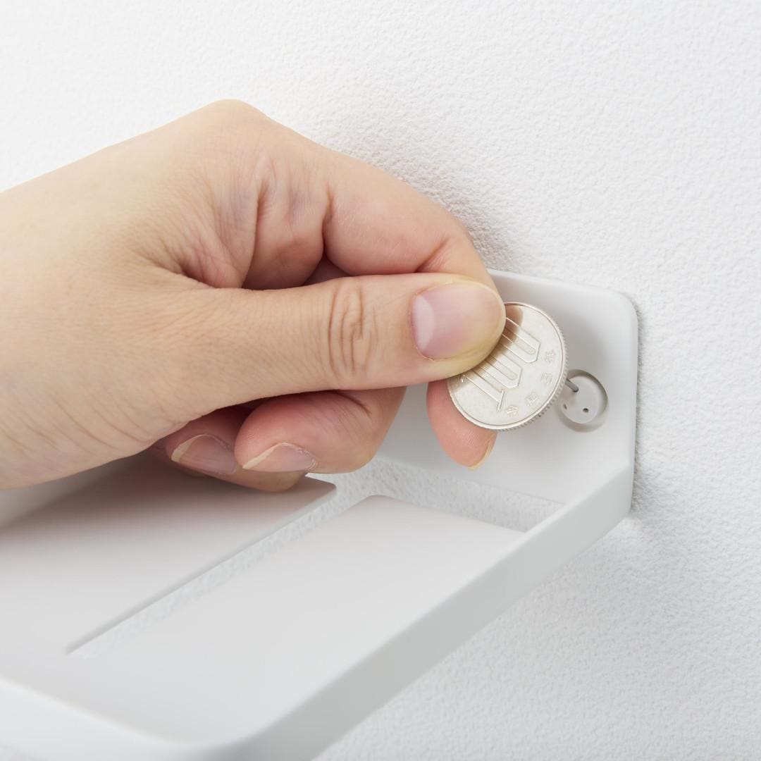 浮かせて上から見守るベビールームやリビングに取り付けて、違う部屋や外出先から確認できる見守りカメラ用のラックです。お子さまやペットの手が届きづらい場所に設置できるので、いたずらなどで外出中に転倒するのを防ぎます。石こうボードピン取り付けだから賃貸のお家でも使いやすいです。お部屋になじむ、2色のカラーバリエーションカラーは、明るい印象のホワイト、スタイリッシュなブラックをご用意しました。どのお部屋にも合わせやすいシンプルなモノトーンカラーです。設置場所の壁紙やお部屋の雰囲気に合わせてお好みのカラーをお選びください。ネジ穴を利用してしっかりと固定も可能見守りカメラをラックに置くだけでもご使用いただけますが、底面にネジ穴があるタイプのカメラなら付属のネジを使用してしっかりと固定することも可能です。より落下しにくくなるため安心してお使いいただけます。ケーブルを通せるスリットで配線問題を解消ラックの背後にはケーブルを通すためのスリットが開いています。スリット幅は1.8cmと広めなのでカメラの角度や配線を気にせずに設置することが可能です。ケーブルを後ろから通して見た目がすっきりするのは高ポイント。壁の穴が目立ちにくい石こうボードピン取り付け石こうボードピンで設置するので、取り外したときに壁の穴が目立ちにくいのがうれしいポイント。大きな力は必要なく、コインを使って取り付けベースを設置したら本体を差し込むだけ。女性でも簡単に取り付けが完了します。