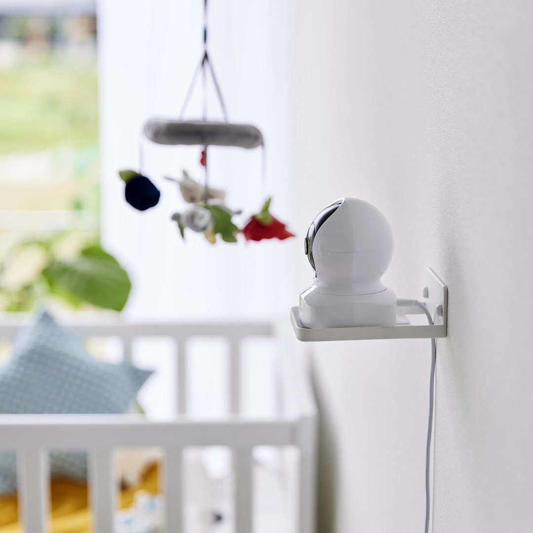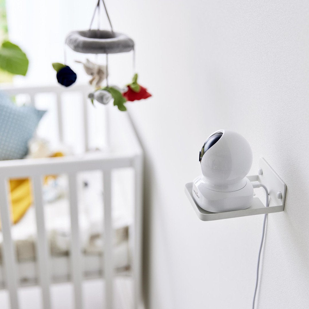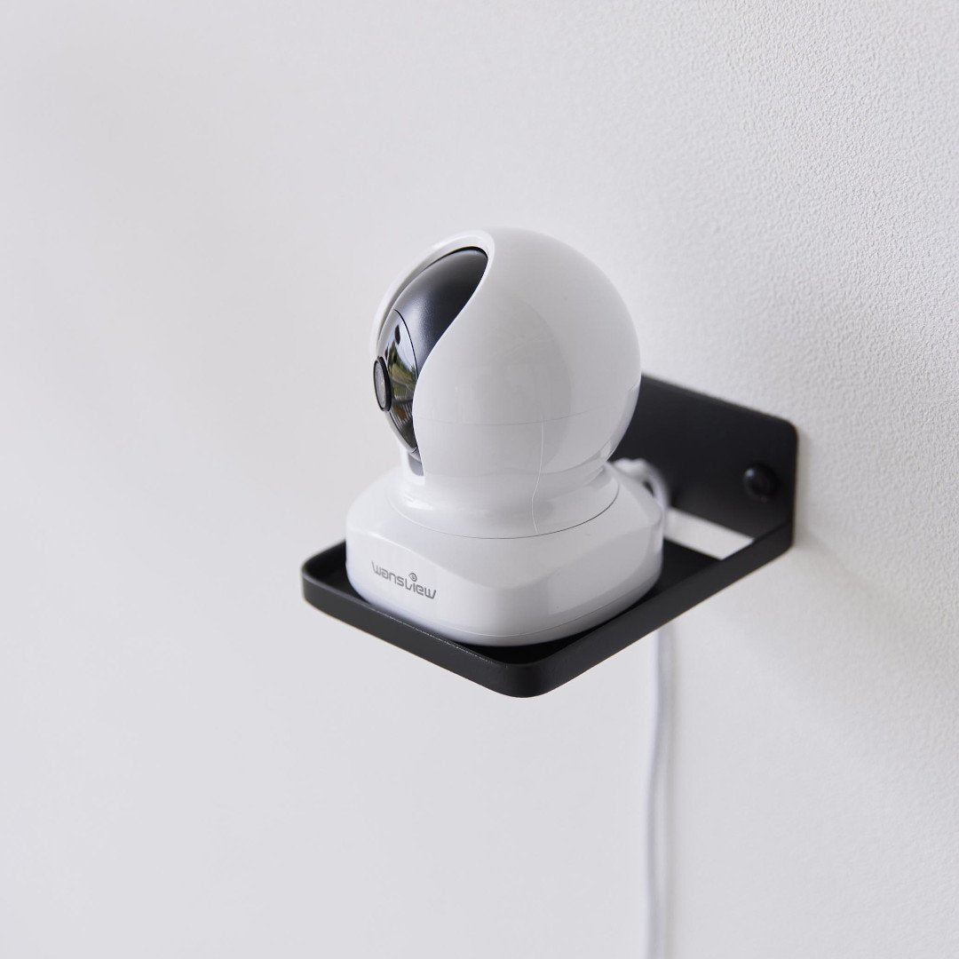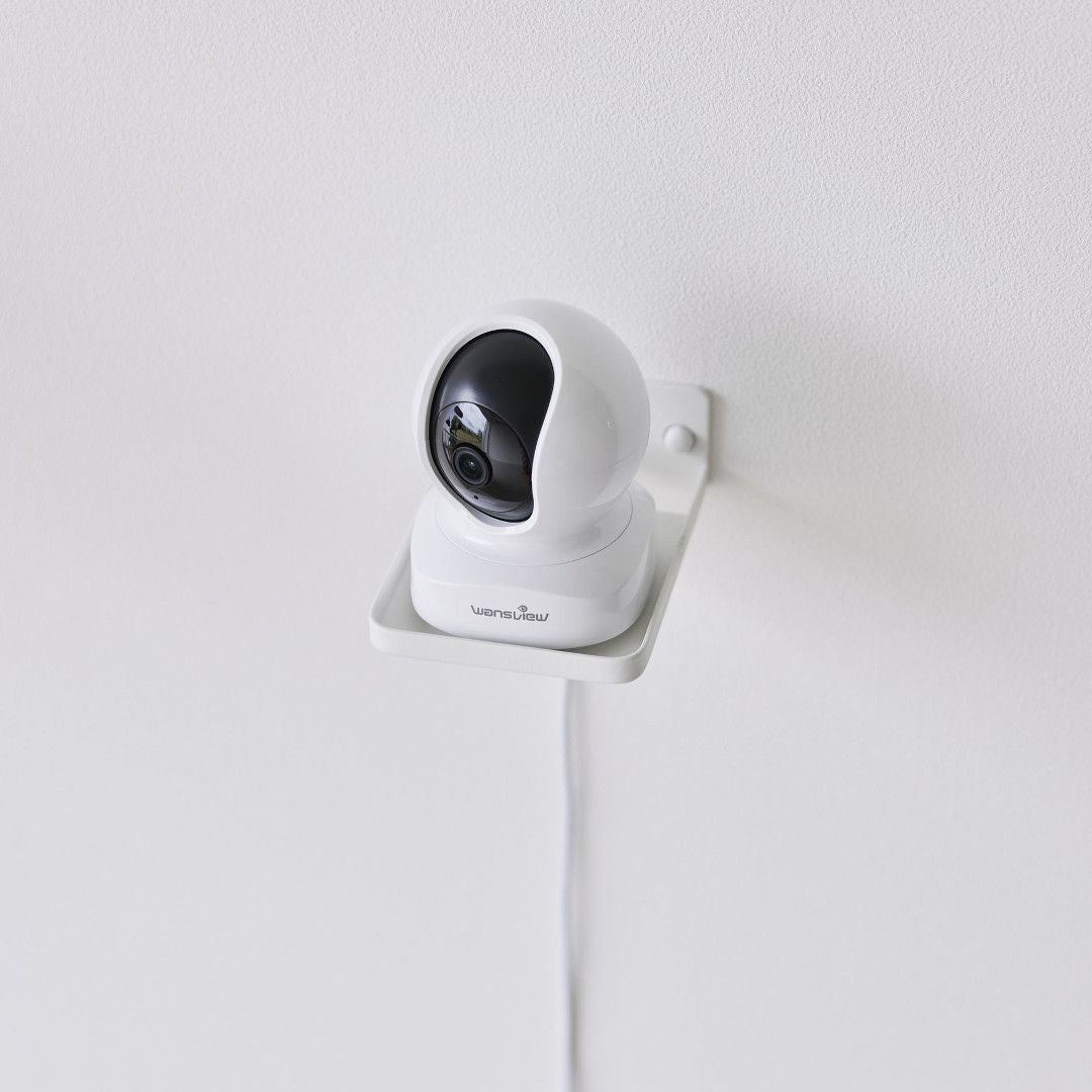 浮かせて上から見守るベビールームやリビングに取り付けて、違う部屋や外出先から確認できる見守りカメラ用のラックです。お子さまやペットの手が届きづらい場所に設置できるので、いたずらなどで外出中に転倒するのを防ぎます。石こうボードピン取り付けだから賃貸のお家でも使いやすいです。お部屋になじむ、2色のカラーバリエーションカラーは、明るい印象のホワイト、スタイリッシュなブラックをご用意しました。どのお部屋にも合わせやすいシンプルなモノトーンカラーです。設置場所の壁紙やお部屋の雰囲気に合わせてお好みのカラーをお選びください。ネジ穴を利用してしっかりと固定も可能見守りカメラをラックに置くだけでもご使用いただけますが、底面にネジ穴があるタイプのカメラなら付属のネジを使用してしっかりと固定することも可能です。より落下しにくくなるため安心してお使いいただけます。ケーブルを通せるスリットで配線問題を解消ラックの背後にはケーブルを通すためのスリットが開いています。スリット幅は1.8cmと広めなのでカメラの角度や配線を気にせずに設置することが可能です。ケーブルを後ろから通して見た目がすっきりするのは高ポイント。壁の穴が目立ちにくい石こうボードピン取り付け石こうボードピンで設置するので、取り外したときに壁の穴が目立ちにくいのがうれしいポイント。大きな力は必要なく、コインを使って取り付けベースを設置したら本体を差し込むだけ。女性でも簡単に取り付けが完了します。