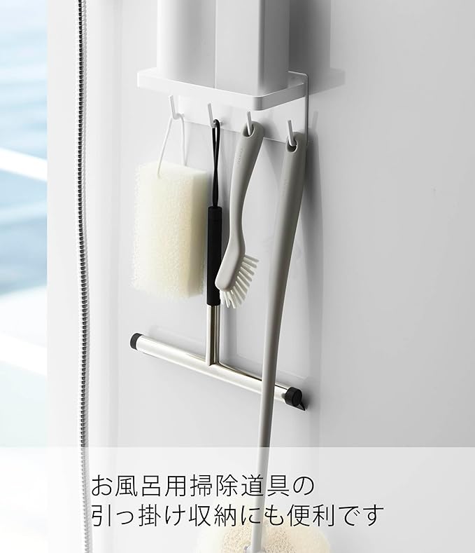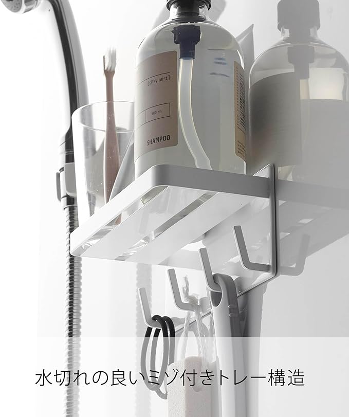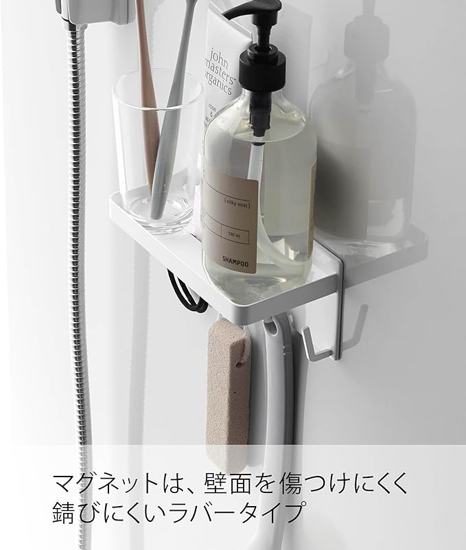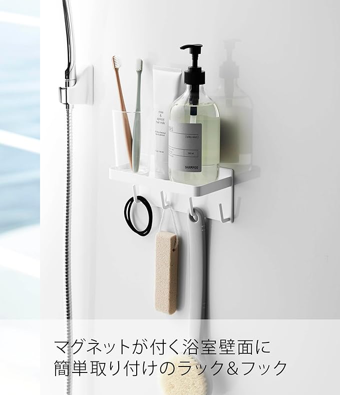マグネットが付く浴室壁面に簡単取り付けのラック&フック。ディスペンサーボトルの追加棚として便利。石鹸・歯ブラシ・タンブラーなどの収納にも。水切れの良いミゾ付きトレー構造。壁面を傷付けにくく、錆びないラバータイプのマグネット。取り付け位置が簡単に調節可能。