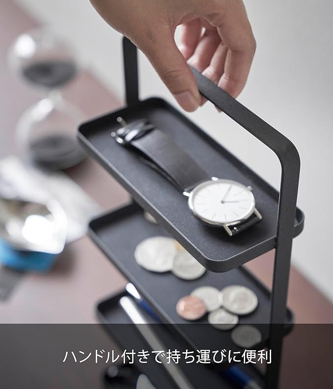 メガネやサングラス、時計やアクセサリー類からステーショナリーまで収納可能。持ち運びに便利なハンドル付きの4段収納トレー。