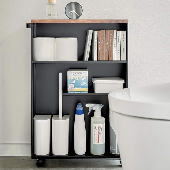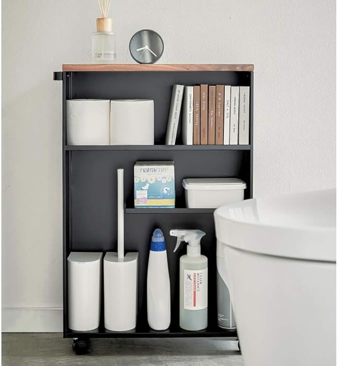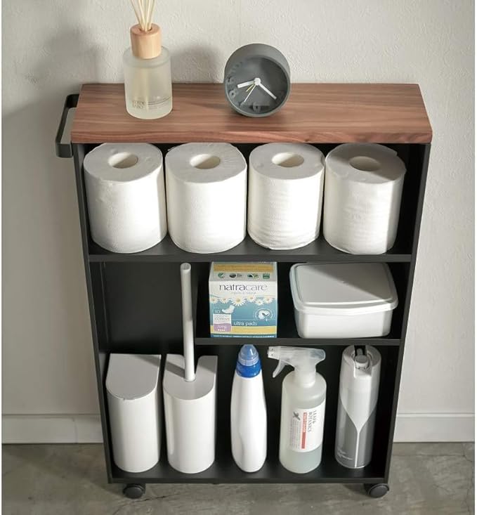 ハンドル付きのスリムなトイレ収納ワゴン。トイレットペーパーロールやトイレ用洗剤、除菌シートから文庫本などを一括収納できます。キャスター付きだから移動もラクラク。ハンドル部分はお好みで左右どちらにも取り付け可能。