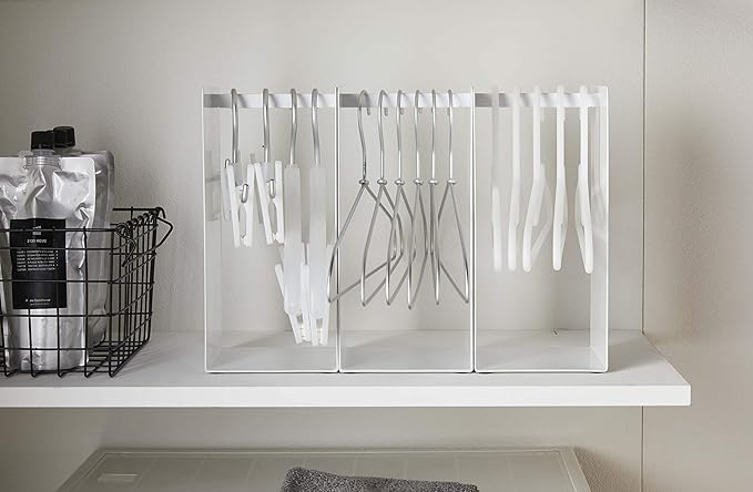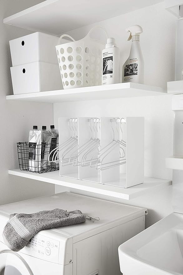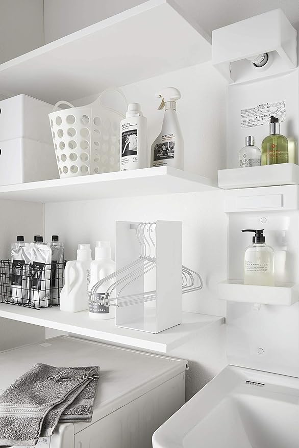 棚板に差し込むだけの簡単設置。洗濯機上などの空間を収納スペースとして有効活用。ランドリー小物を一括収納できます。