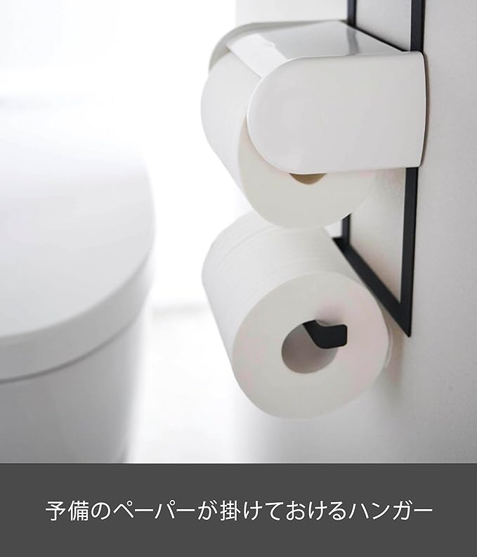 トイレットペーパーホルダーに差し込むだけの簡単取り付け。ホルダーの上下が収納スペースに。下部ハンガーにはトイレットペーパーロールのストックを収納可能。トレーは掃除用具の収納やスマートフォンの一時置きなどに使えます。