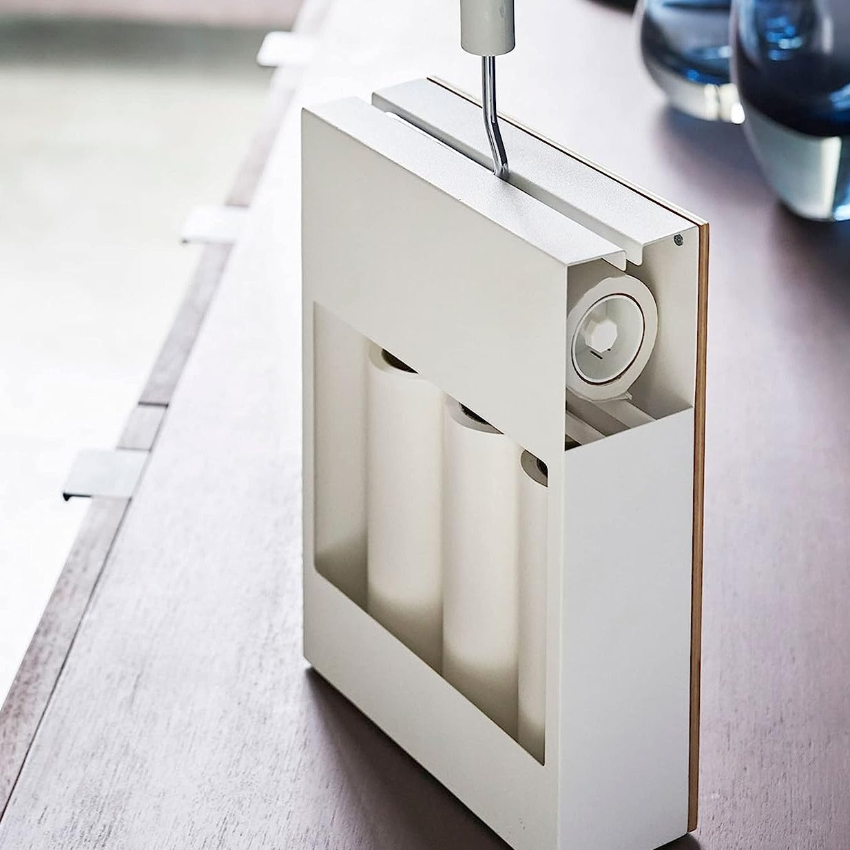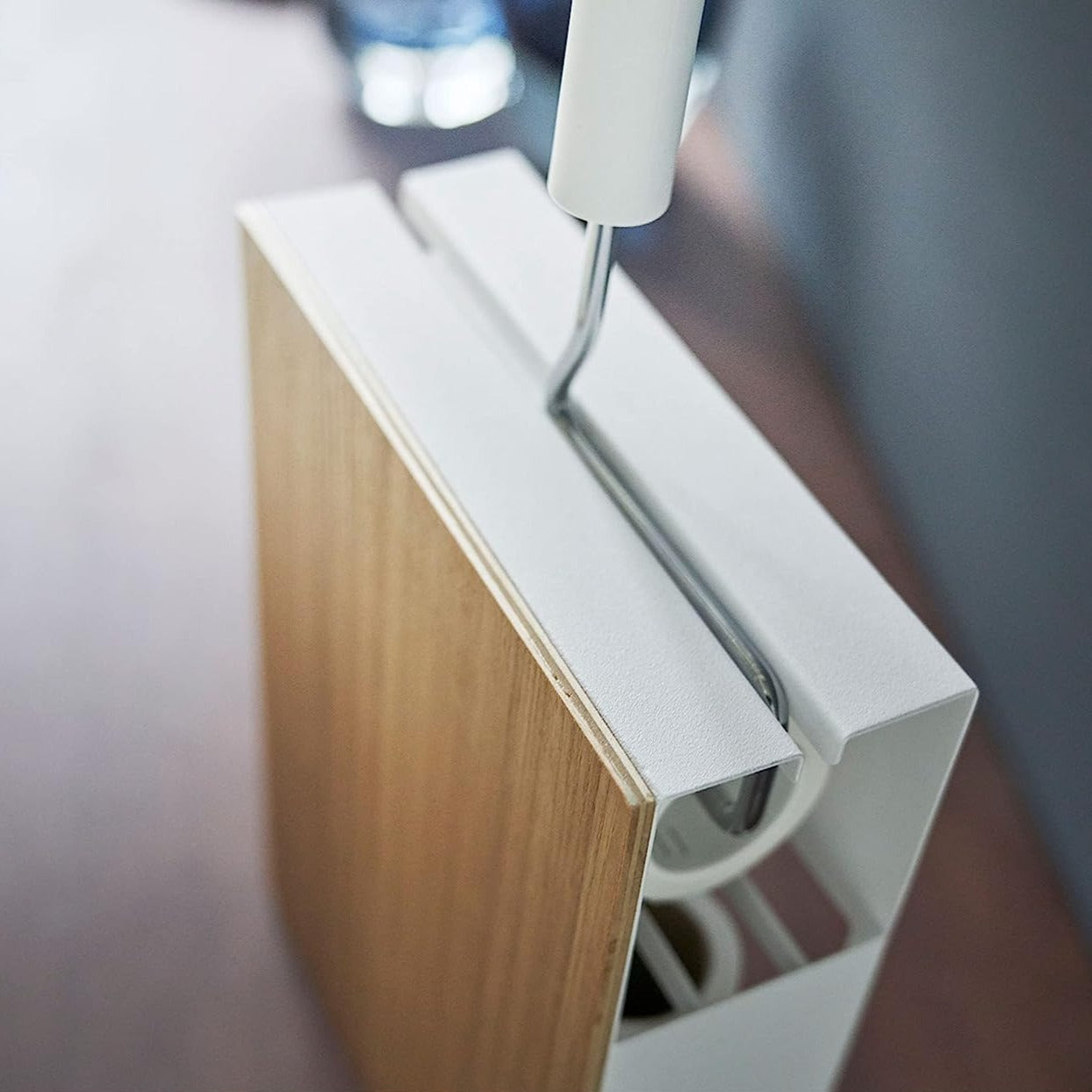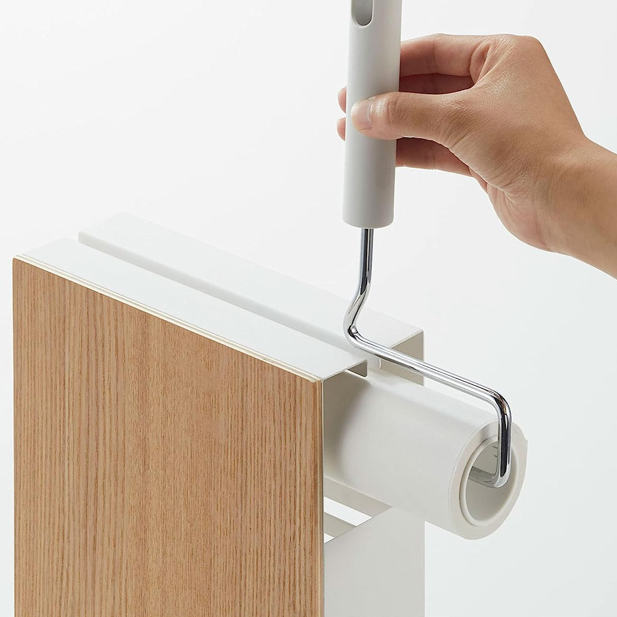 隠してスタイリッシュに収納できるカーペットクリーナースタンドです。横からスライドして入れるだけの簡単に収納が可能です。粘着面にほこりが付きにくい構造で、下段にはスペアテープが3本入ります。
