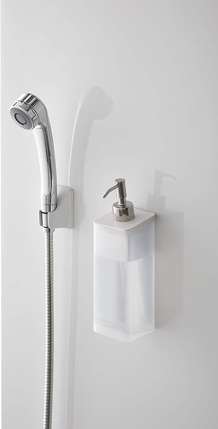 マグネットが付く浴室壁面に簡単取り付けのディスペンサーボトル。そのままポンプを押して液体を出せます。蓋が外れるのでお手入れや注ぐのが簡単。詰め替え用袋がそのまま入ります。浮かせることができるので底がぬめらず衛生的。
