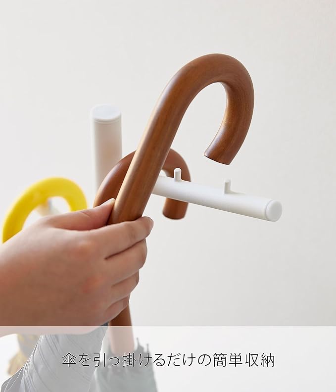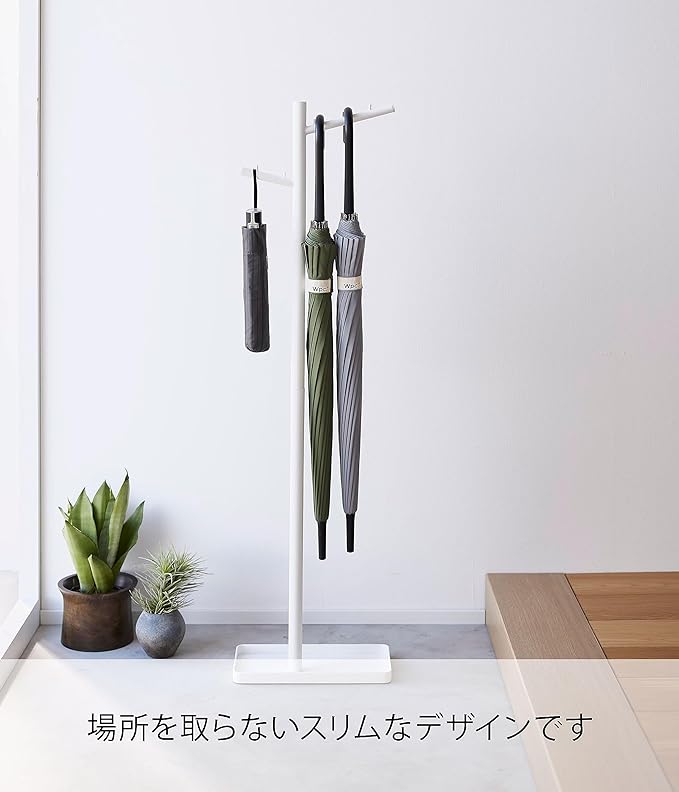 ツリー型がかわいい、引っ掛けるだけの傘立て ツリーの枝のような形がかわいい傘立てです。引っ掛けるだけの簡単収納で、取り出しやすいのが◎。長さ違いの傘や折り畳み傘もまとめて収納できます。シンプルな2色のカラー カラーはホワイトとブラックからお選びいただけます。シンプルながらお子さまにも喜ばれるデザインなので自分で収納する習慣がつきそうです。小さなお子さまでもかけやすい高さ違いのハンガー ツリーのように高さ違いについたハンガーは、長さの違う傘でも埋もれずに収納できます。低いハンガーにはお子さまでも手の届きやすいので自分で取り出し、戻すことができます。ズレ落ちない、乾きやすいポイント ハンガーには滑り止めの突起がついているので、1本1本くっつくことなく引っ掛けられます。折り畳み傘も合わせて収納が可能です。傘同士にすき間ができることで乾きも早くなります。玄関の床が濡れない水受けトレー付き ハンガー下には水受けトレーがついているので、そのまま掛けても玄関の床を濡らしません。お掃除の際も支柱と一体になるので持ちあげるだけ掃き掃除ができます。
