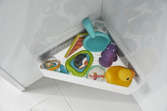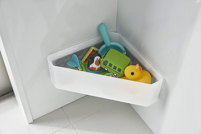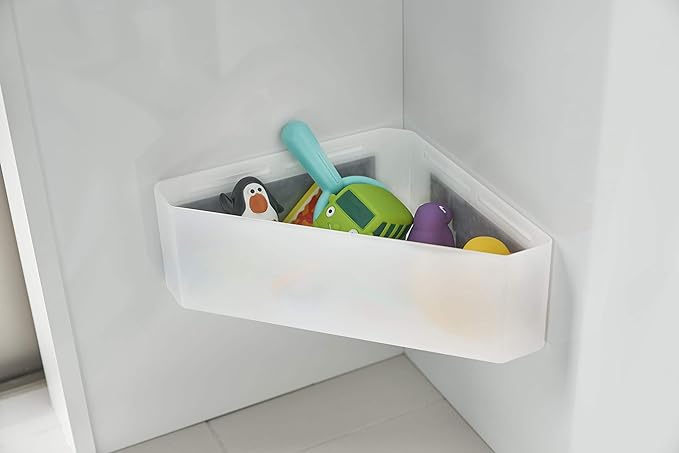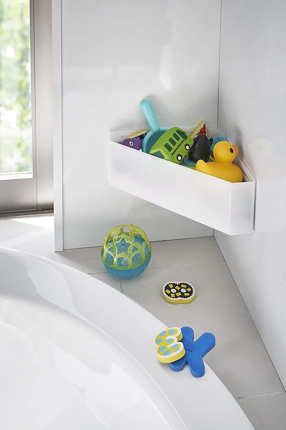 バスルームのコーナーにマグネットで簡単取り付けのおもちゃラック。ディスペンサー・洗顔チューブ・バス小物などの収納にも。水切れもしっかり。