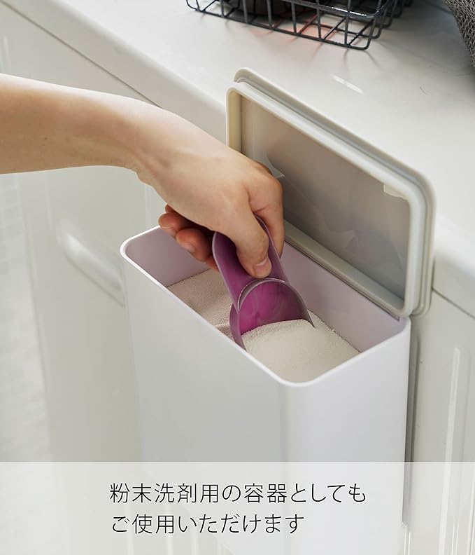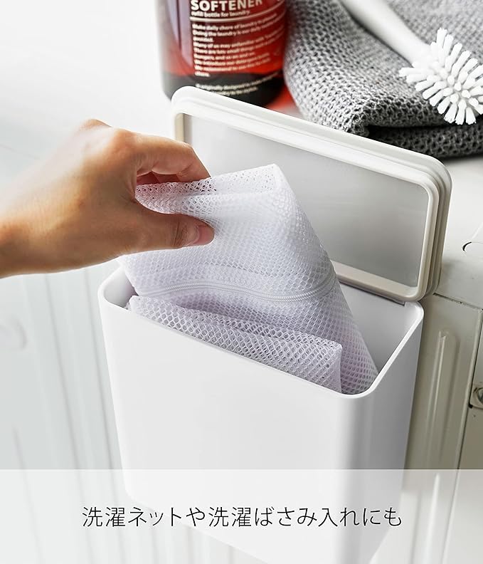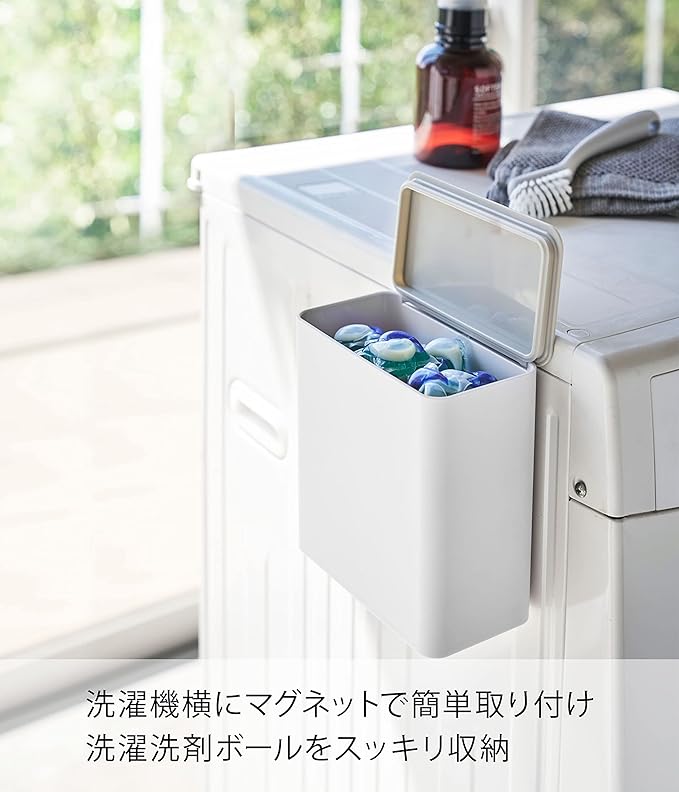 洗濯機横にマグネットで簡単取り付け。洗濯洗剤ボールをスッキリ収納。片手でサッと開けられます。パッキン付きでニオイもガード。洗濯ネットの収納に。洗濯粉末洗剤の容器として。洗濯バサミの収納に。ドラム洗濯機の上に直接置いても使えます。直接置けるのでコットンや綿棒など洗面所で出るゴミを捨てるのに便利。