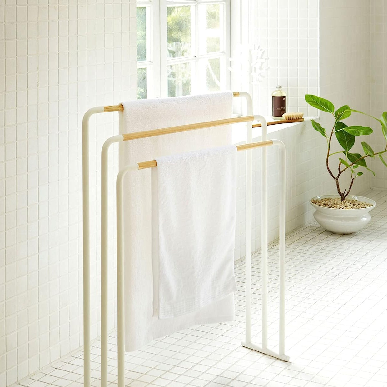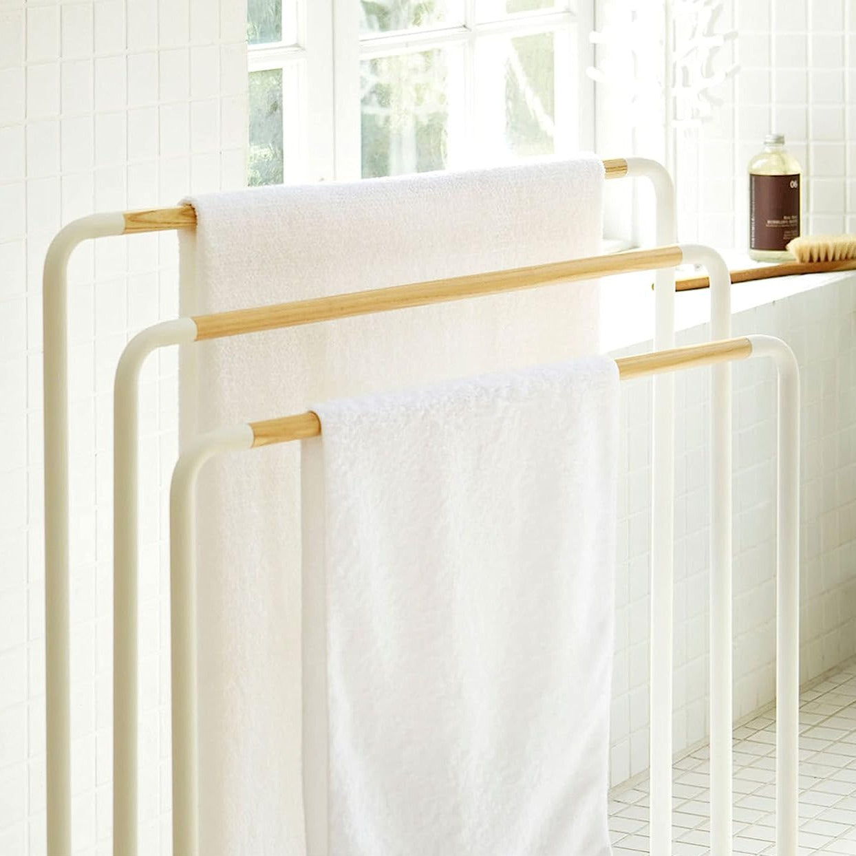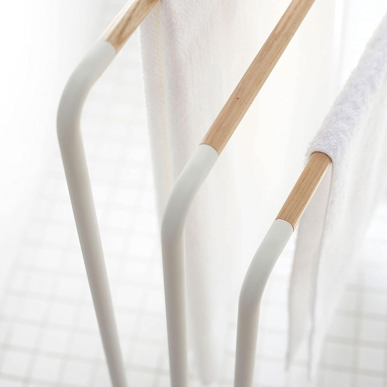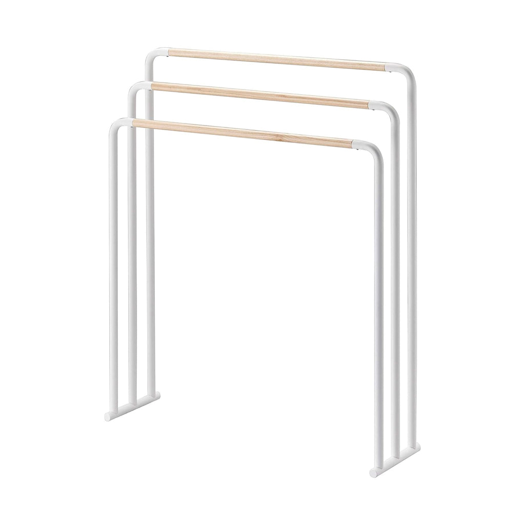 スチールとウッドの組み合わせが上質なバスタオルハンガーです。横からスライドさせてスムーズにバスタオルを掛けられるデザインで、大判サイズのバスタオルも干せます。