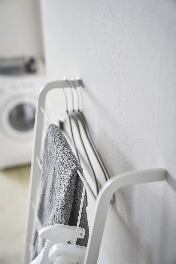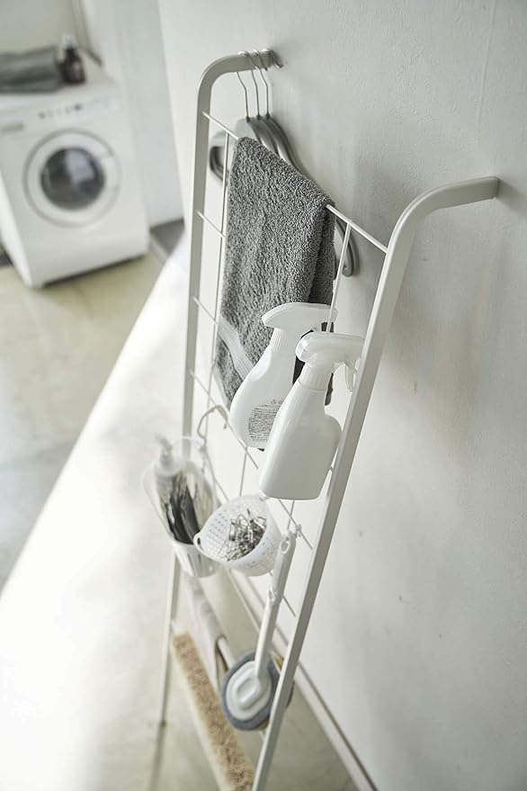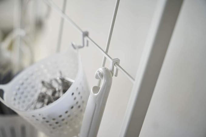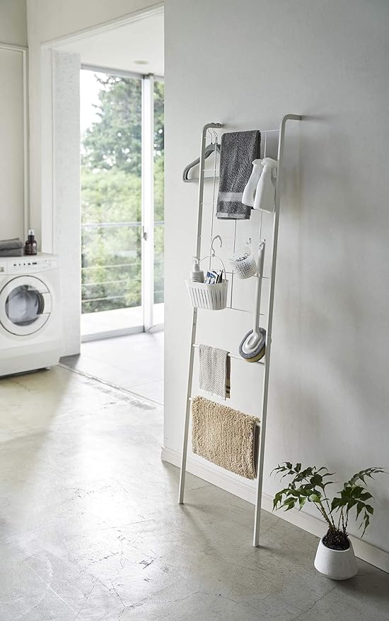 便利なメッシュ構造のランドリーラダーハンガー。メッシュ部分には、お手持ちのフックやハンガーを組み合わせて使用できます。スリムな立て掛け式なので置く場所を選びません。6つのフック付で、ランドリーだけでなく、玄関やベランダなどの整理用品としても使える便利なラダーハンガーです。