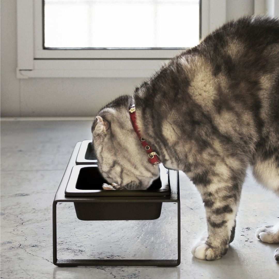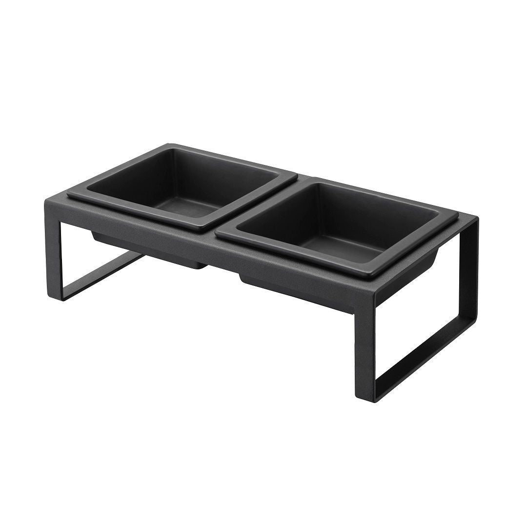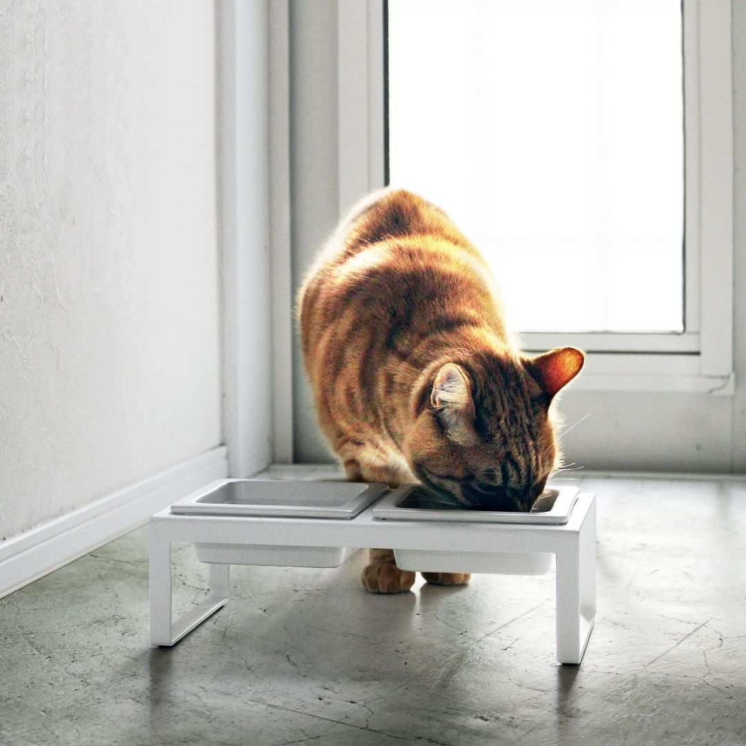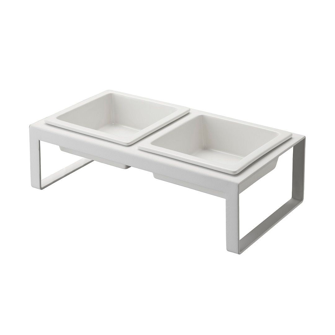 身体の負担が少ない、2つのボウルセット高級感のある陶器製のペット用ボウル2つとスタンドのセットです。各300ml入るボウルとスタンドは自由に取り外しが可能で、使い方も自由自在です。例えばフードとお水を左右に設置して一箇所にまとめたり、異なる種類のフードを分けて置くことができます。1匹だけでなく多頭飼の方にもおすすめです。好みに合わせて選べる、2色のバリエーション カラーは清潔感のあるホワイト、落ち着いた印象を与えるブラックの2色をご用意いたしました。スタイリッシュなデザインなので、どんなテイストのお部屋にもなじみます。置きっぱなしにしても周りのインテリアを邪魔しません。見えるところにあるもの・毎日使うものだから、こだわって選びたい方にぴったりのアイテムです。身体に負担をかけない、丁度いい高さ設計 スタンドの高さは10cmあるため、ペットの首や腰の負担をかけずに楽な姿勢で食事がとれます。高さがある分、床に落ちた毛やゴミが混ざりにくいのも嬉しいポイント。汚れたらサッと洗って拭き取るだけ キズがつきにくい陶器製のボウルと、錆に強い粉体塗装が施されたスチールを組み合わせた素材です。ボウルは簡単に取り外しができるので、食後はサッと洗っていつでも清潔に保てます。キズや錆に強い仕様だから、見た目・衛生的にも長く愛用できます。ストレスなく安心して食事ができる スチールフレームの床との接地面にはキズ防止・滑り止めの緩衝材がついているため、フローリングの床でも傷つけにくいつくりになっています。?本体は1.4kgのしっかりした重さがあるので、食事中にボウルやスタンドがズレたりひっくりかえらず、安心して食事を楽しめるのも魅力です。