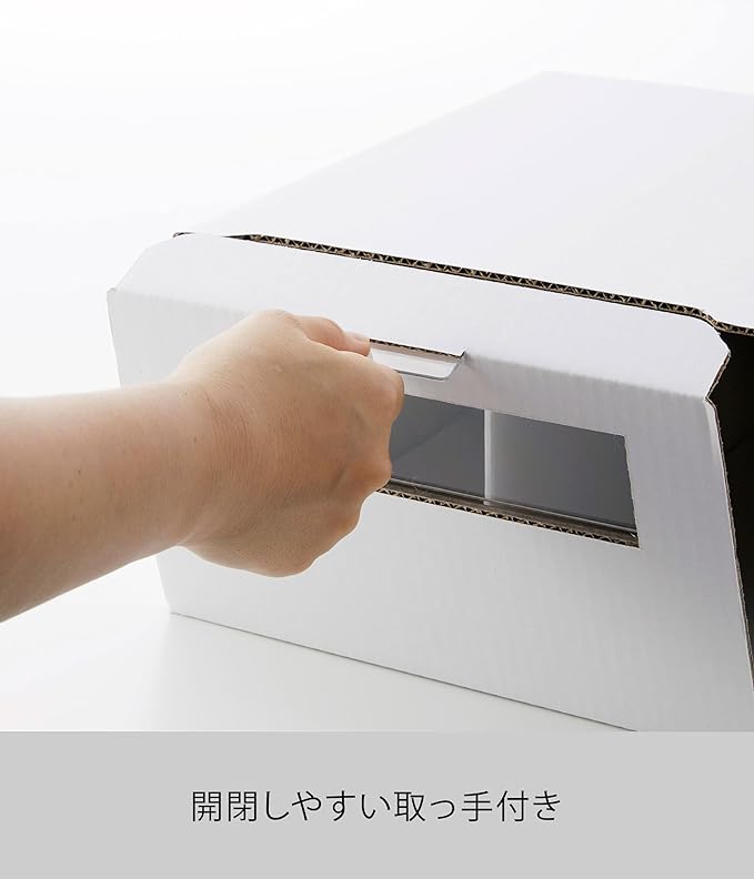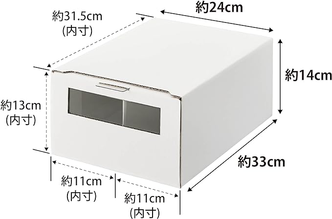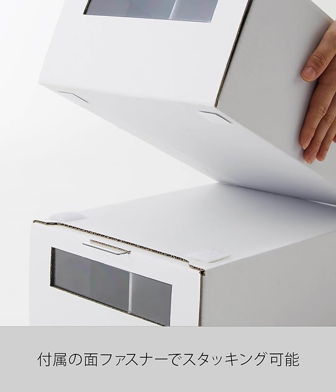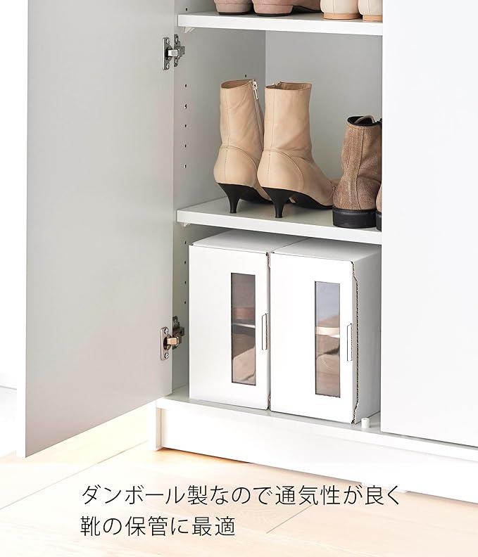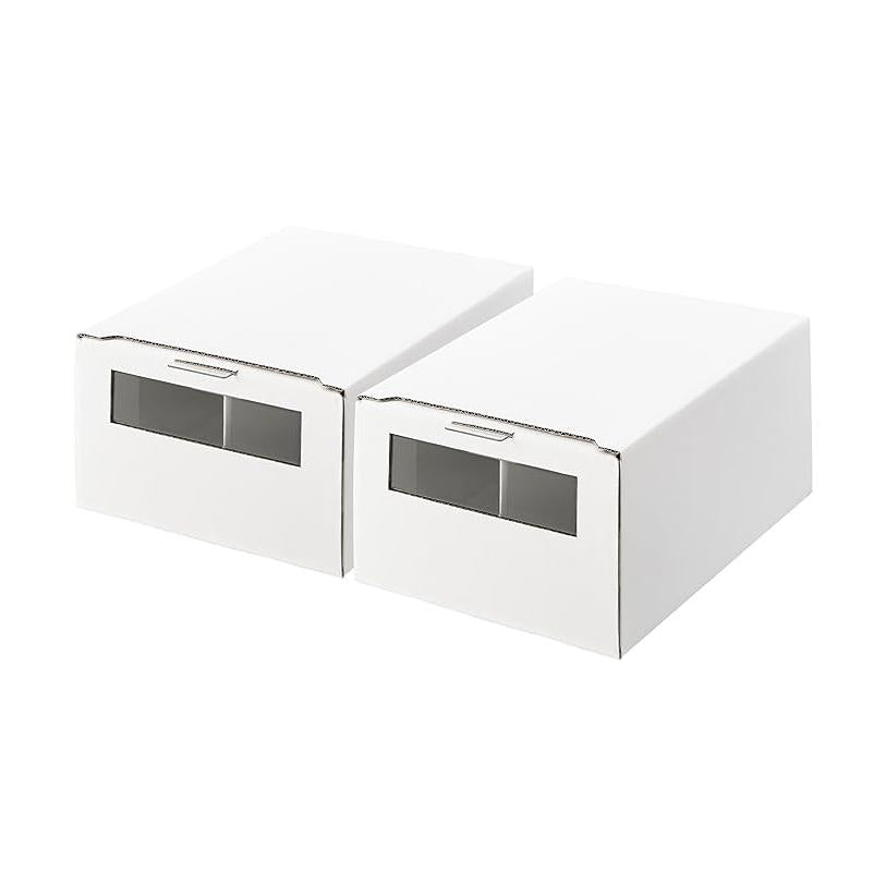 縦でも横でも置く方向を選ばない窓付きシューズボックス。ダンボール製なので、通気性が良く靴の保管に最適です。31.5cmまでのシューズを収納可能。開閉しやすい取っ手付き。付属の面ファスナーでスタッキング可能。