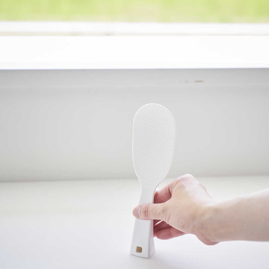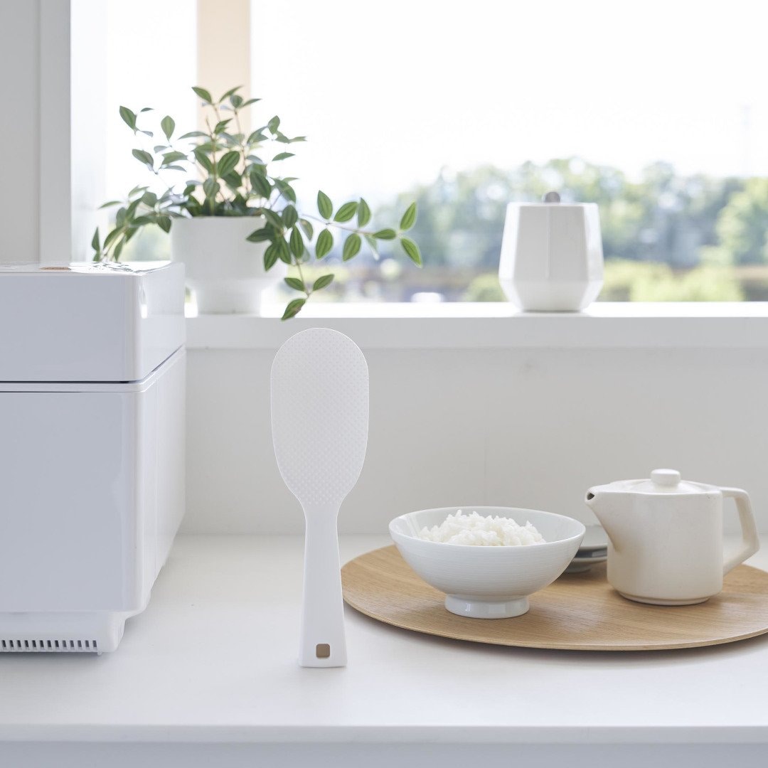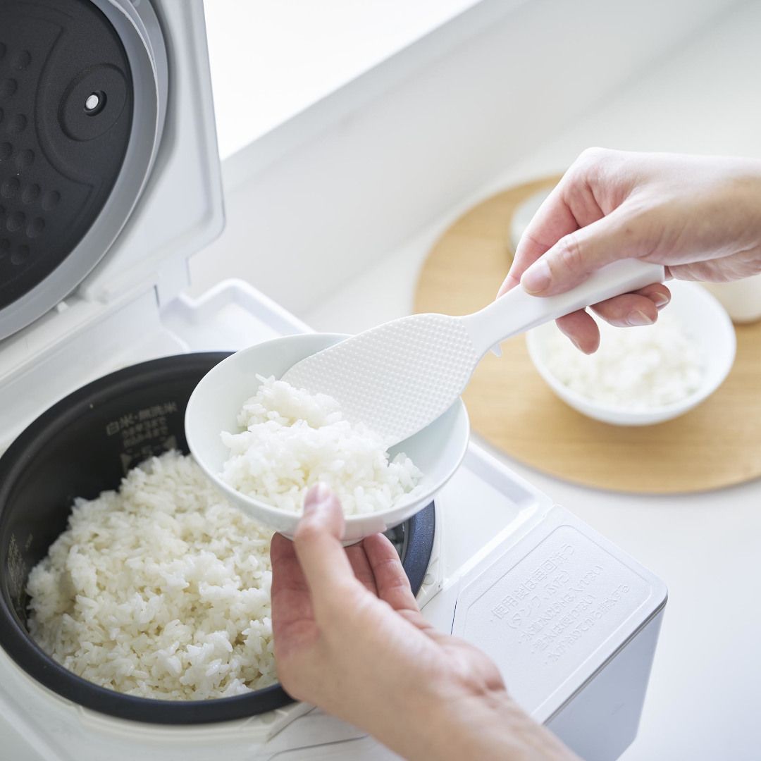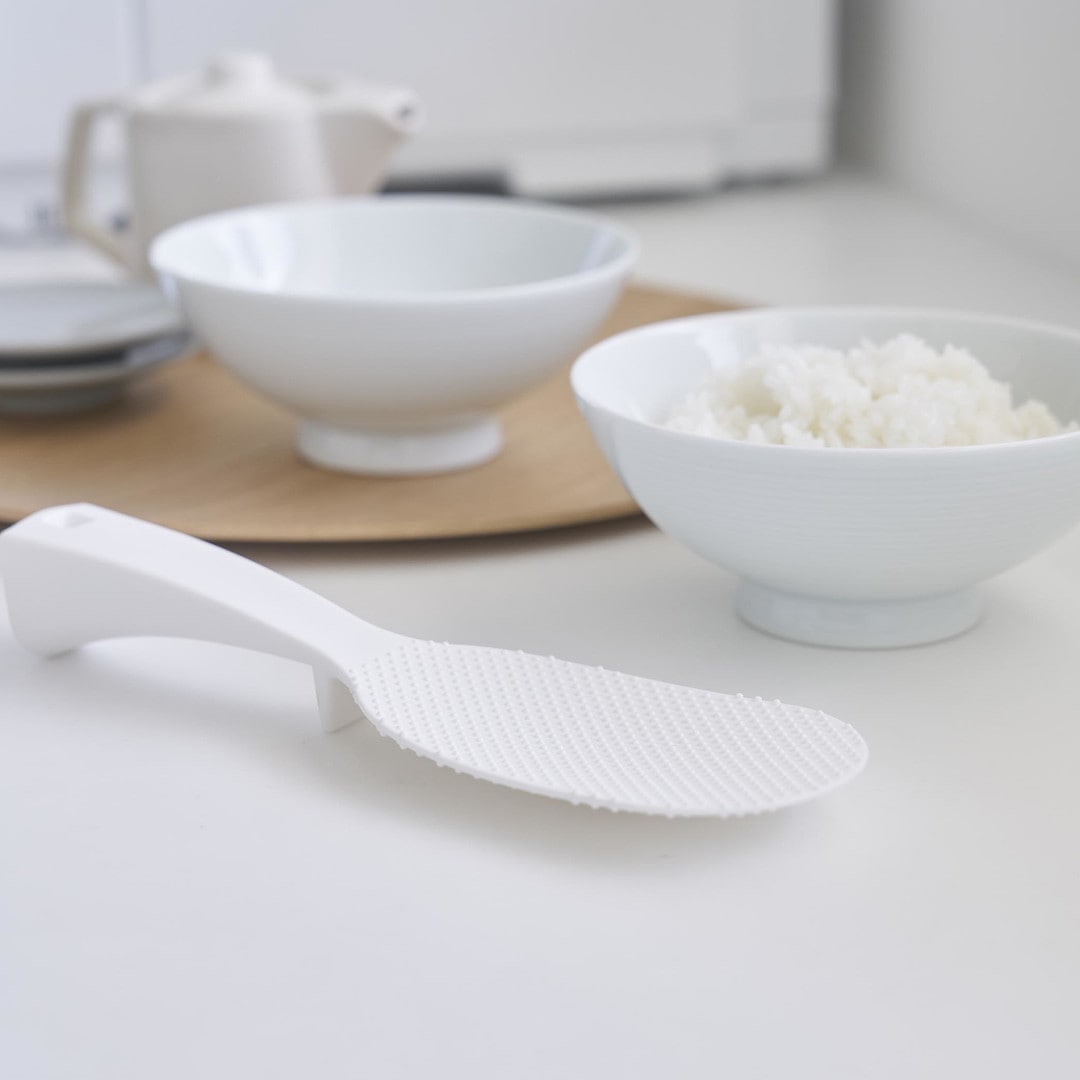 「立てる・寝かせる・掛ける」スリムなしゃもじしゃもじホルダーに入れず、立てて置けるしゃもじです。エンボス加工によりごはん粒がつきにくいから、使うたびに水で濡らさなくてもOK。横にも置けて引っ掛け収納もできる3Way仕様です。キッチンに似合う、2色のカラーバリエーションカラーは、明るい印象のホワイト、スタイリッシュなブラックをご用意しました。白米や炊き込みごはんなど、ご飯が引き立つシンプルなモノトーンカラーです。お持ちの調理ツールやテーブルウェアに合わせてお好みのカラーをお選びください。ホルダー要らずで場所を取らない自立するのでしゃもじホルダーが必要ありません。炊飯器回りが省スペースに収まるうえ洗い物が減るのはうれしいポイント。ハンドルの先端にはフック穴が開いているため吊るして収納ができます。スリムなお弁当箱にご飯を詰めやすいしゃもじの表面にはご飯がつきにくいようエンボス加工が施されています。幅が狭いのでスリムタイプのお弁当箱にご飯を詰めるときにも活躍。二合炊きなどコンパクトな炊飯器にも小回りが利いて使いやすいです。先端が浮くから寝かして置けるハンドルは太くて持ちやすく安定して立たせておけます。ハンドル裏の突起により、しゃもじを寝かせて置いても先端部分が浮く設計に。ご飯に触れる部分が直置きにならないので衛生面も◎
