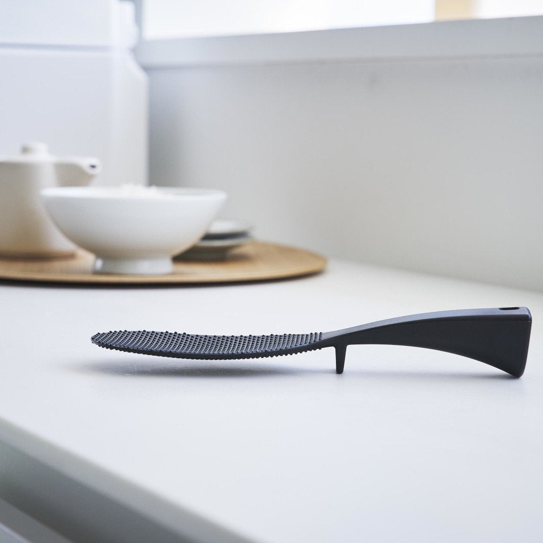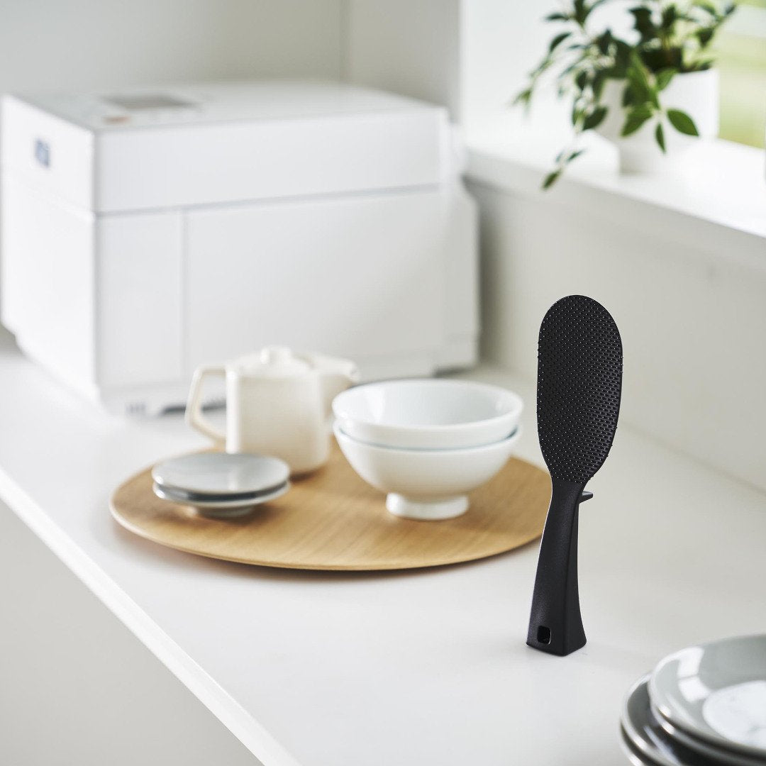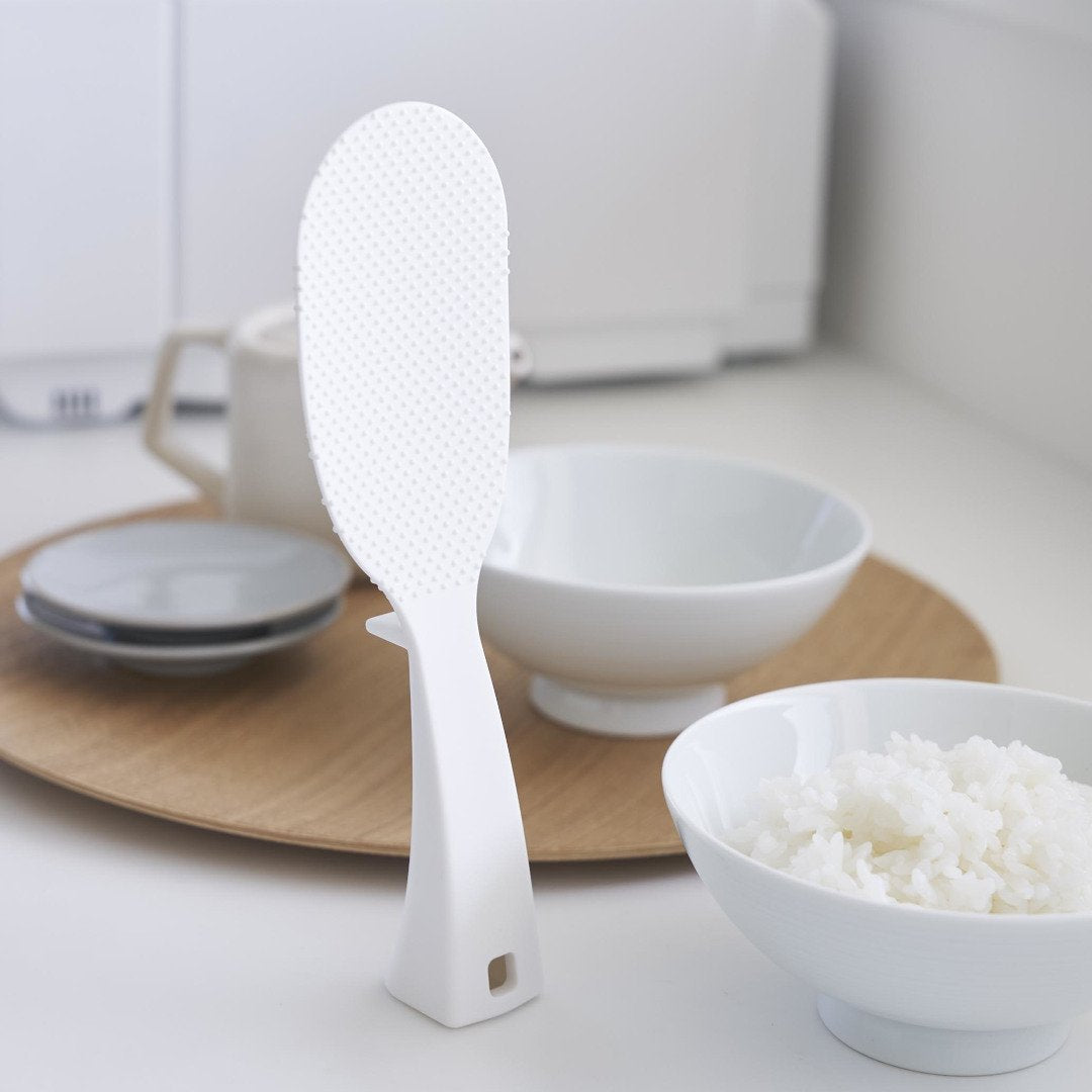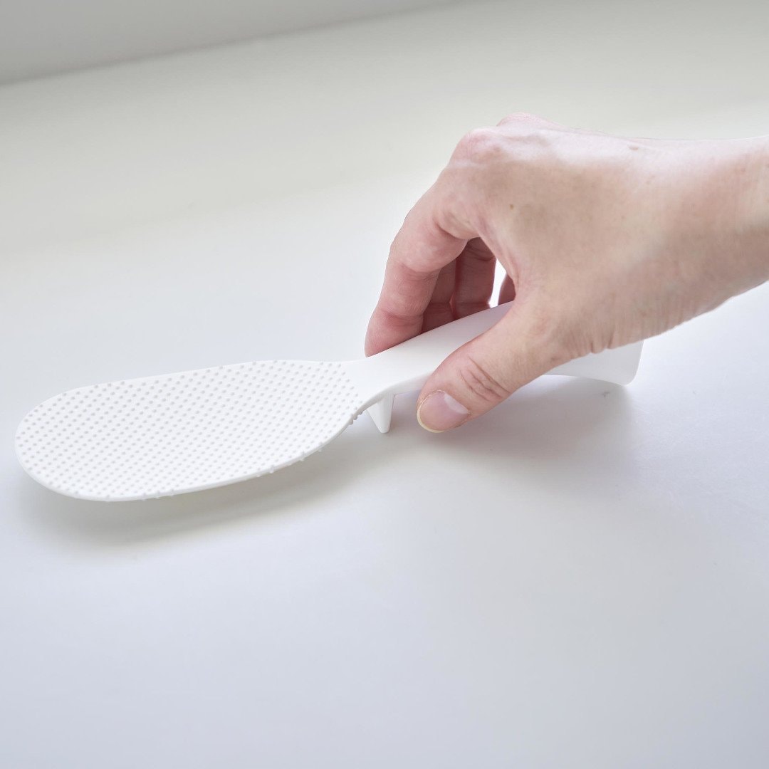 「立てる・寝かせる・掛ける」スリムなしゃもじしゃもじホルダーに入れず、立てて置けるしゃもじです。エンボス加工によりごはん粒がつきにくいから、使うたびに水で濡らさなくてもOK。横にも置けて引っ掛け収納もできる3Way仕様です。キッチンに似合う、2色のカラーバリエーションカラーは、明るい印象のホワイト、スタイリッシュなブラックをご用意しました。白米や炊き込みごはんなど、ご飯が引き立つシンプルなモノトーンカラーです。お持ちの調理ツールやテーブルウェアに合わせてお好みのカラーをお選びください。ホルダー要らずで場所を取らない自立するのでしゃもじホルダーが必要ありません。炊飯器回りが省スペースに収まるうえ洗い物が減るのはうれしいポイント。ハンドルの先端にはフック穴が開いているため吊るして収納ができます。スリムなお弁当箱にご飯を詰めやすいしゃもじの表面にはご飯がつきにくいようエンボス加工が施されています。幅が狭いのでスリムタイプのお弁当箱にご飯を詰めるときにも活躍。二合炊きなどコンパクトな炊飯器にも小回りが利いて使いやすいです。先端が浮くから寝かして置けるハンドルは太くて持ちやすく安定して立たせておけます。ハンドル裏の突起により、しゃもじを寝かせて置いても先端部分が浮く設計に。ご飯に触れる部分が直置きにならないので衛生面も◎