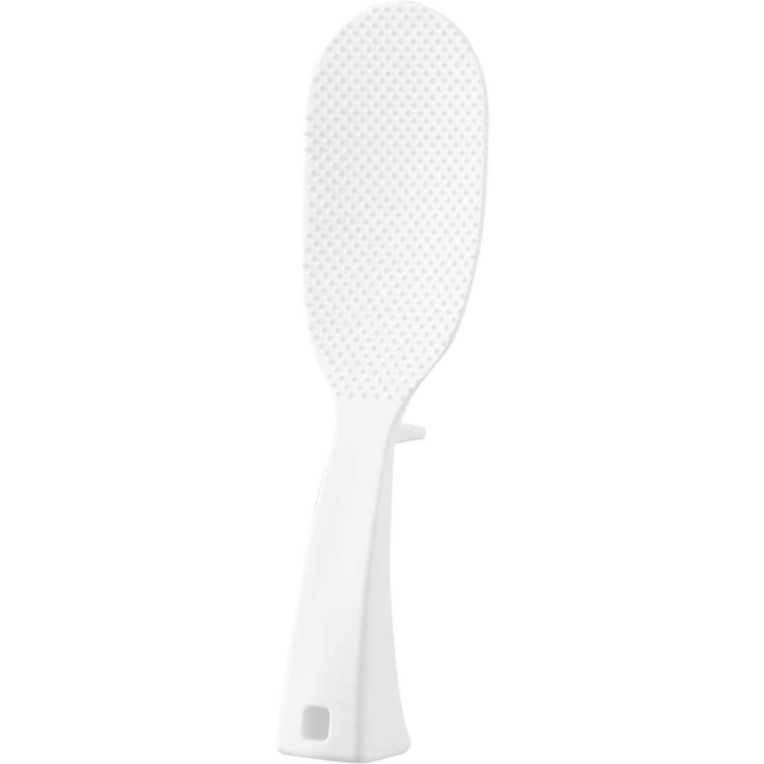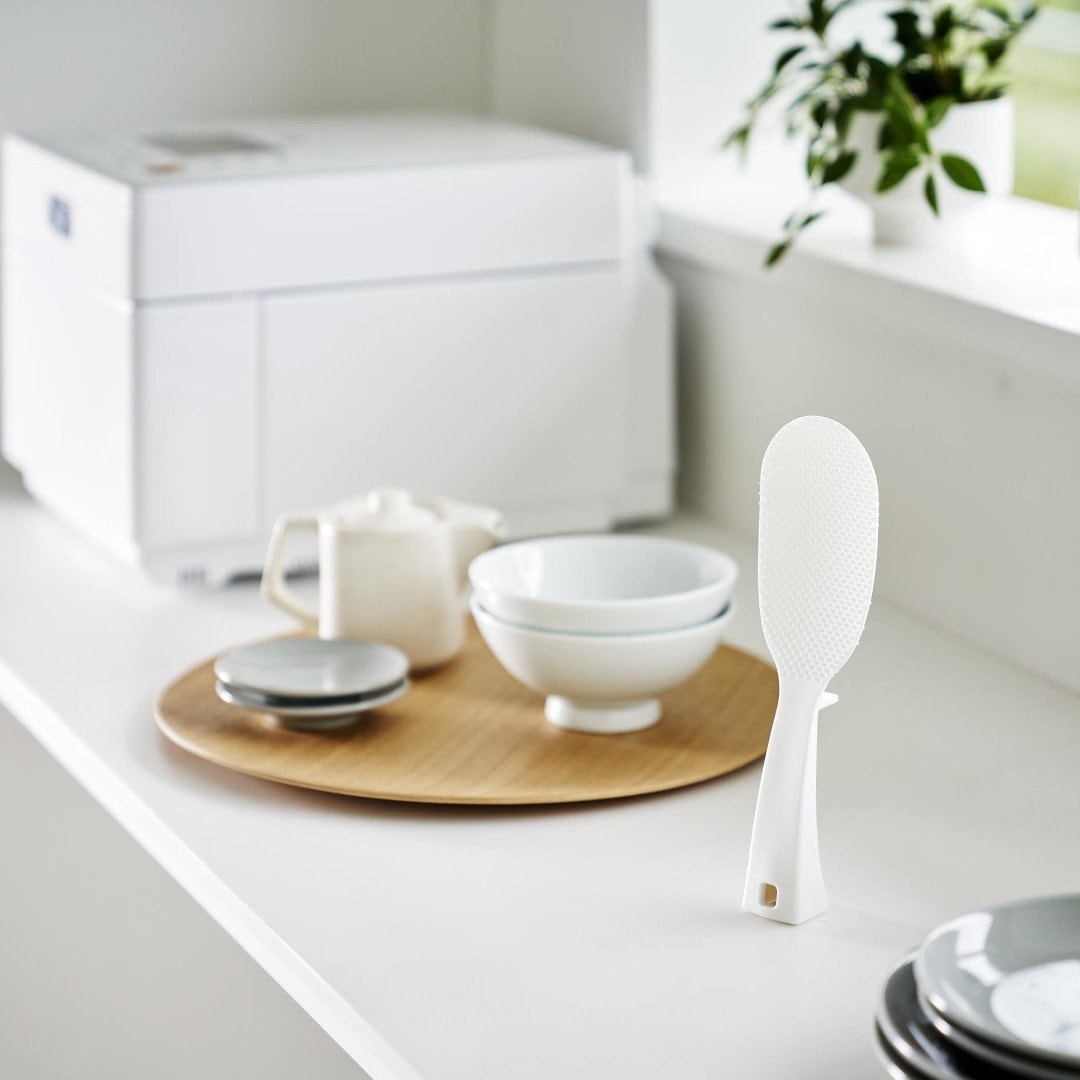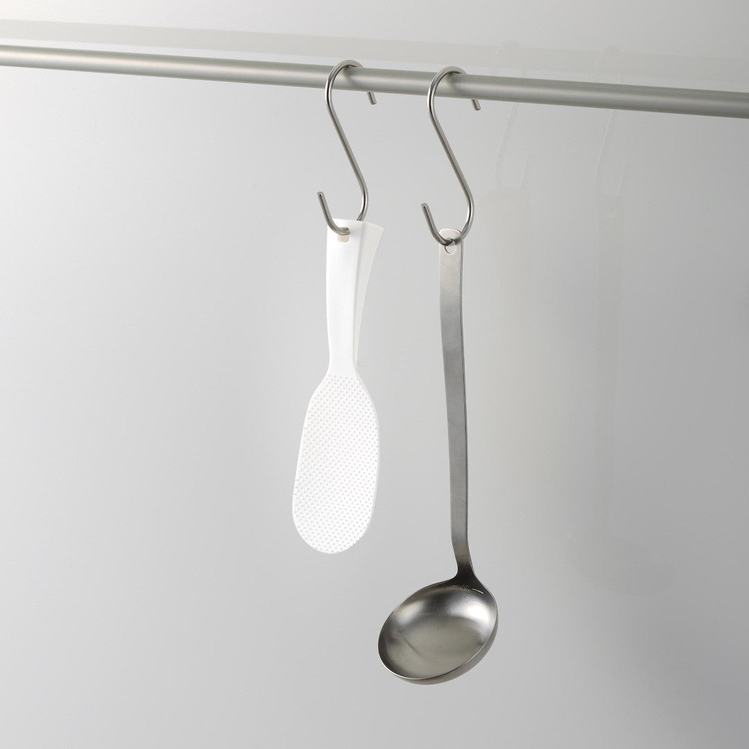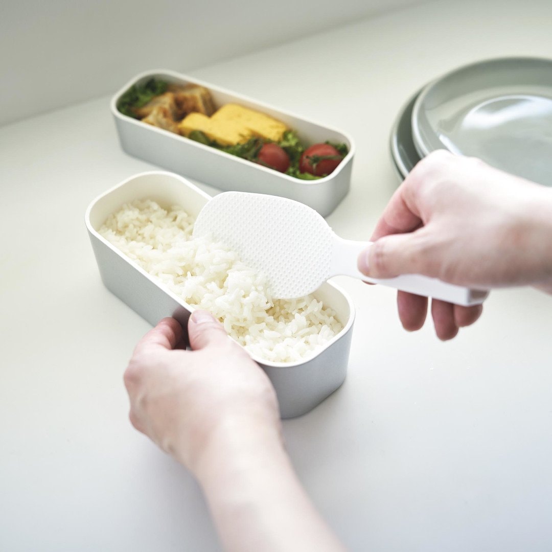 「立てる・寝かせる・掛ける」スリムなしゃもじしゃもじホルダーに入れず、立てて置けるしゃもじです。エンボス加工によりごはん粒がつきにくいから、使うたびに水で濡らさなくてもOK。横にも置けて引っ掛け収納もできる3Way仕様です。キッチンに似合う、2色のカラーバリエーションカラーは、明るい印象のホワイト、スタイリッシュなブラックをご用意しました。白米や炊き込みごはんなど、ご飯が引き立つシンプルなモノトーンカラーです。お持ちの調理ツールやテーブルウェアに合わせてお好みのカラーをお選びください。ホルダー要らずで場所を取らない自立するのでしゃもじホルダーが必要ありません。炊飯器回りが省スペースに収まるうえ洗い物が減るのはうれしいポイント。ハンドルの先端にはフック穴が開いているため吊るして収納ができます。スリムなお弁当箱にご飯を詰めやすいしゃもじの表面にはご飯がつきにくいようエンボス加工が施されています。幅が狭いのでスリムタイプのお弁当箱にご飯を詰めるときにも活躍。二合炊きなどコンパクトな炊飯器にも小回りが利いて使いやすいです。先端が浮くから寝かして置けるハンドルは太くて持ちやすく安定して立たせておけます。ハンドル裏の突起により、しゃもじを寝かせて置いても先端部分が浮く設計に。ご飯に触れる部分が直置きにならないので衛生面も◎