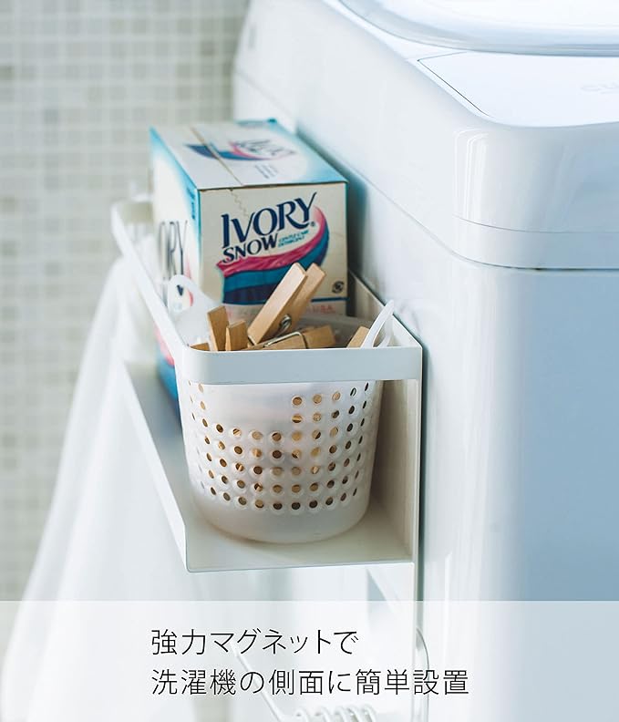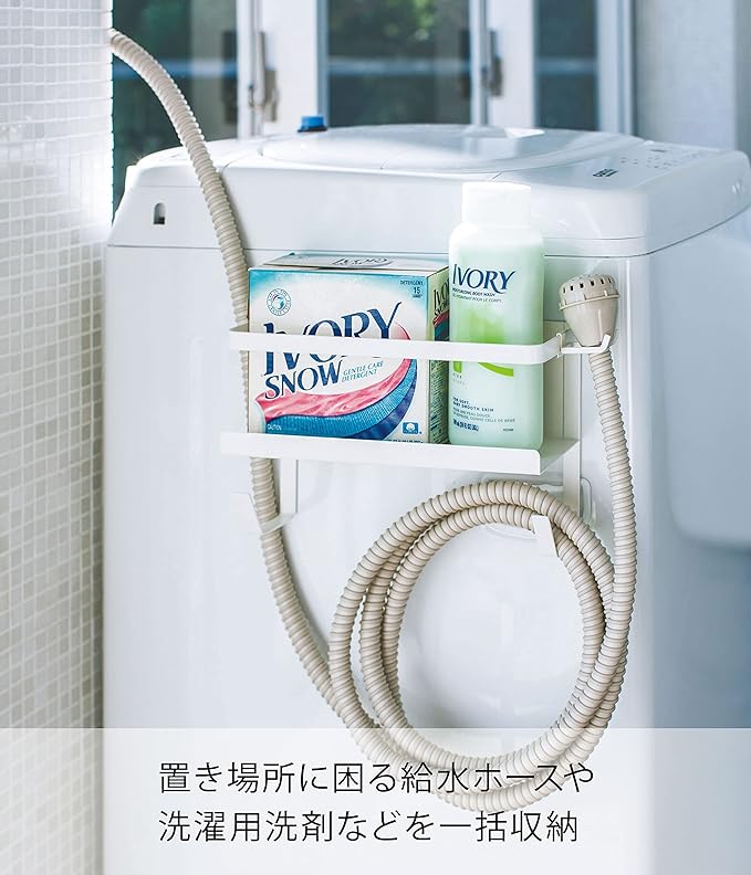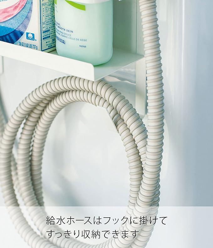 強力マグネットで洗濯機の側面に簡単取り付け。置き場所に困る給水ホースや洗濯用洗剤、小物などを洗濯機の側面に一括収納。