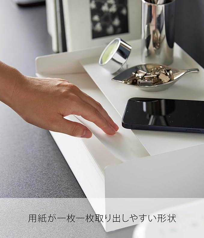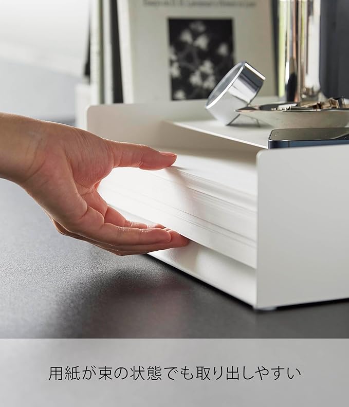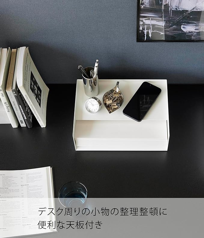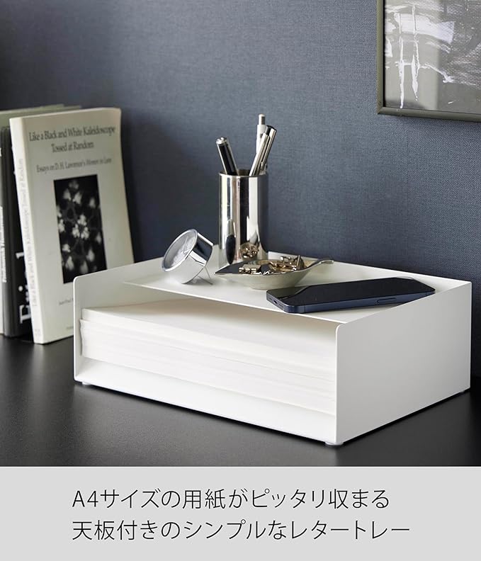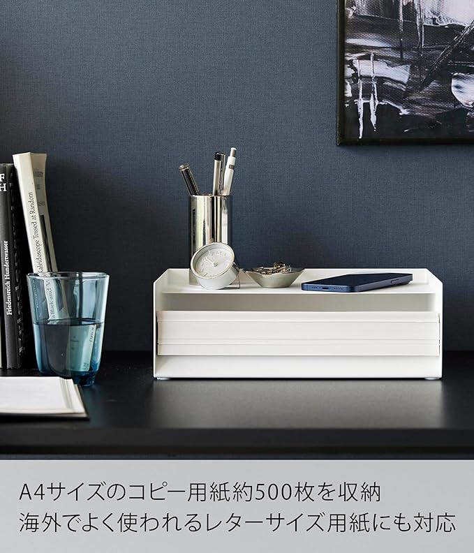 A4用紙がすっぽり収納する天板付きレタートレー A4サイズのコピー用紙を500枚そのまま収納できる、天板付きレタートレーです。一枚一枚新しい用紙を取って書く際はもちろん、回覧や封筒、ハガキなどを整理・分類するのにも便利なアイテムです。シーンを選ばないシンプルなデザイン レタートレーのカラーは、ホワイトとブラックの2色から好みでお選びいただけます。モノトーンカラーとシンプルなデザインだから、ご家庭はもちろん、オフィスでの使用にも最適です。たっぷり入れても取り出しスムーズ A4サイズのコピー用紙を500枚入れてもスペースに余裕があるから、用紙一枚でもスムーズに取り出せます。海外でよく使われるレターサイズの用紙も収納可能です。奥行きが狭いデスクでの使用もおすすめの横型 A4用紙は横に入れるタイプなので、机の空間を広く使えて作業スペースも確保しやすくなります。ファイルの収納はラベルや背表紙が見やすく、作業効率アップにもつながります。自分好みの小物が置ける天板 トレーの上部はデスク周りの小物類が置けます。よく使うメガネやスマートフォン、付箋、筆記用具を置くことで作業中にサッと取り出せます。写真やフィギュアなどお気に入りのアイテムを置けば、ストレス緩和や癒しにも。