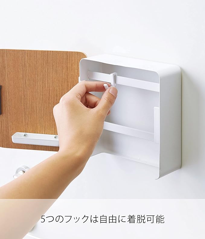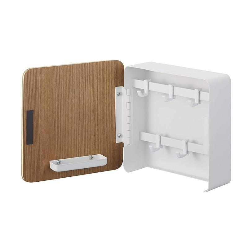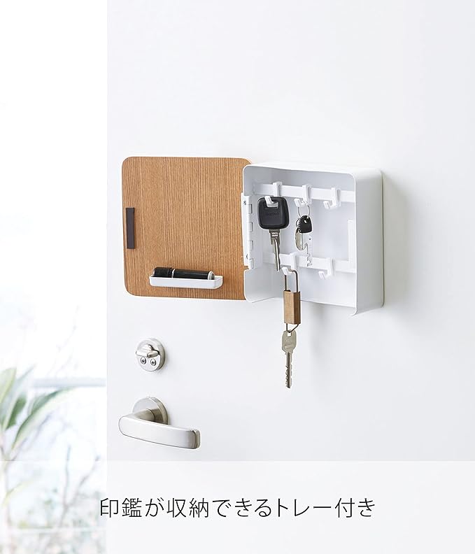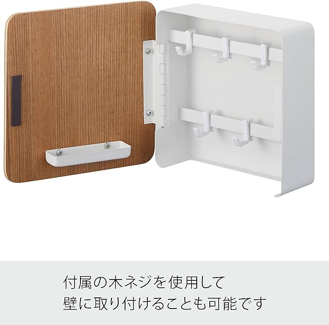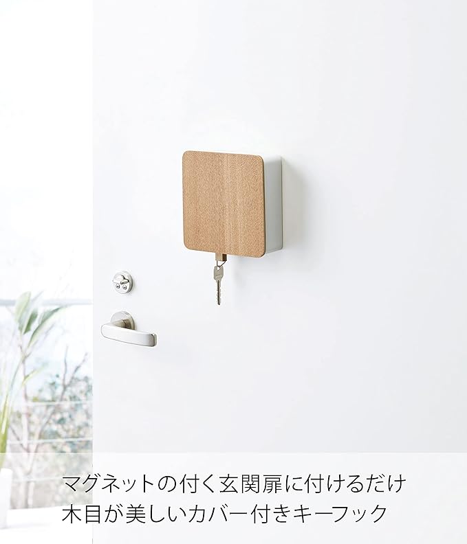 マグネットの付く玄関扉に付けるだけ。インテリアに合う木目の扉付きで鍵が隠せる。5つのフックを自由に脱着可能。便利な2段式の鍵収納。