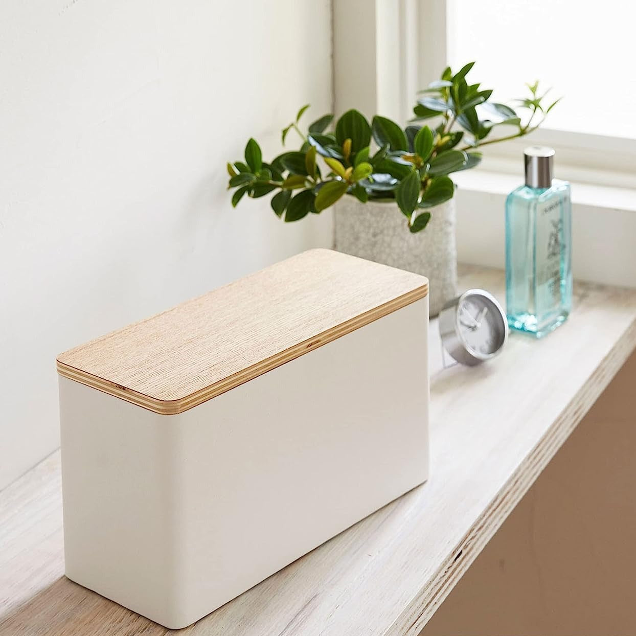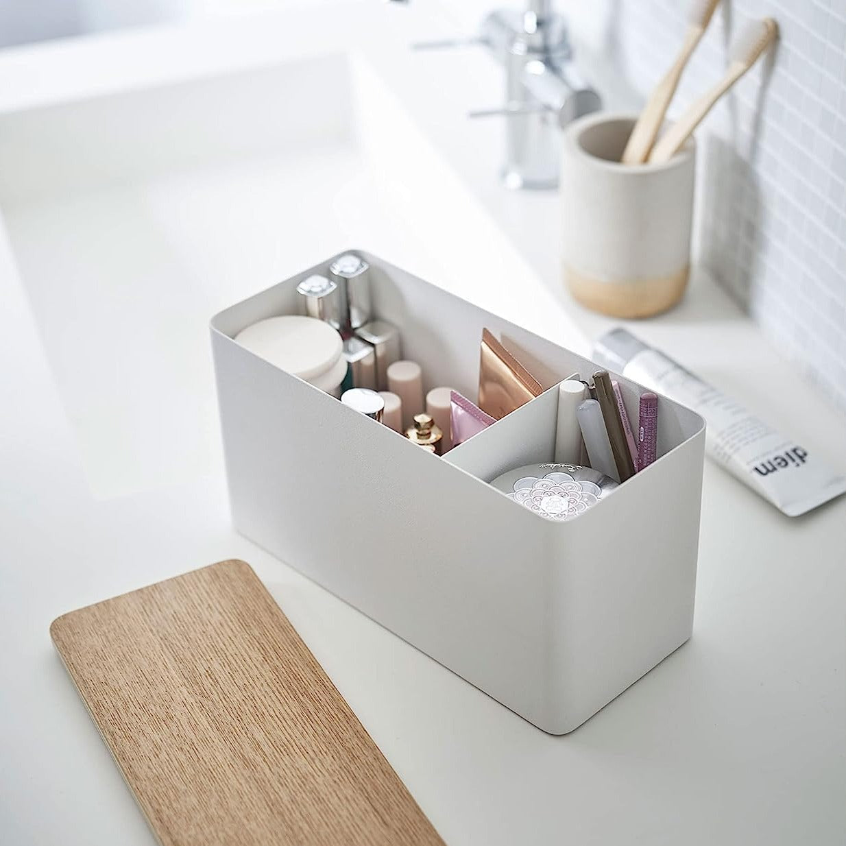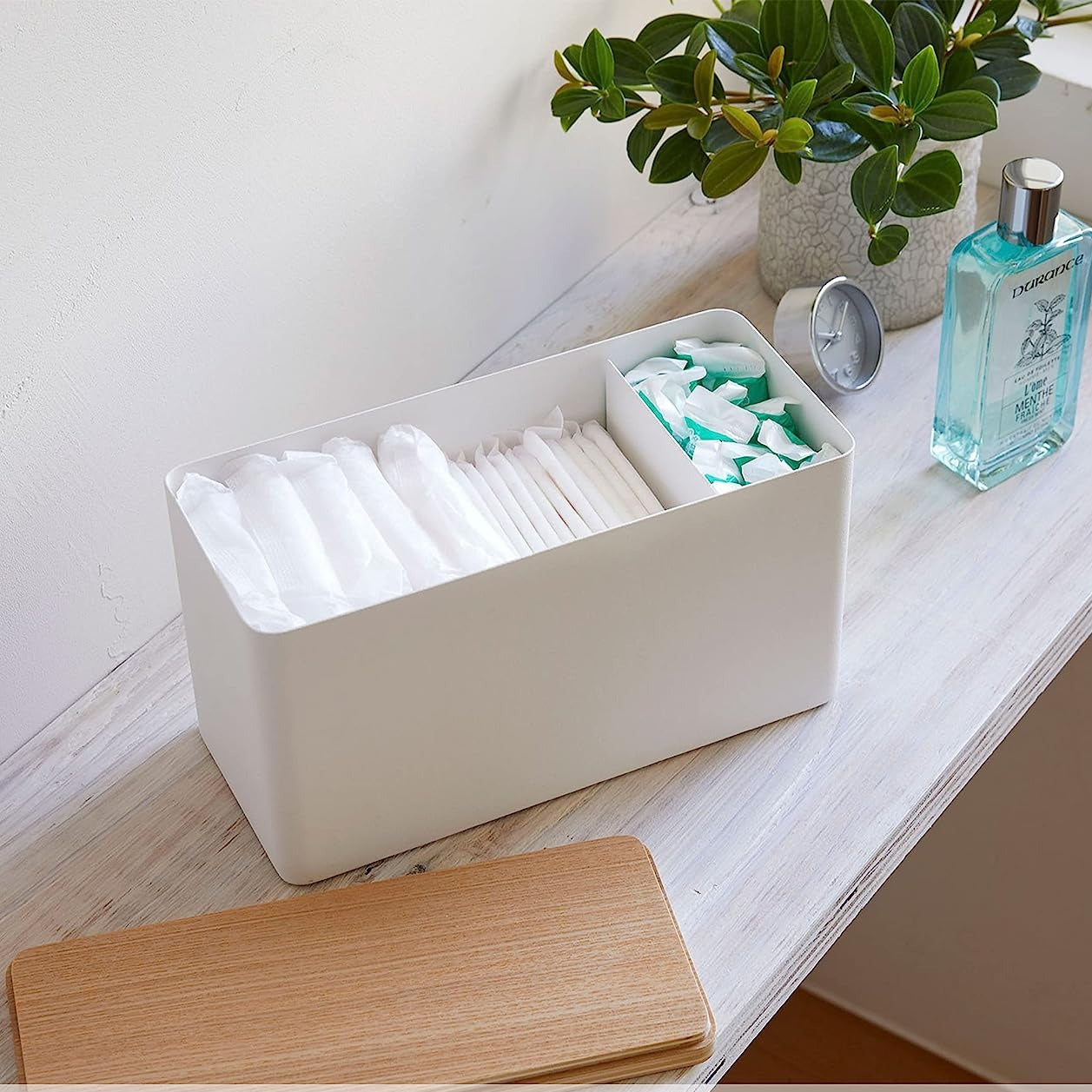 スチールと木の組み合わせが上質なサニタリー収納ケースです。生理用品はもちろん、トイレ小物やゴミ袋などサニタリールームで散らかりがちな小物を一括収納できます。また、容量が大きいのでコスメケースとしても利用可能です。