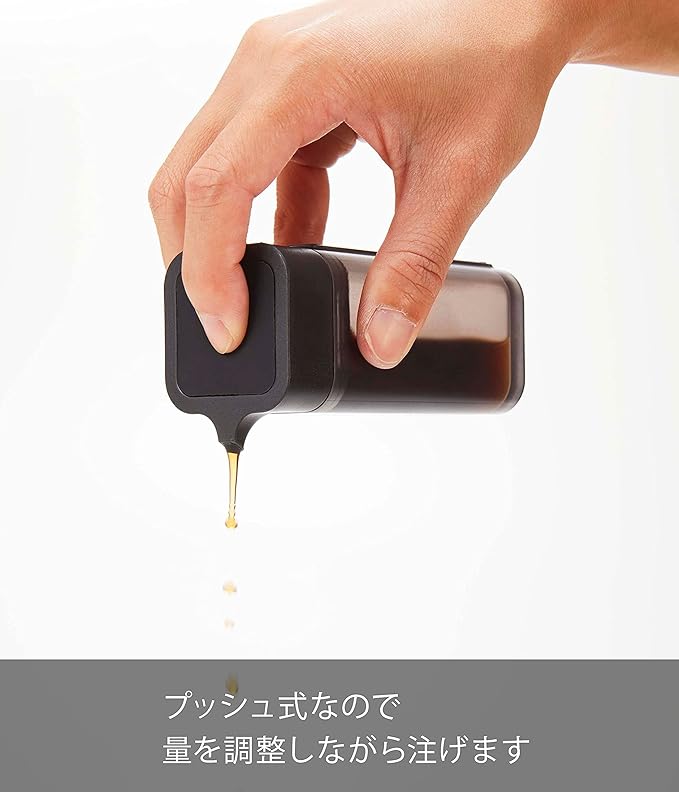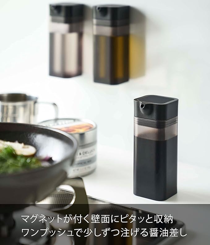 マグネットが付く冷蔵庫やパネルに簡単取り付けの調味料容器シリーズ。ワンプッシュで少しずつ注げる醤油差し。