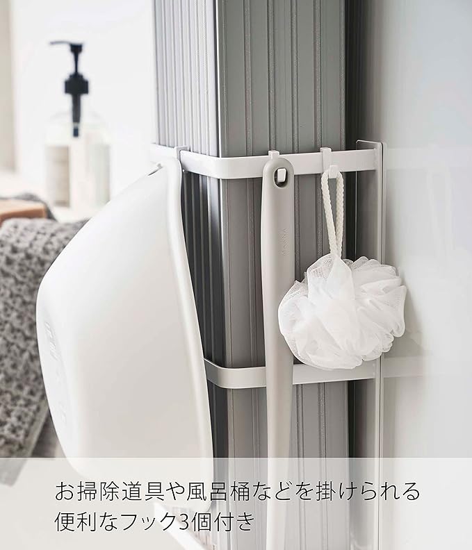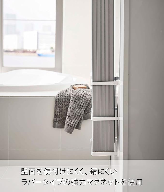 置き場所に困る風呂蓋を壁面にマグネットでスリムに収納。マグネットが付く浴室壁面に簡単取り付け。壁面を傷付けにくく、錆びないラバータイプのマグネット。シャッター式タイプも収納可能。お掃除道具や風呂桶などを掛けておくのに便利なフック3個付き。水切れの良いトレー構造。