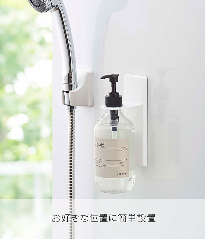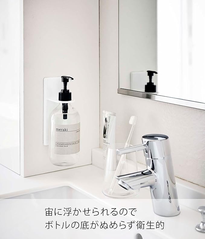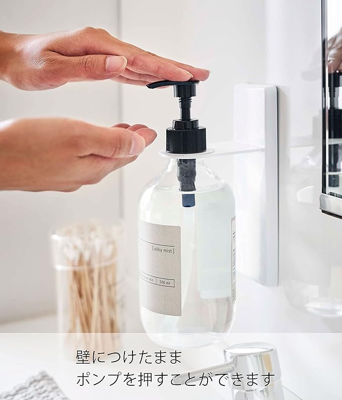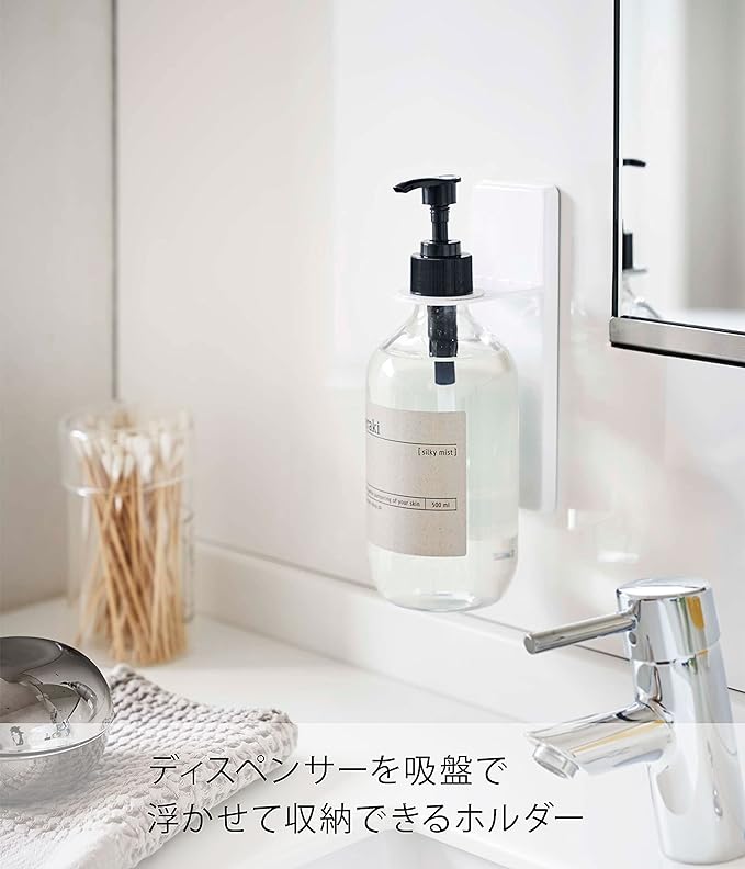 吸盤で洗面所壁面に簡単取り付けのディスペンサーホルダー。宙に浮かせるからボトルの底がぬめらず衛生的。そのままポンプを押して液体を出すことができます。付属の木ネジで壁面にも取り付け可能。浮かせたままポンプを押して液体を出すことができます。