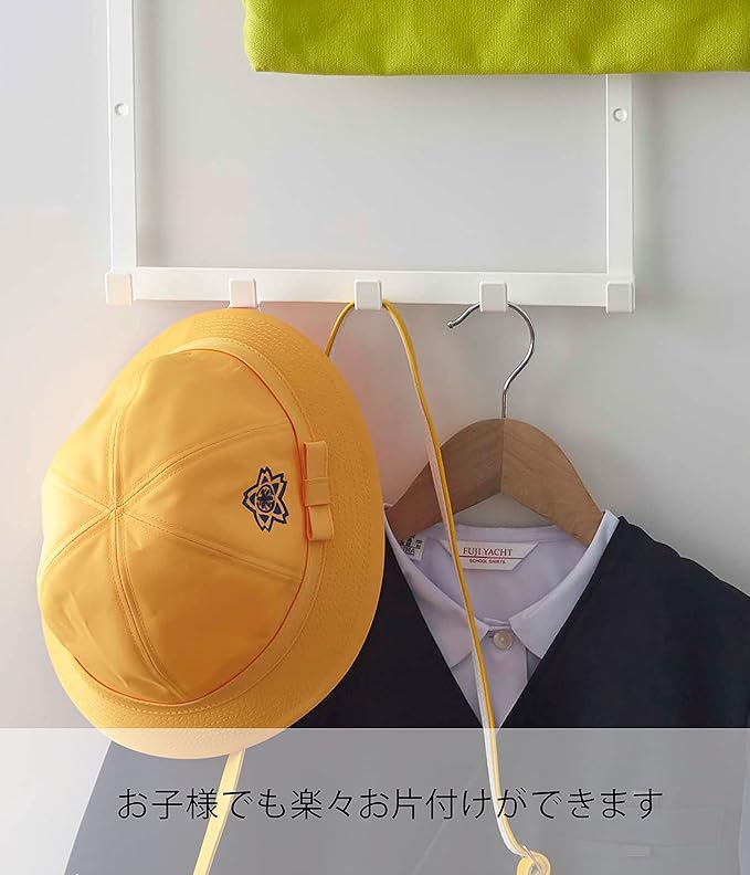 用途に合わせて子供から大人まで使えるドアハンガー。フックの高さが約46cm・56cm・66cmまで3段階に調節できるから、子どもがラクラクお片付けできます。クローゼットの折れ戸にも。