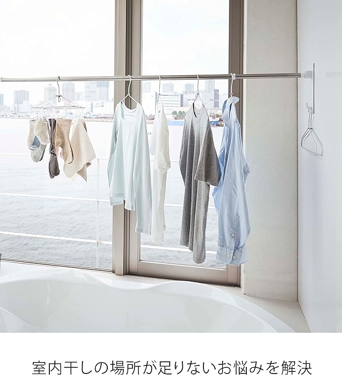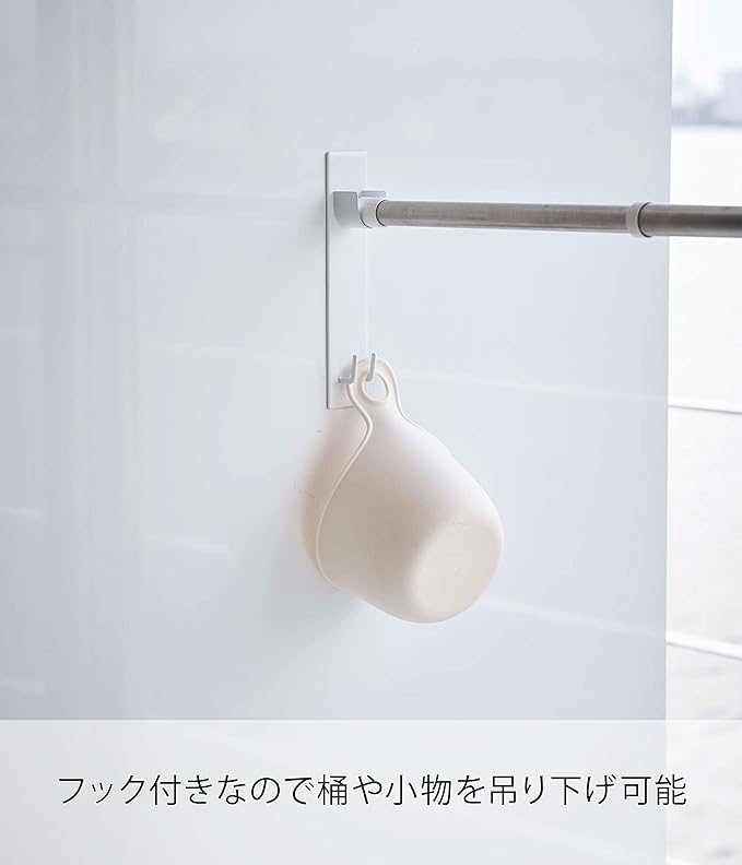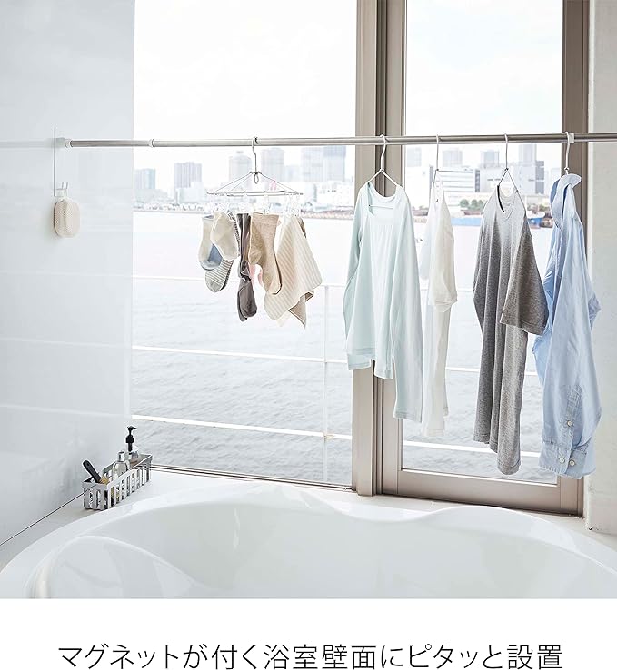 マグネットが付く浴室壁面に簡単取り付けの物干し竿ホルダー。洗濯物が多くて室内干しが足りない。というお悩みを解決。浴室の好きな位置に簡単取り付けできる便利なフック付きの物干し竿ホルダー。