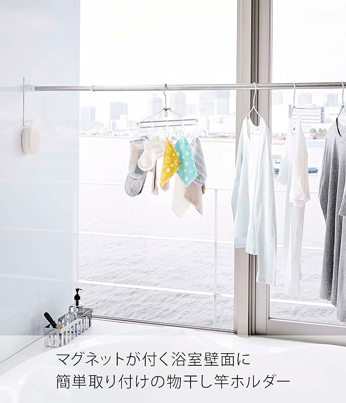 マグネットが付く浴室壁面に簡単取り付けの物干し竿ホルダー。洗濯物が多くて室内物干しが足りない。というお悩みを解決。浴室の好な位置に簡単取り付けできる便利なフック付きの物干し竿ホルダー。