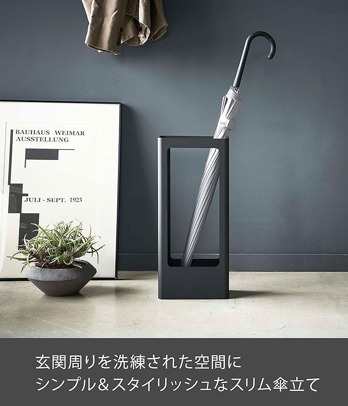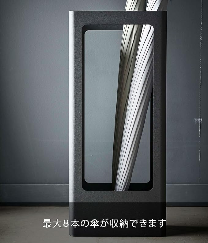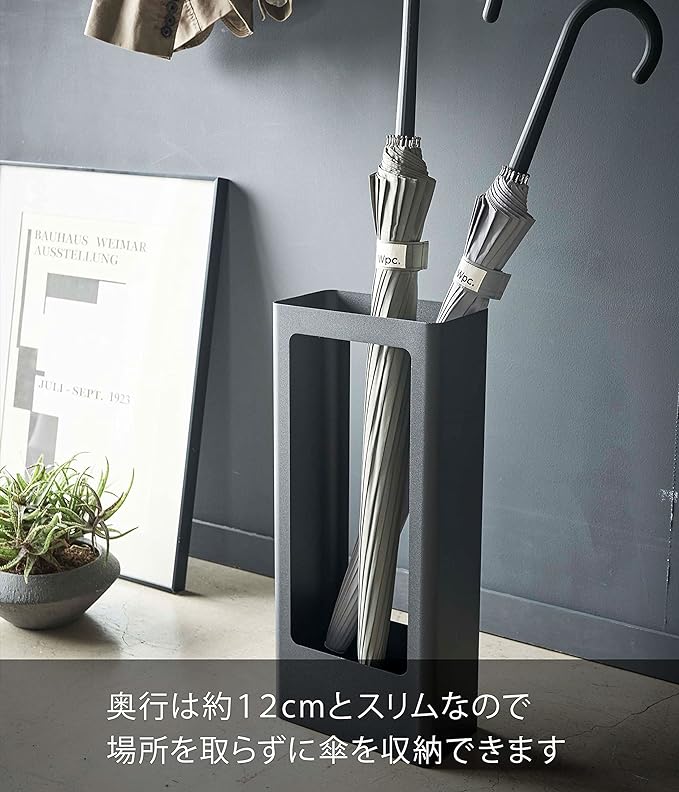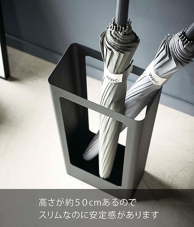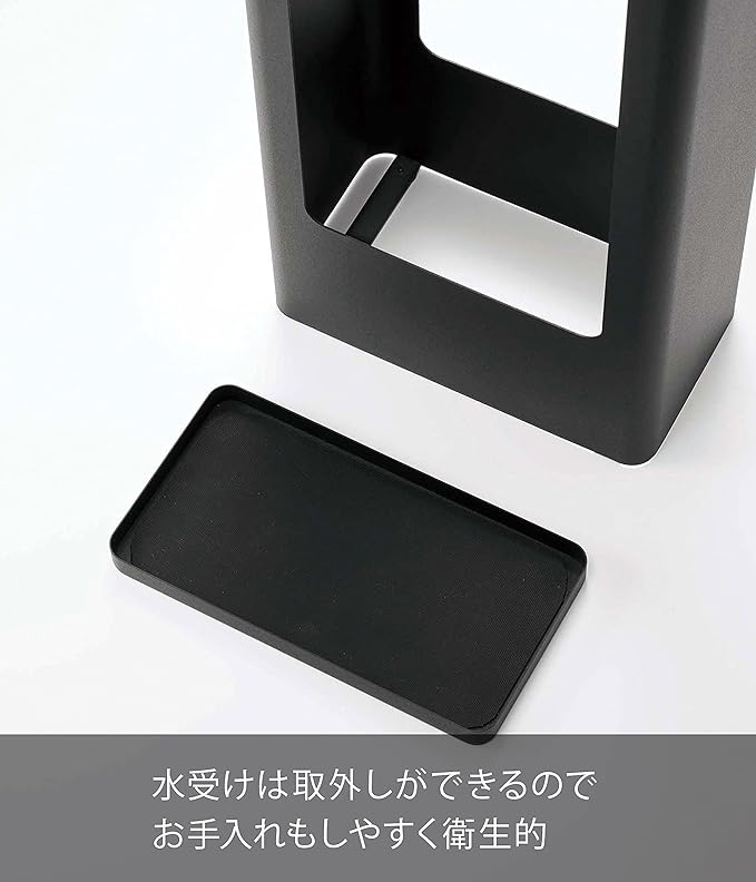 水受け皿が外せる、シンプルでスタイリッシュなスリム傘立て。スチール製で丈夫な傘立て。高さ50cmあるので傘収納時に安定感があります。