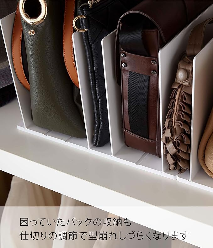 バックをサイズや種類に合わせてスッキリ整頓。バックのサイズや種類に合わせて仕切り幅は調整できます。場所を取らずスリムに収納できます。