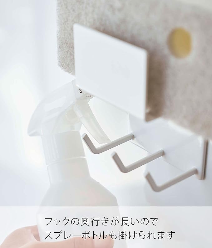 強力マグネットでお風呂の壁面に取り付けるだけ。スポンジ・掃除ブラシ・スプレーボトルを一括収納。スポンジは置くだけの簡単収納。スプレーボトルが掛けられる奥行きの長いフック。
