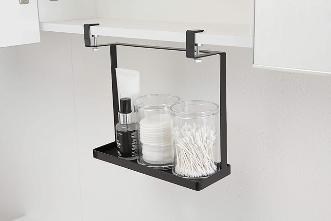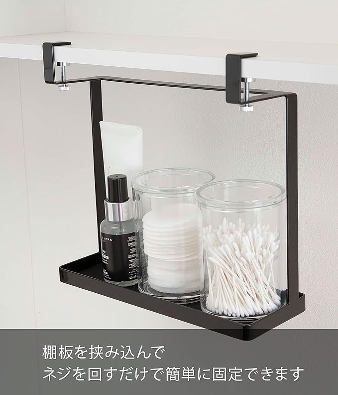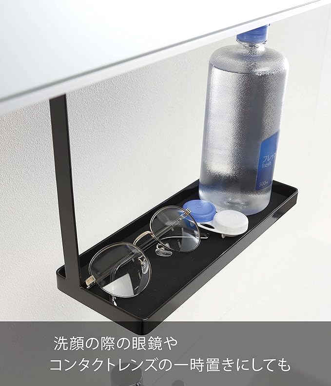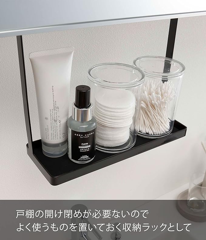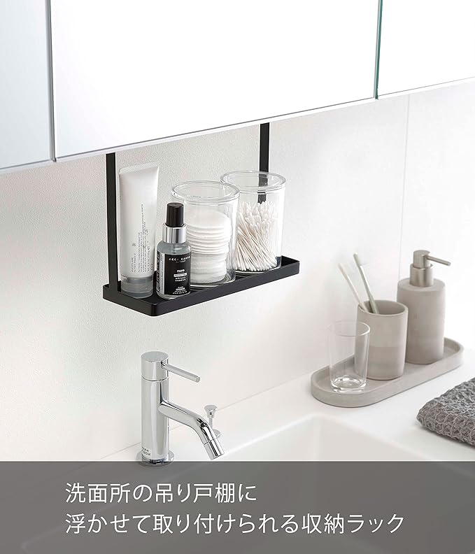 洗面所の吊り戸棚に浮かせて取り付けられる収納ラック。洗面台に浮かせてスッキリ整頓。洗顔の際の眼鏡やコンタクトの一時置きにも便利。シリコーンのマットが敷いてあるから置くものを傷めません。調整ネジでしっかり洗面戸棚に固定。
